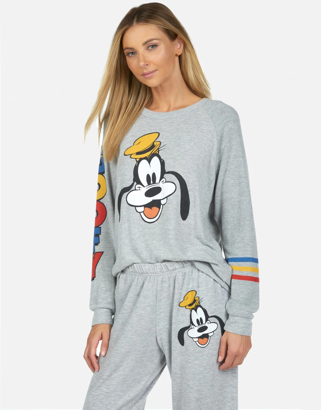 Goofy Printed on Ultra Soft Lightweight Raglan Pullover in Heather Grey by Lauren Moshi.