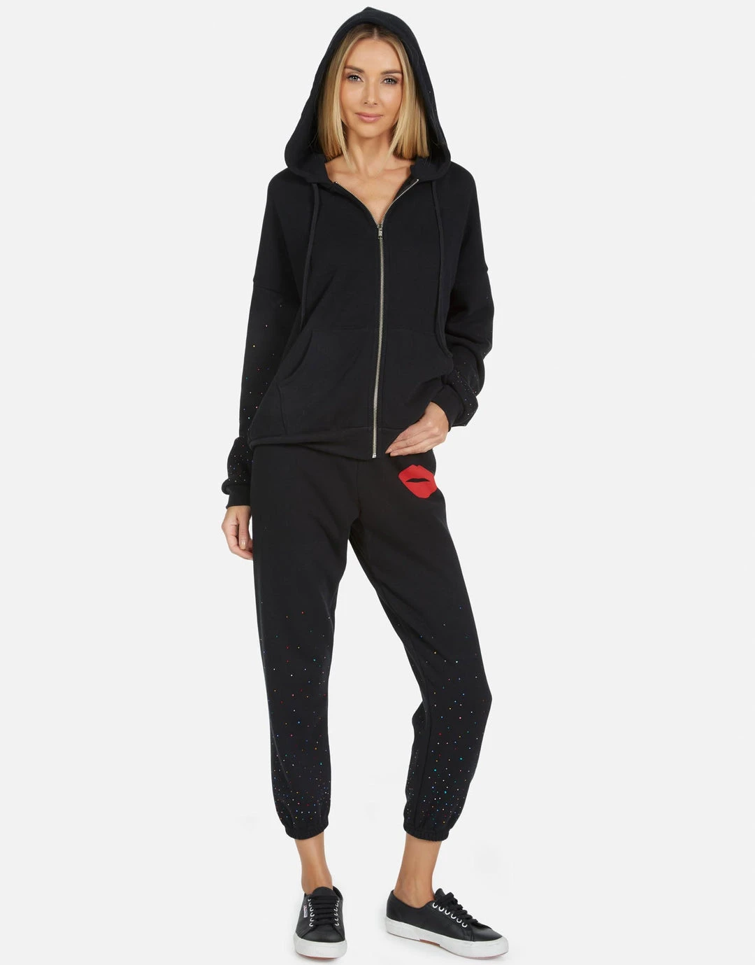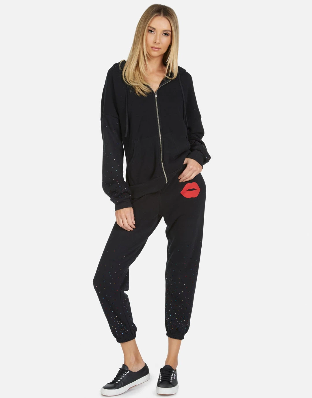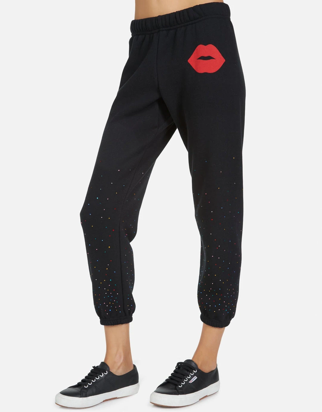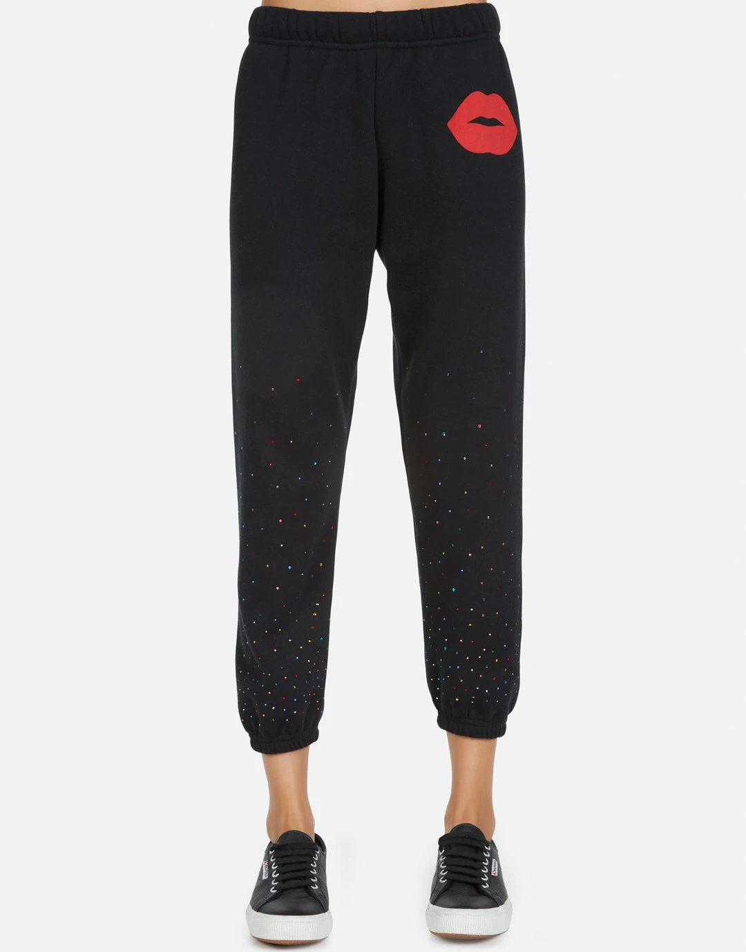 Red Kiss Printed on Ultra Soft Lightweight Sweatpant in Black by Lauren Moshi.