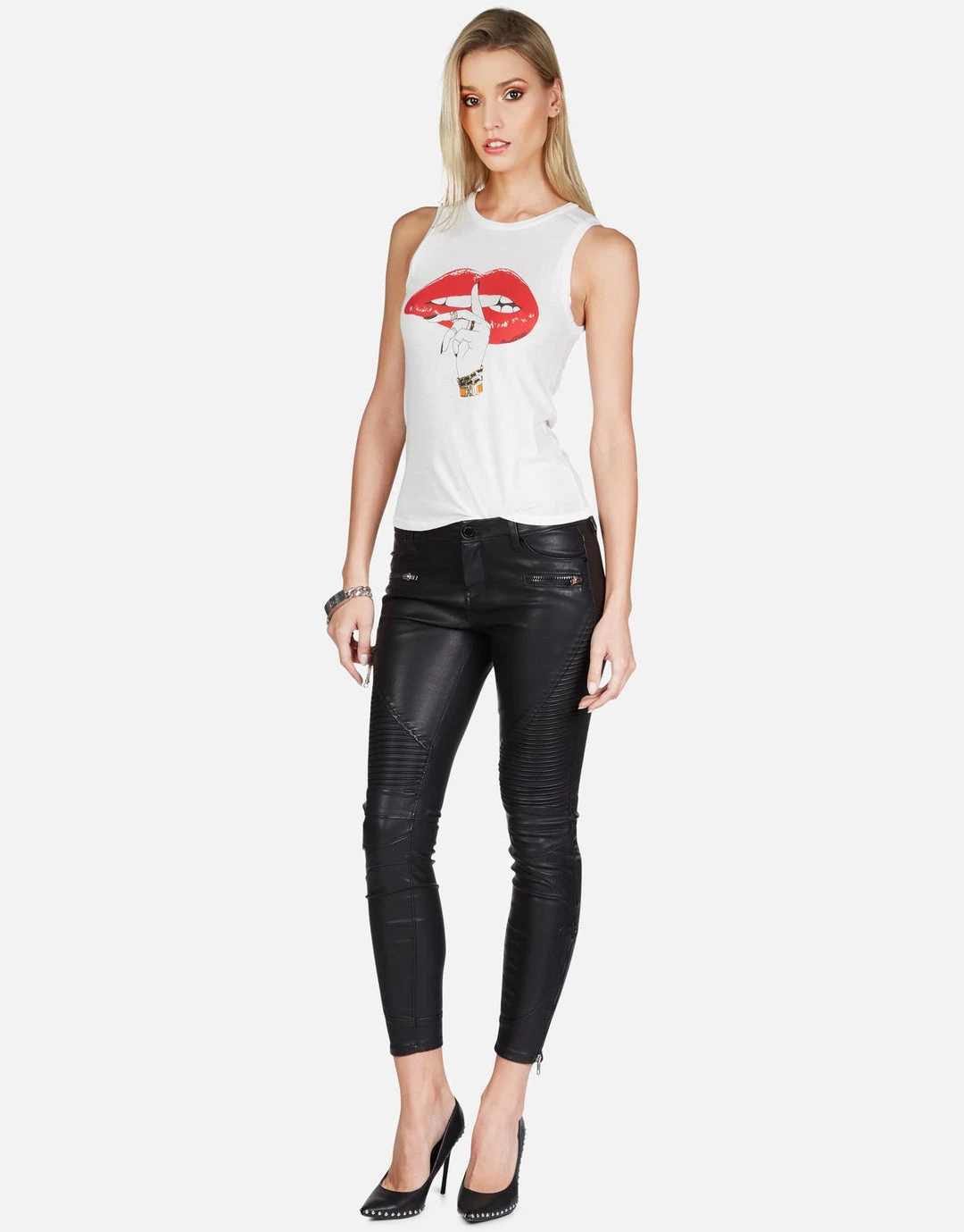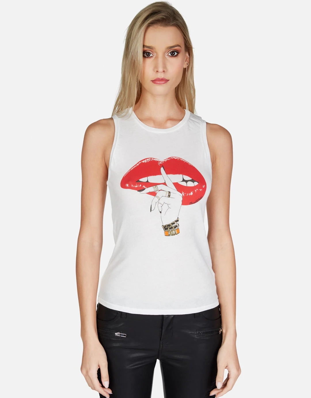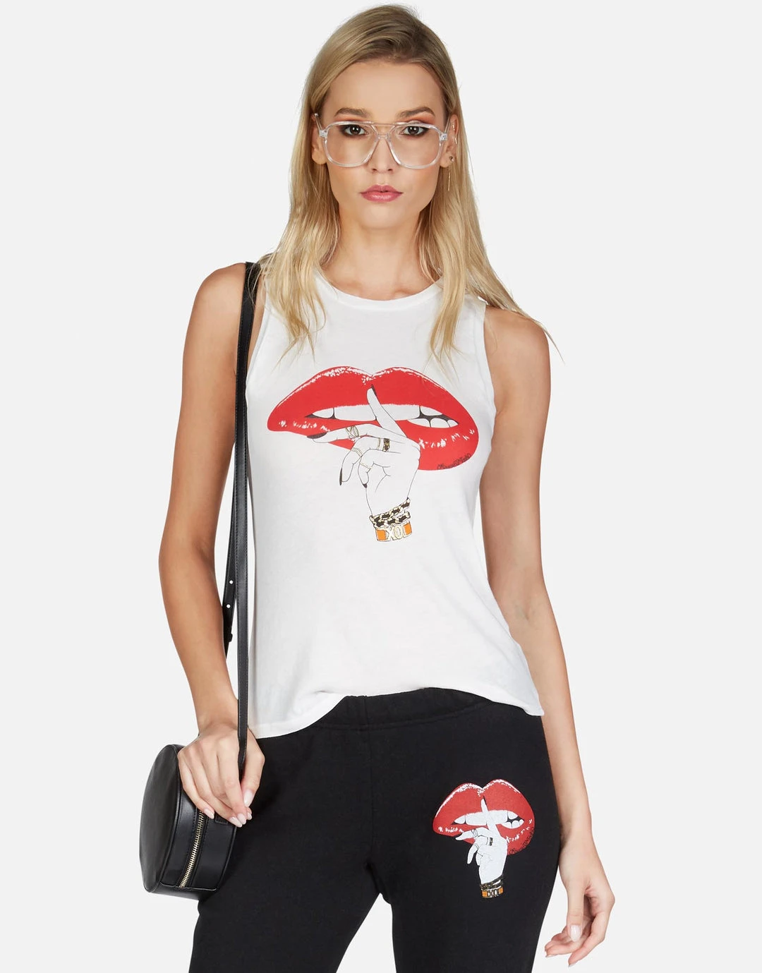XO Shh Lip Printed on Ultra Soft Lightweight Tank in Milk by Lauren Moshi.