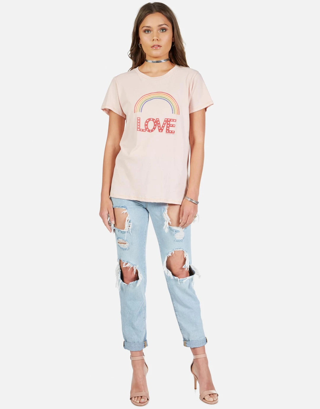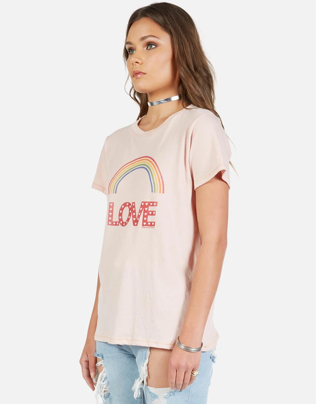 Rainbow Love Printed on Ultra Soft Lightweight Tee in Melon Ice by Lauren Moshi.