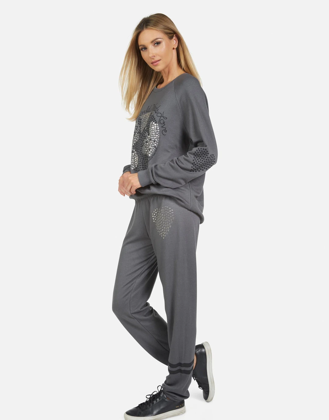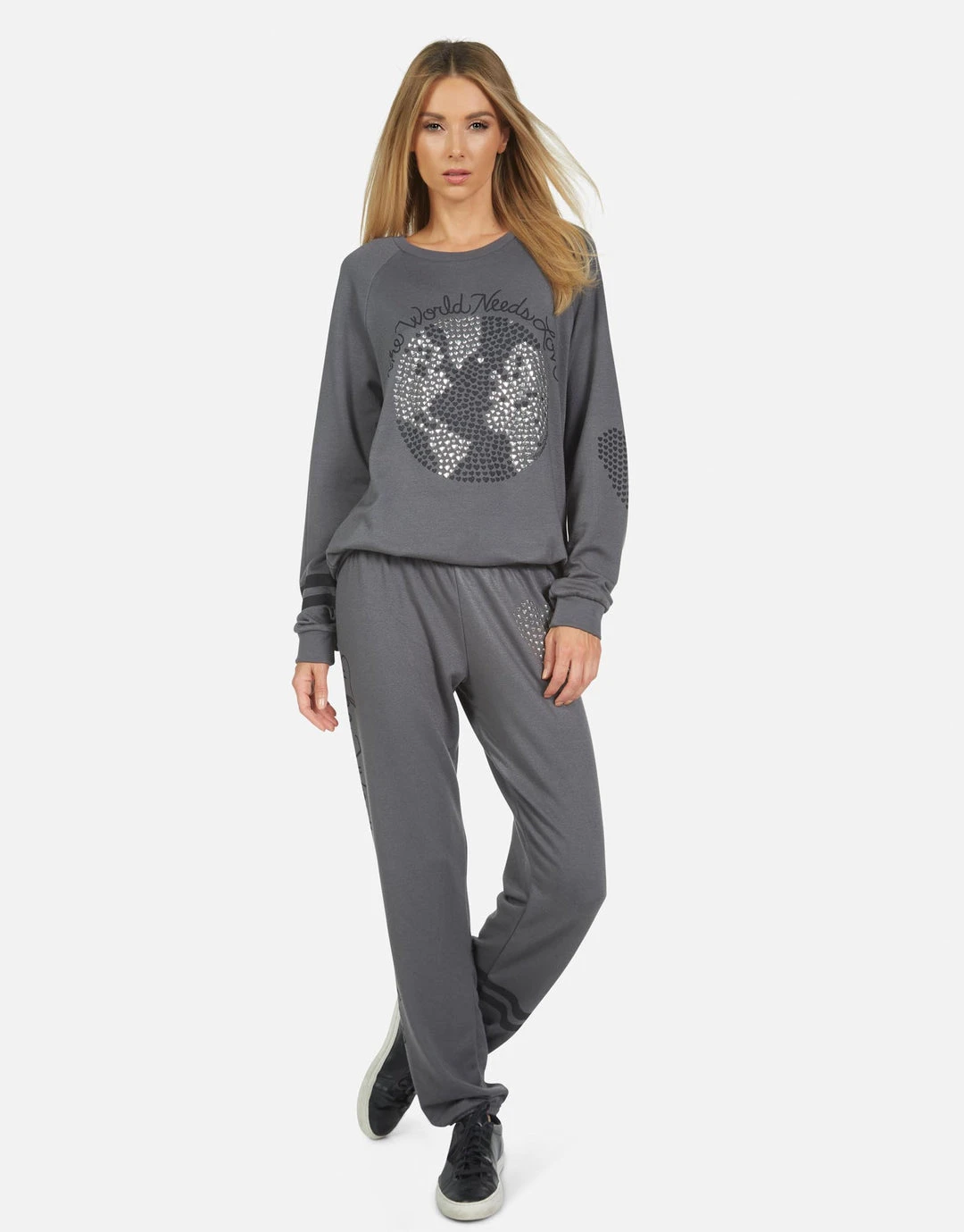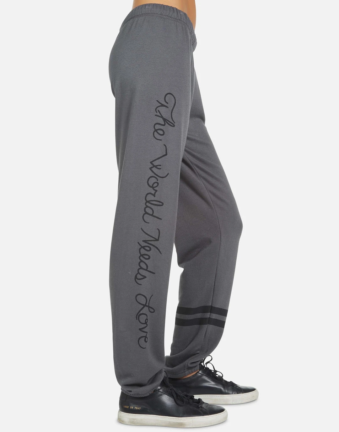 World Needs Love Printed on Ultra Soft Lightweight Sweatpant in Light Onyx by Lauren Moshi.