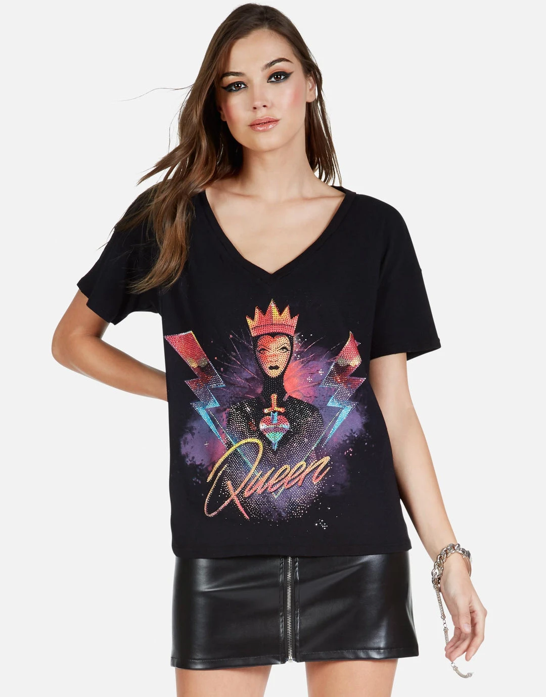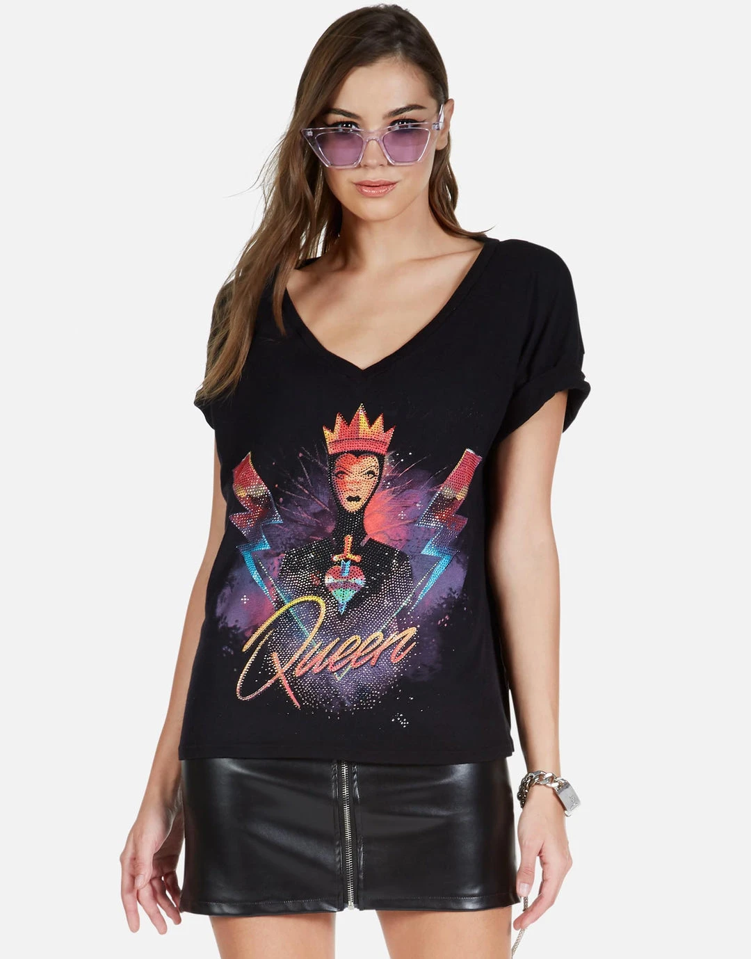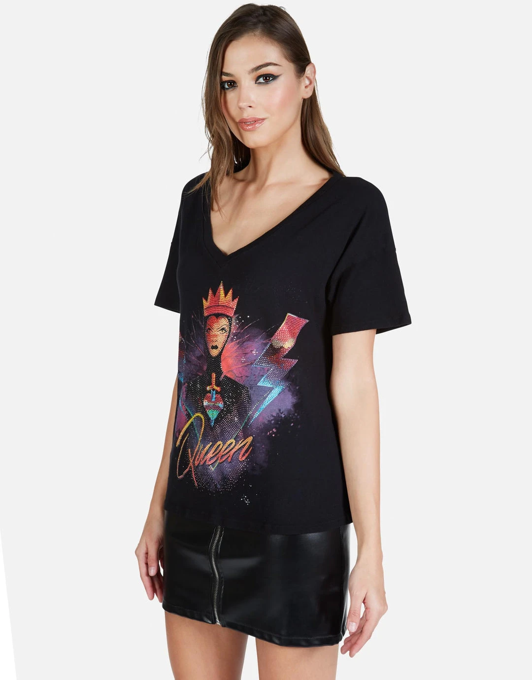 Disney Villains – Queen Printed on Super Soft Lightweight V-Neck Tee in Black w/ Crystals by Lauren Moshi.