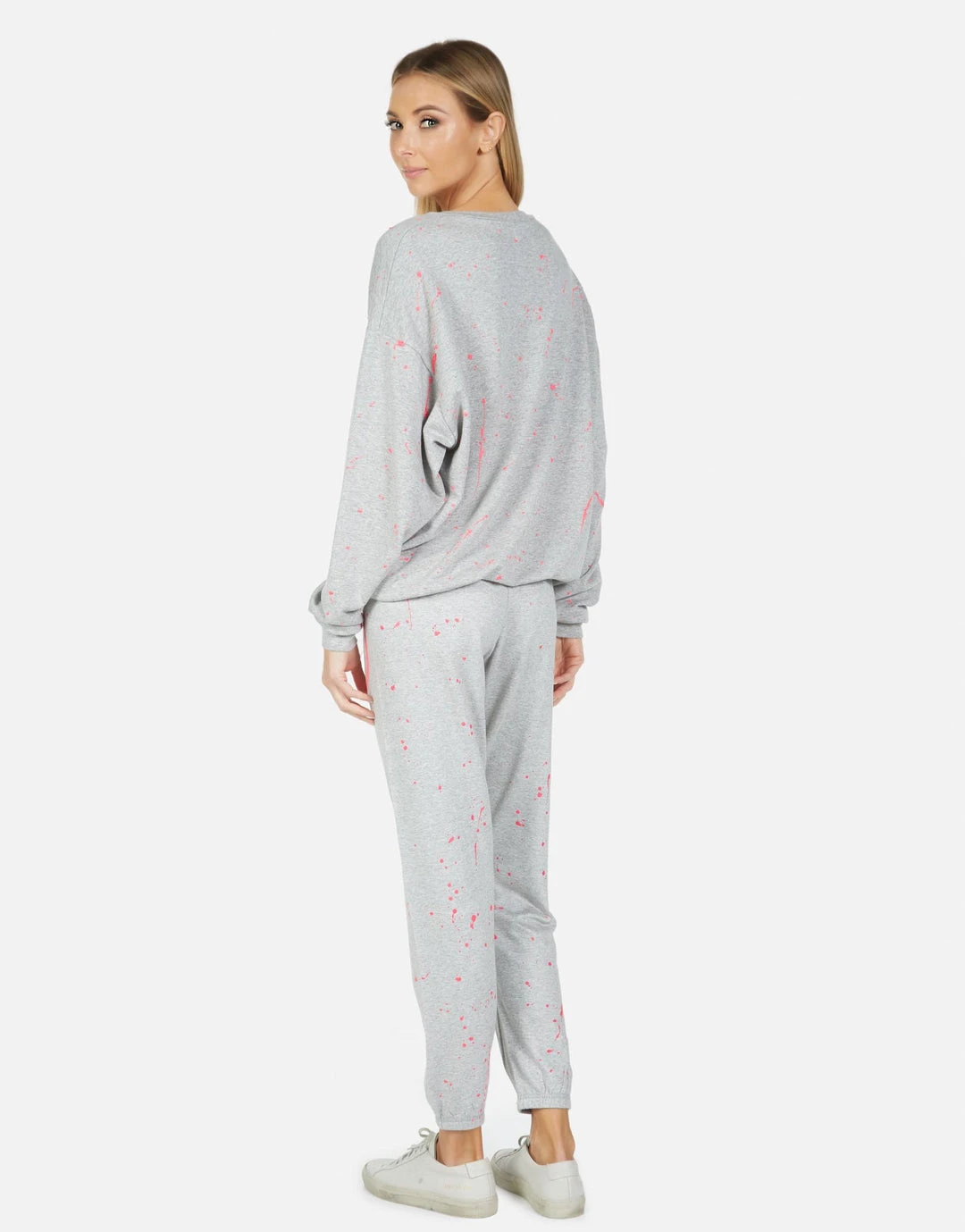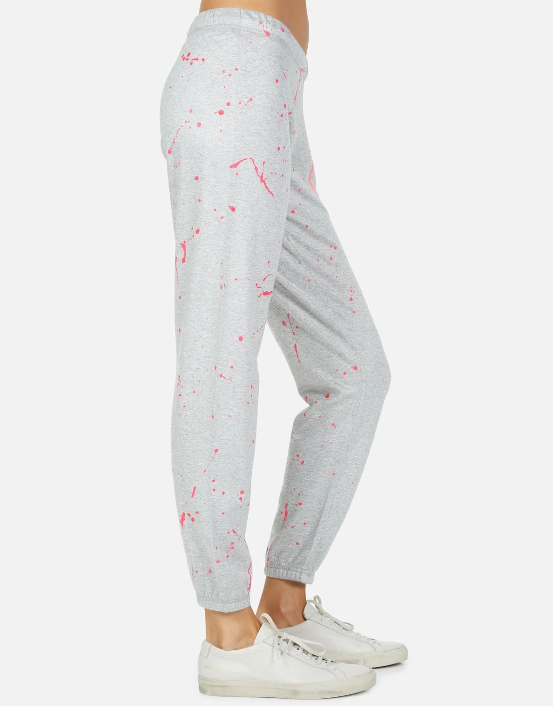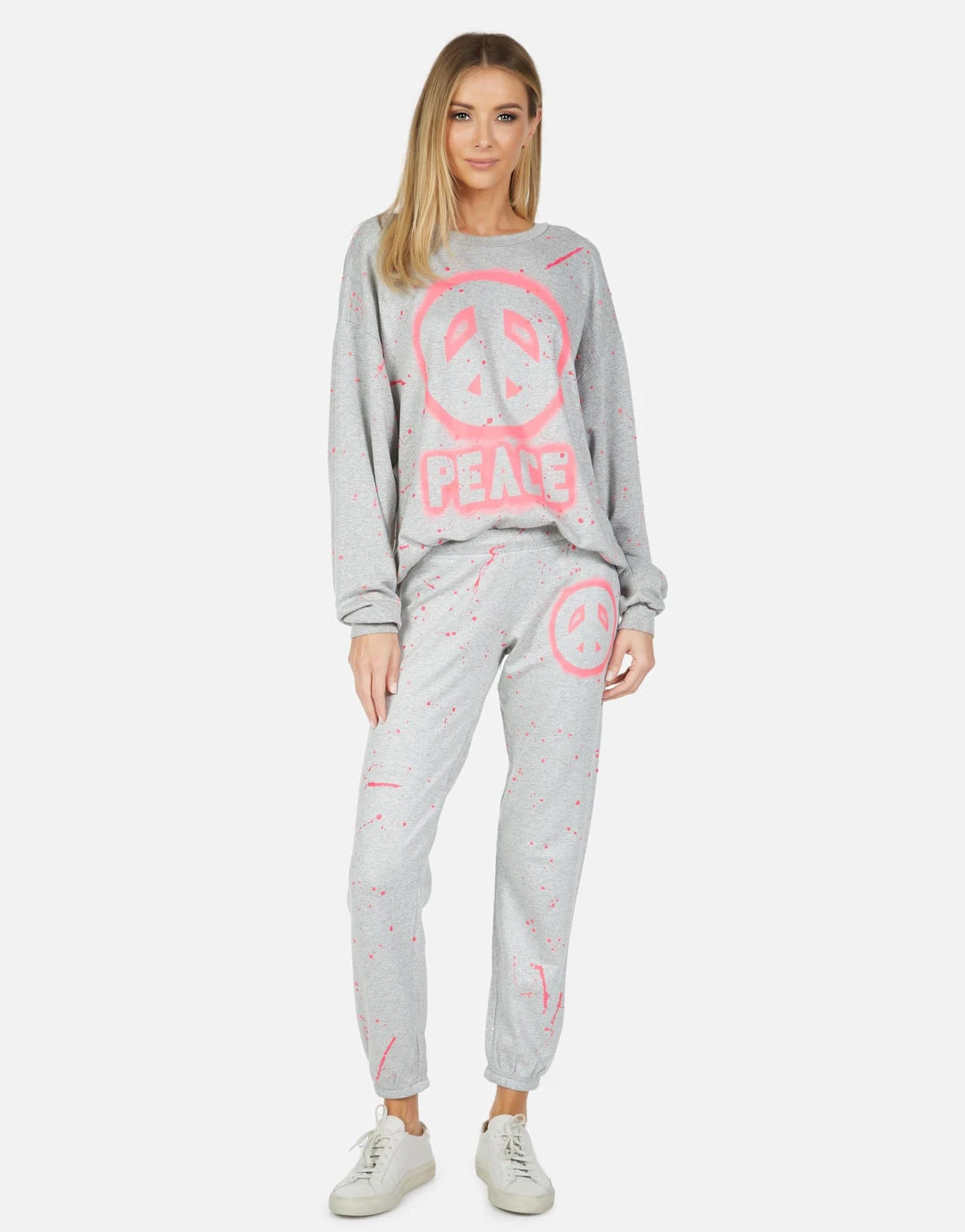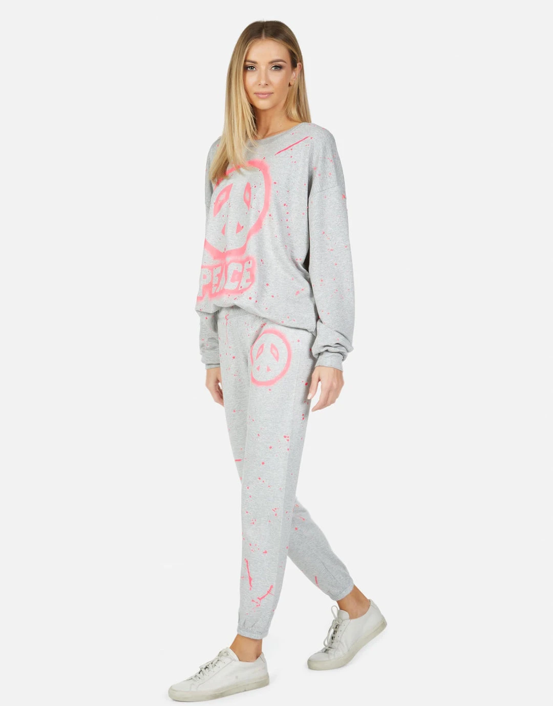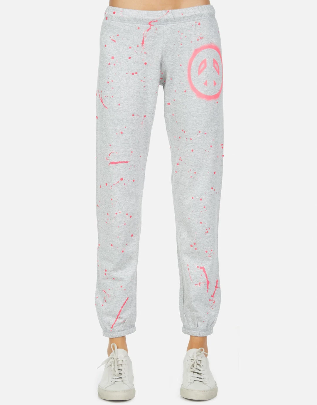 Airbrush Peace Printed on Ultra Soft Lightweight Sweatpant in Heather Grey/Pink Paint Splatter by Lauren Moshi.