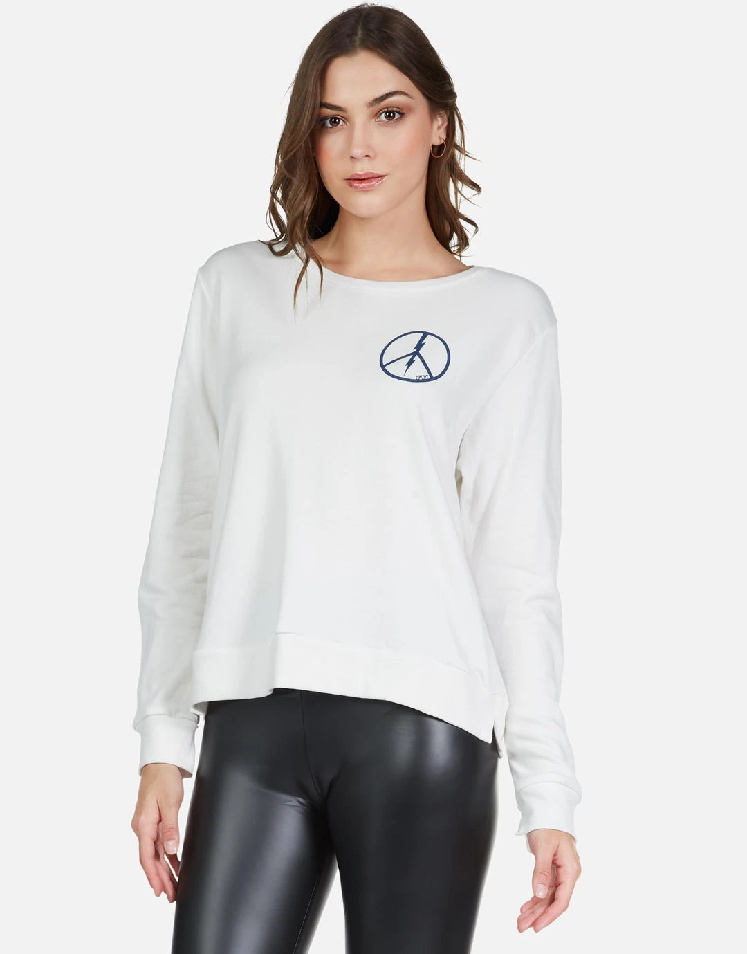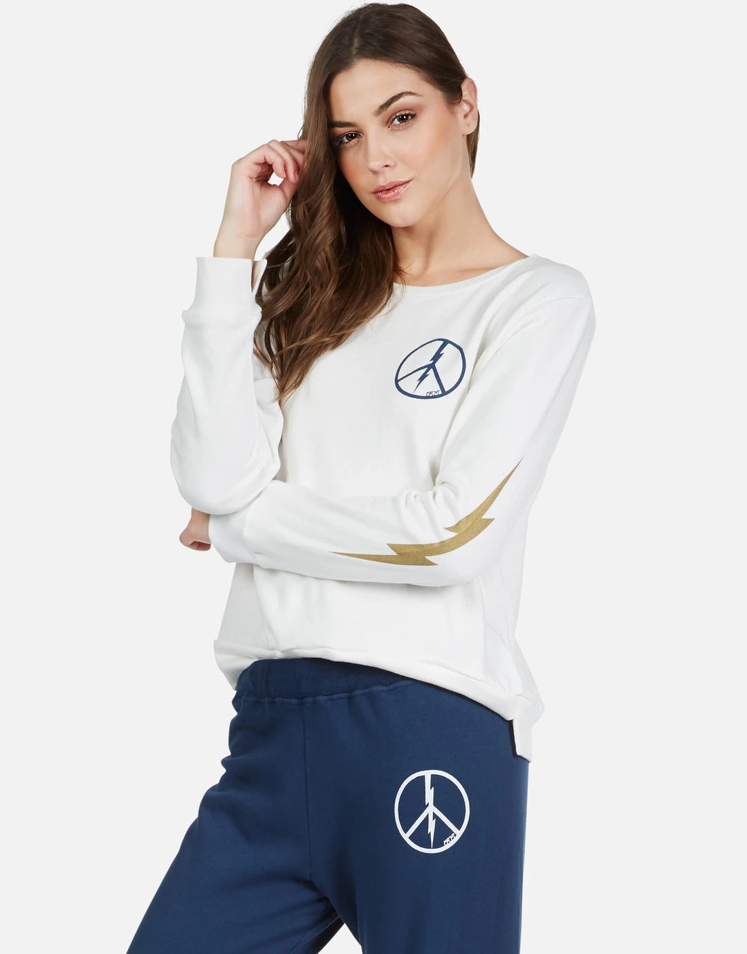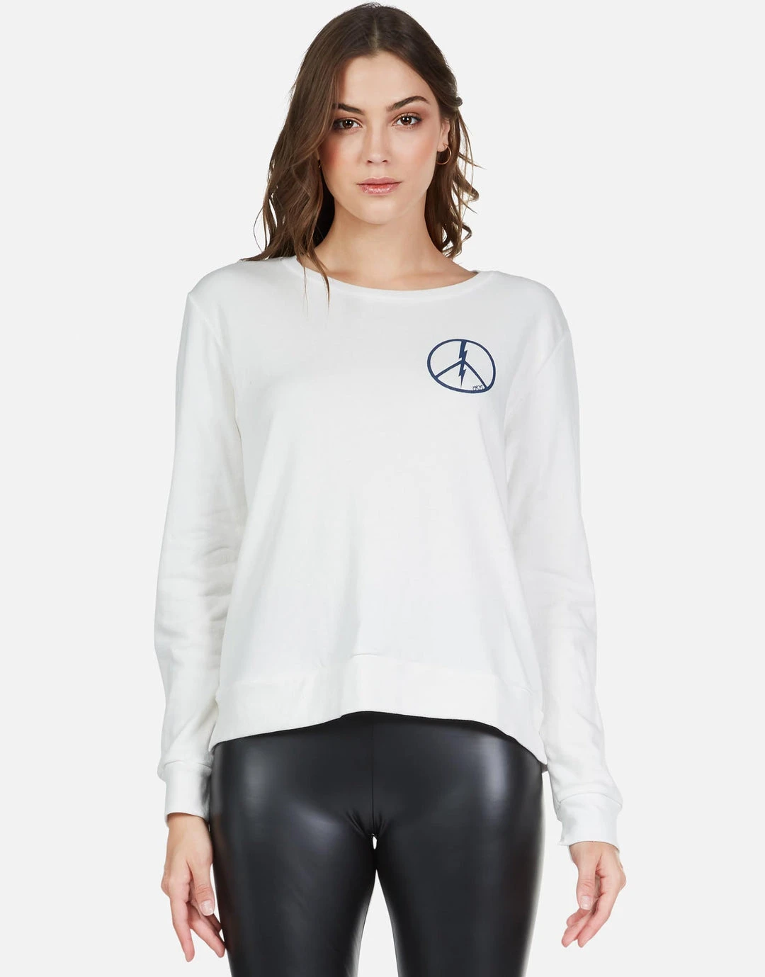 Peace Lightning Printed on Ultra Soft Lightweight Pullover in Milk by Lauren Moshi.
