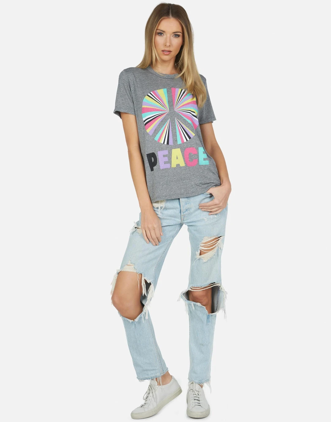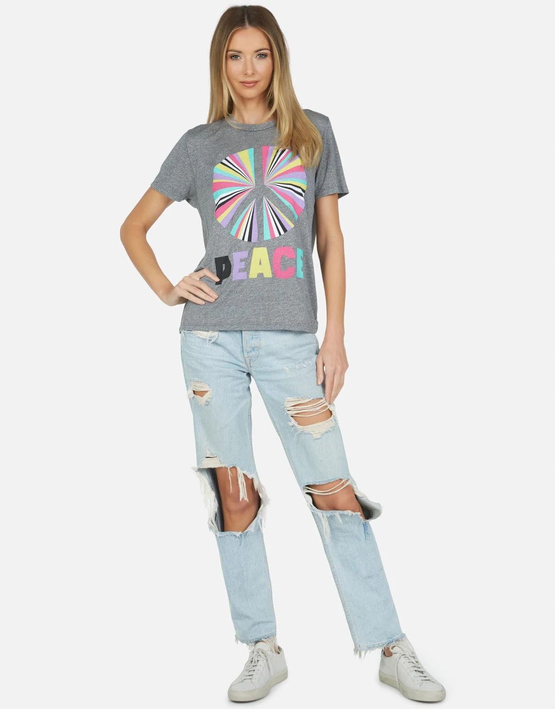 Rainbow Ray Peace Printed on Ultra Soft Lightweight Vintage Tee in Heather Grey by Lauren Moshi.