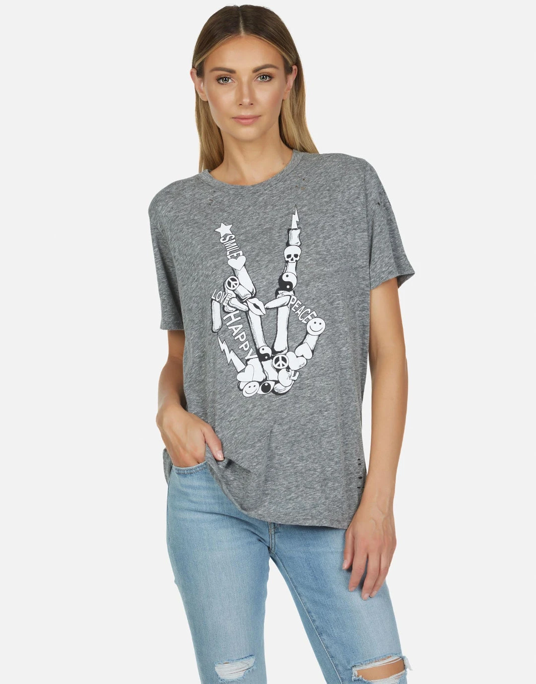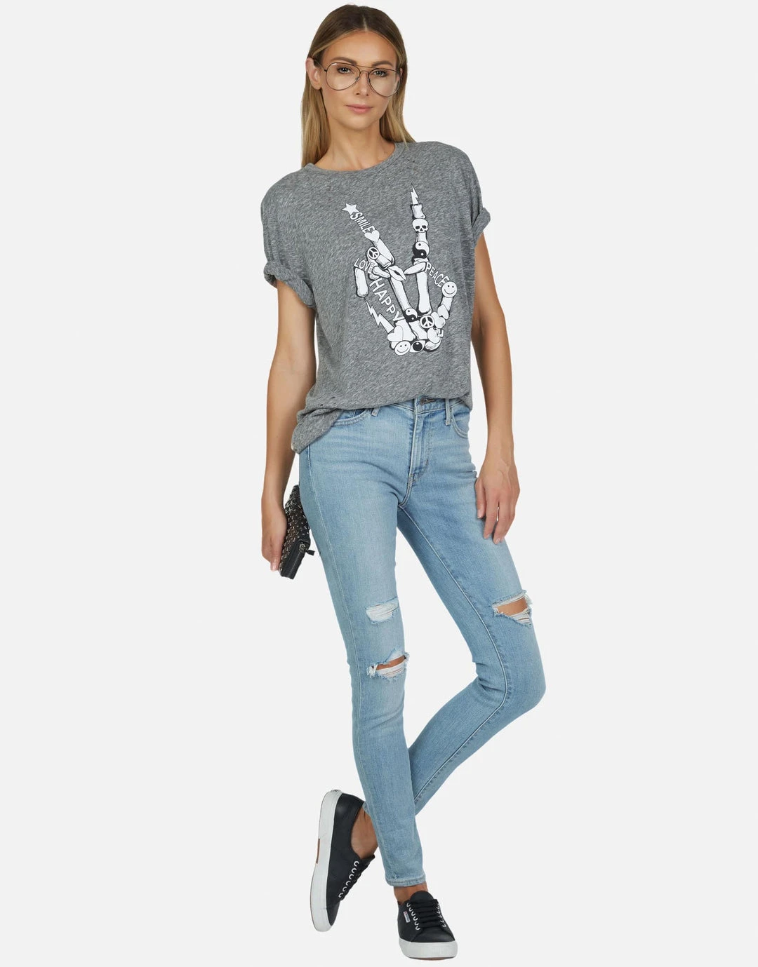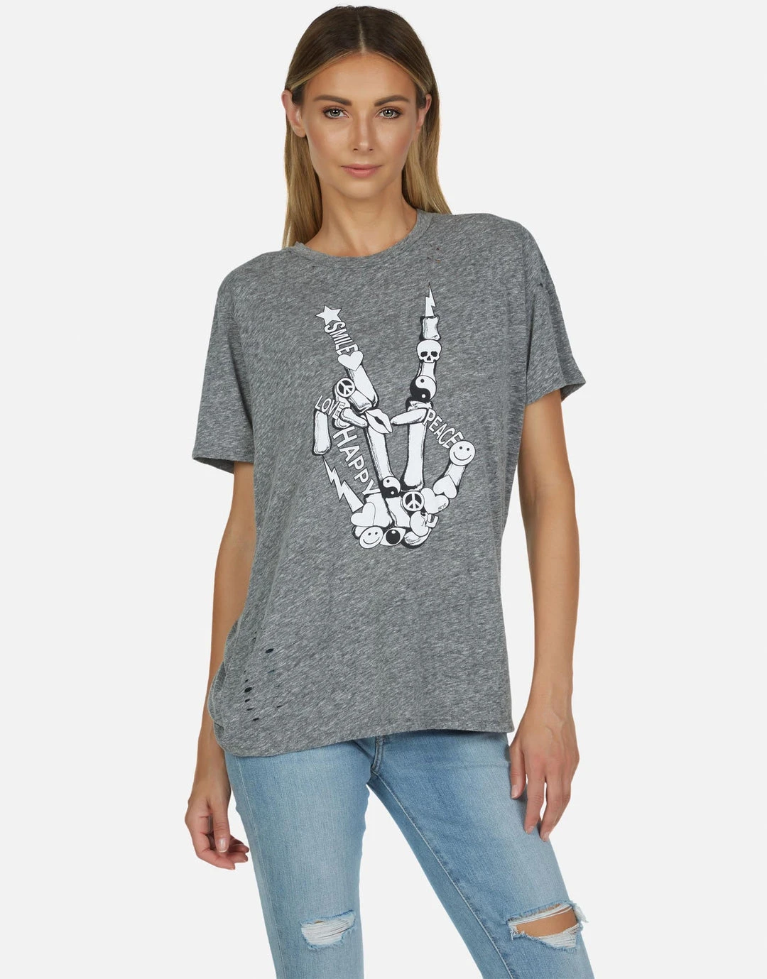 Skeleton Peace Elements Printed on Ultra Soft Lightweight Tee in Heather Grey by Lauren Moshi.