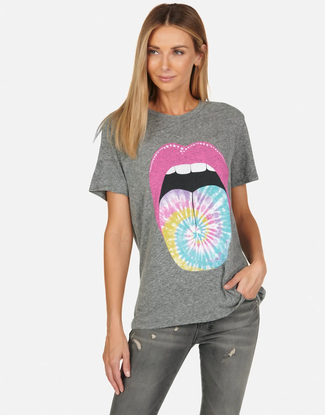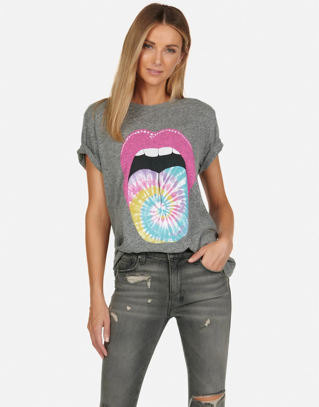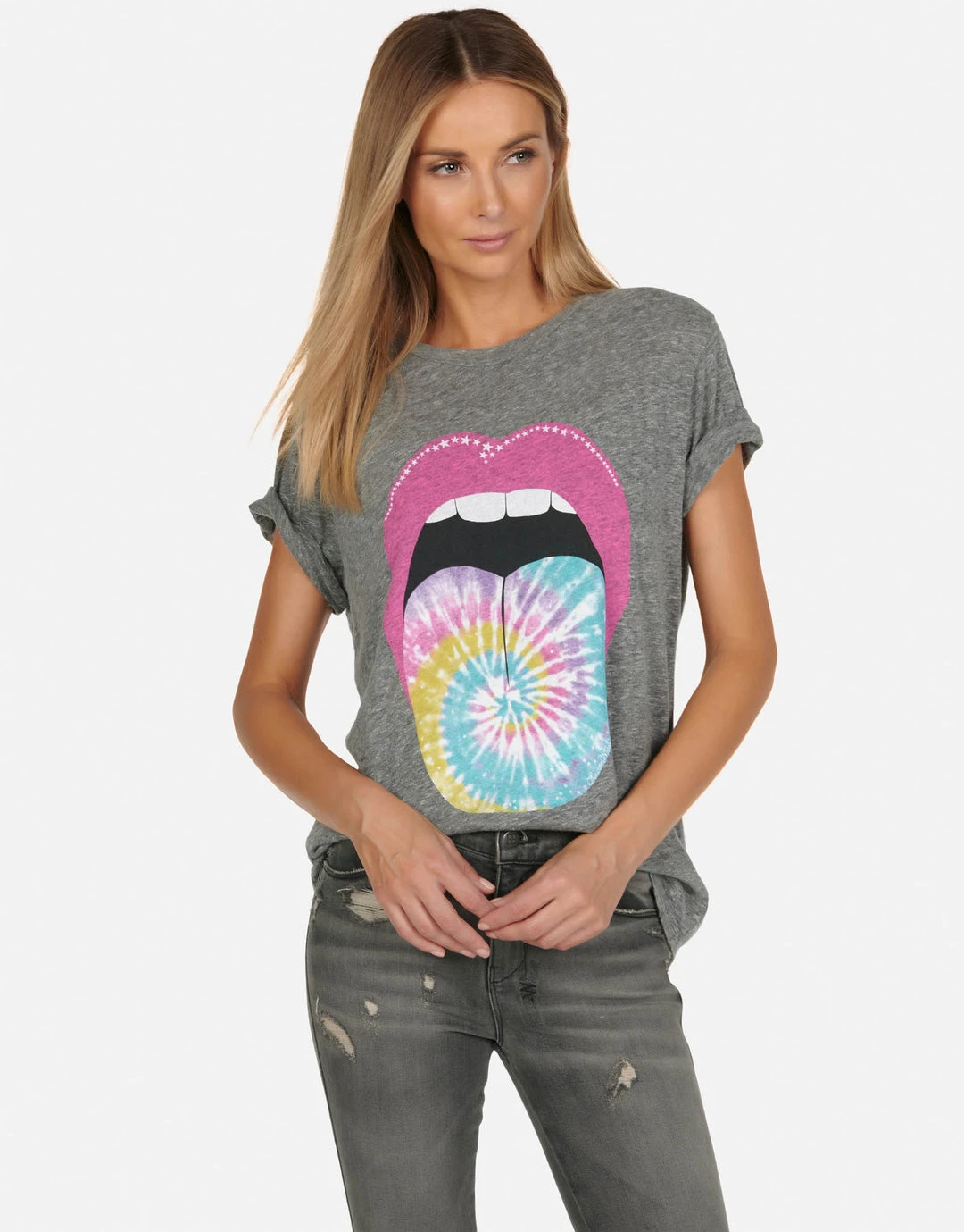 Tie Dye Tongue Printed on Ultra Soft Lightweight Tee in Heather Grey by Lauren Moshi.