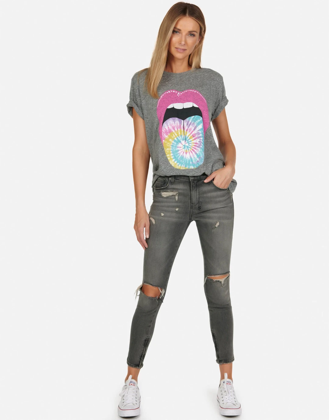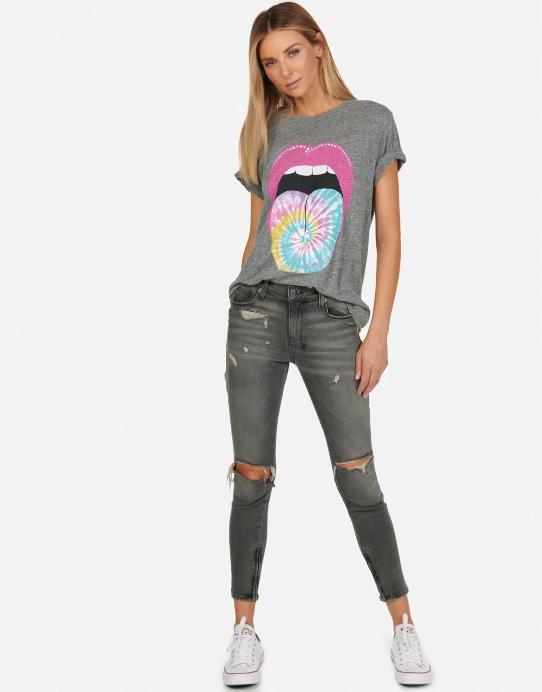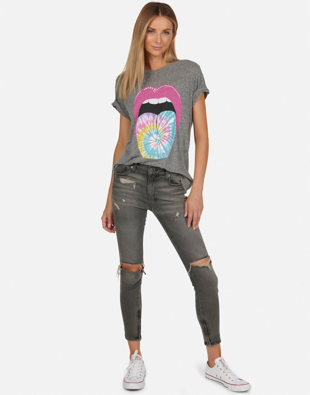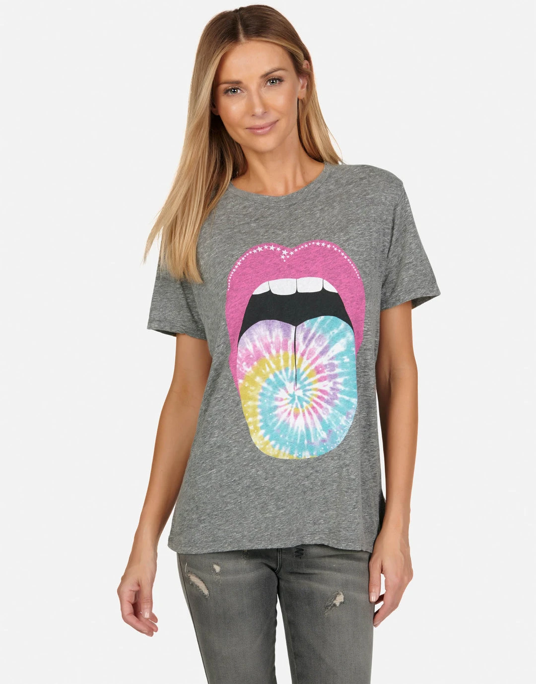 Tie Dye Tongue Printed on Ultra Soft Lightweight Tee in Heather Grey by Lauren Moshi.