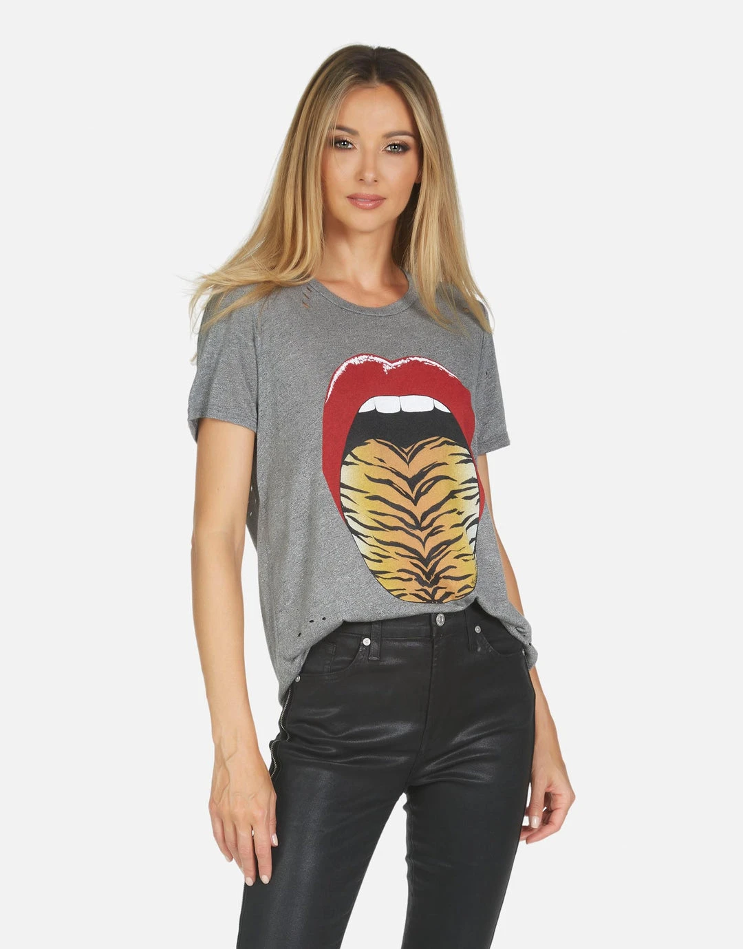 Tiger Tongue Printed on Ultra Soft Lightweight Tee in Heather Grey by Lauren Moshi.