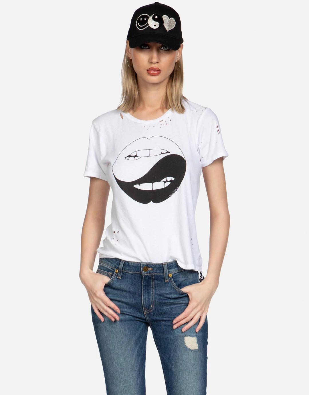 Biting Lip Yin Yang Printed on Ultra Soft Lightweight Vintage Tee in White by Lauren Moshi.