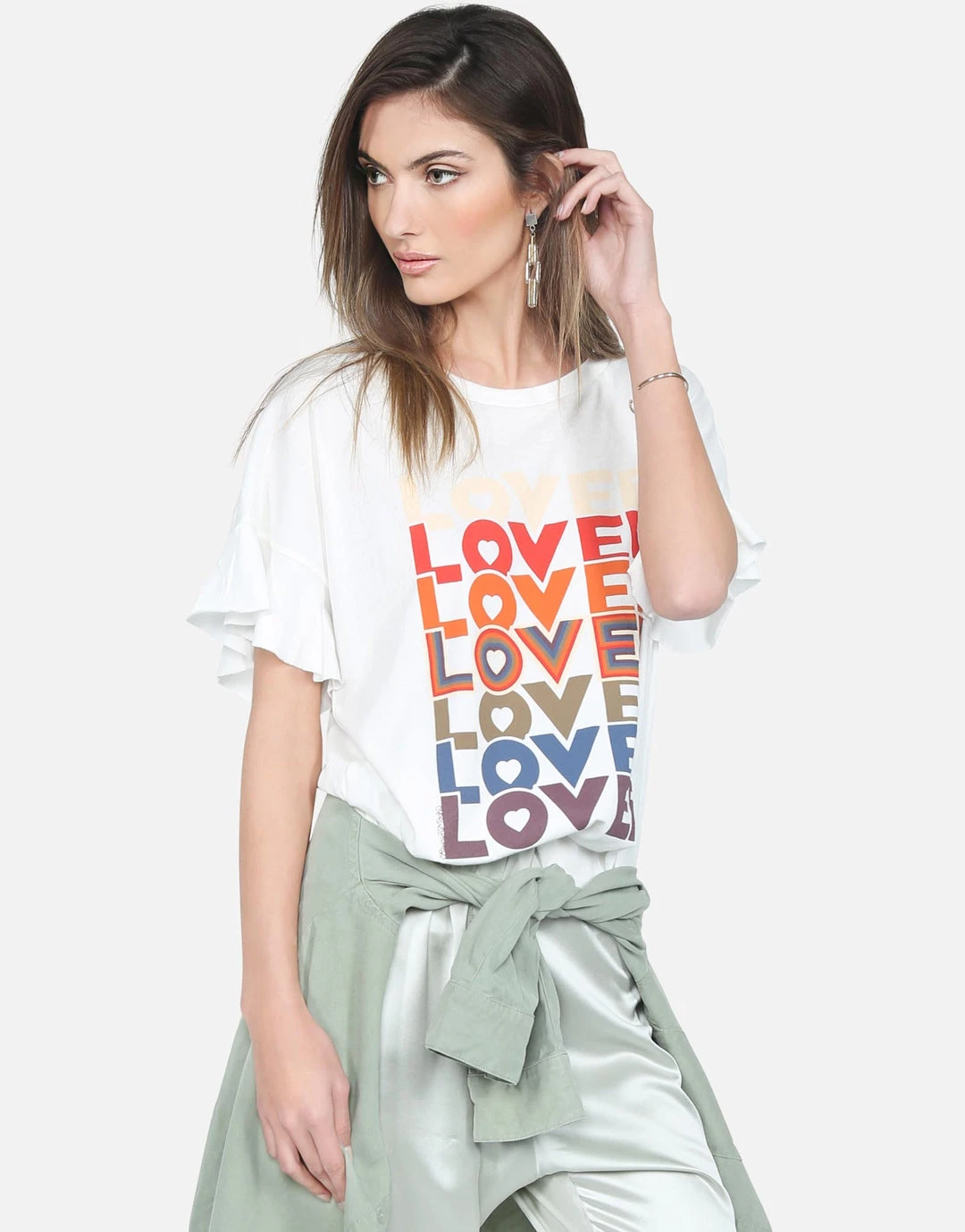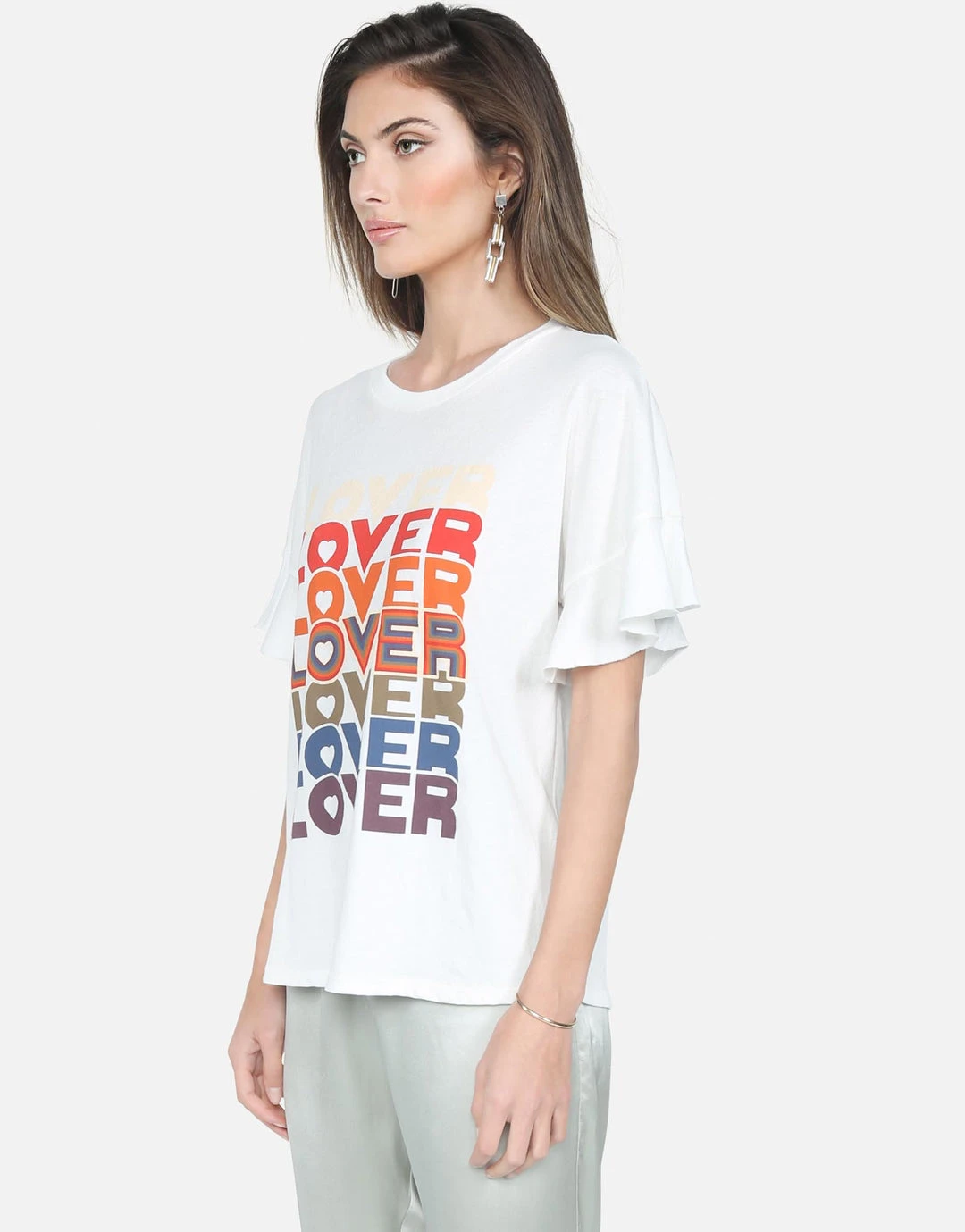 Rainbow Lover Printed on Super Soft Short Sleeve Ruffle Tee in Milk by Lauren Moshi.