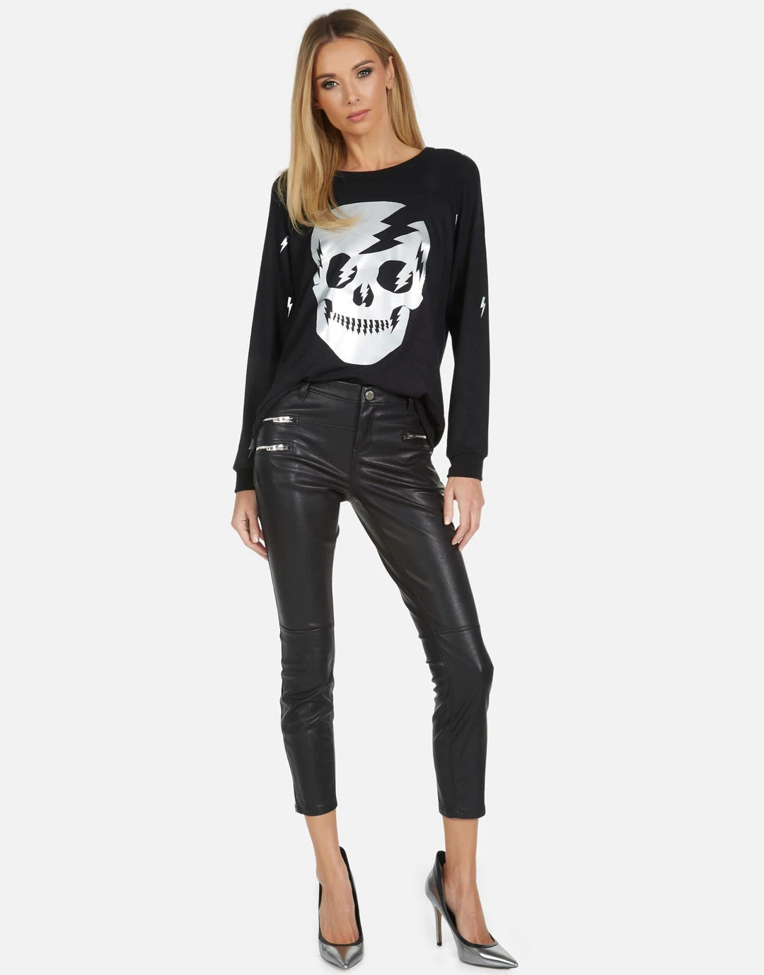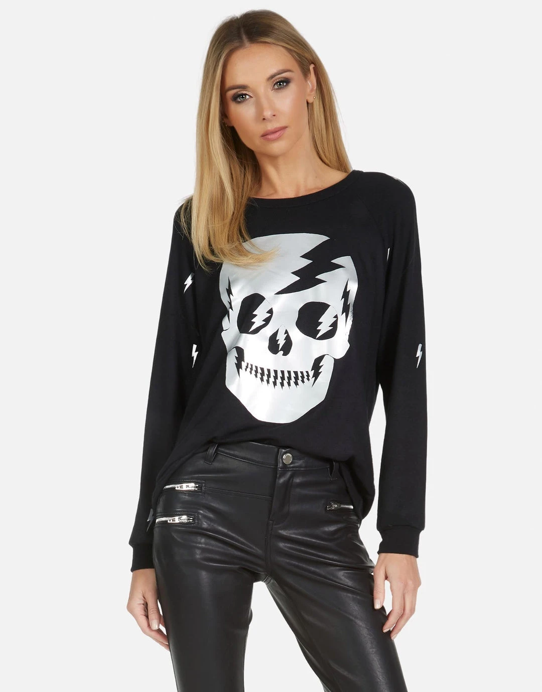 Electric Skull on Ultra Soft Lightweight Raglan Pullover in Black by Lauren Moshi.
