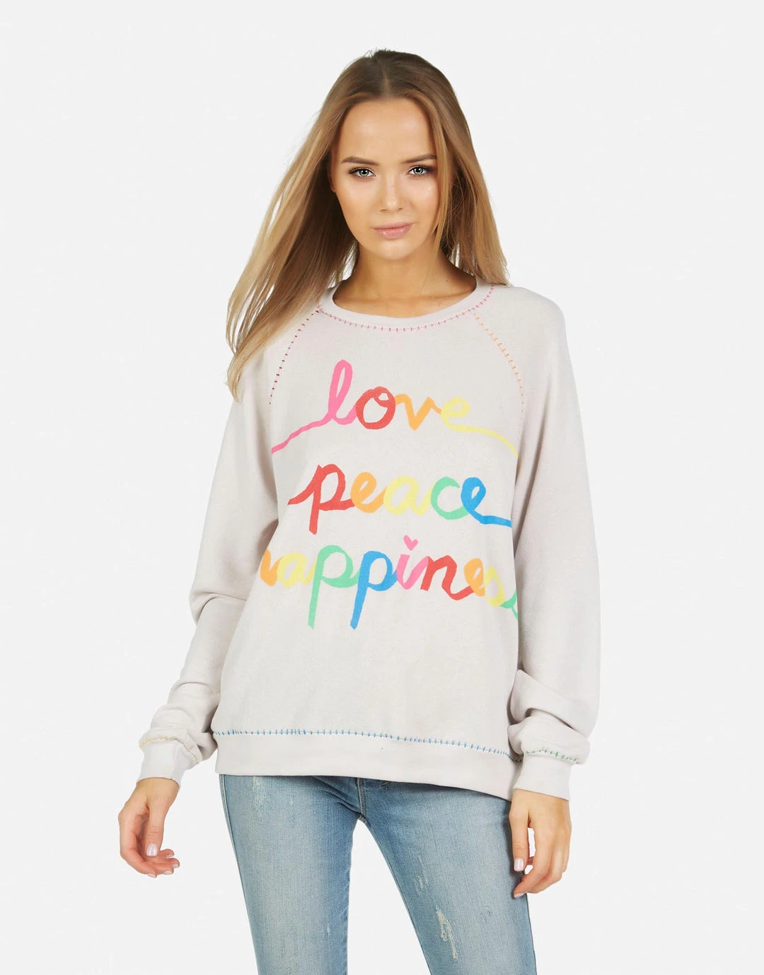 Love Peace Happiness Printed on Ultra Soft Lightweight Pullover in Cloud by Lauren Moshi.