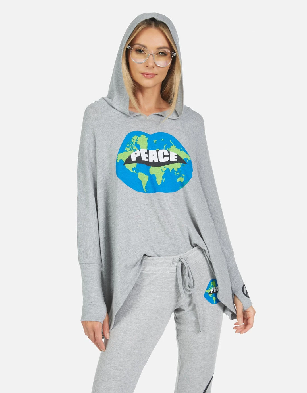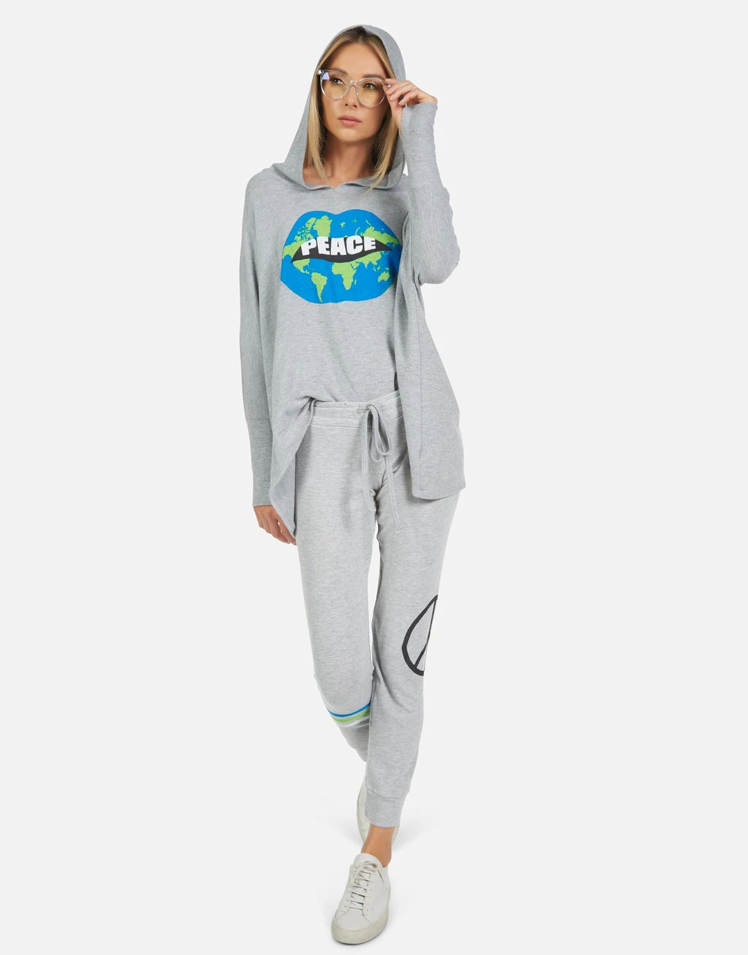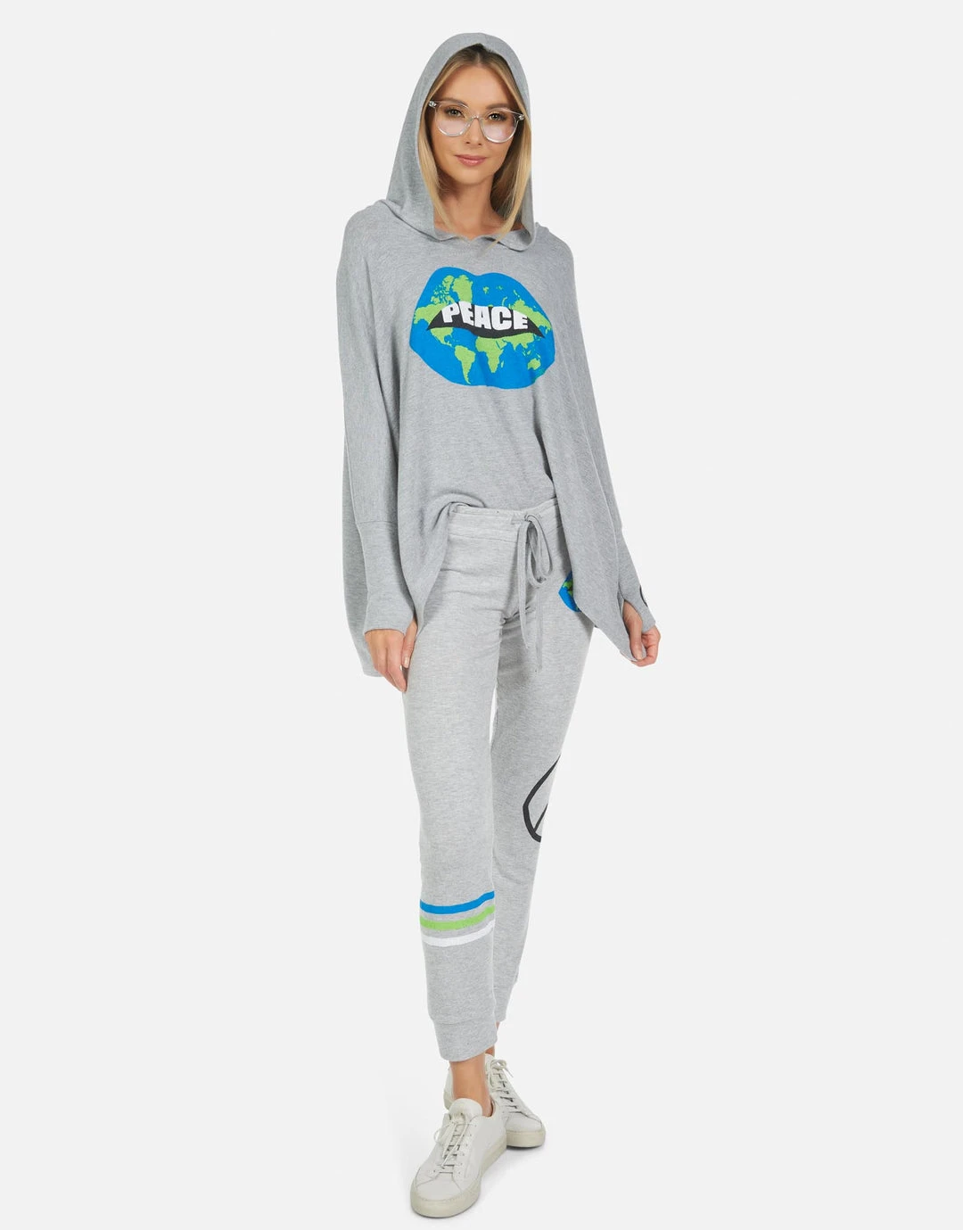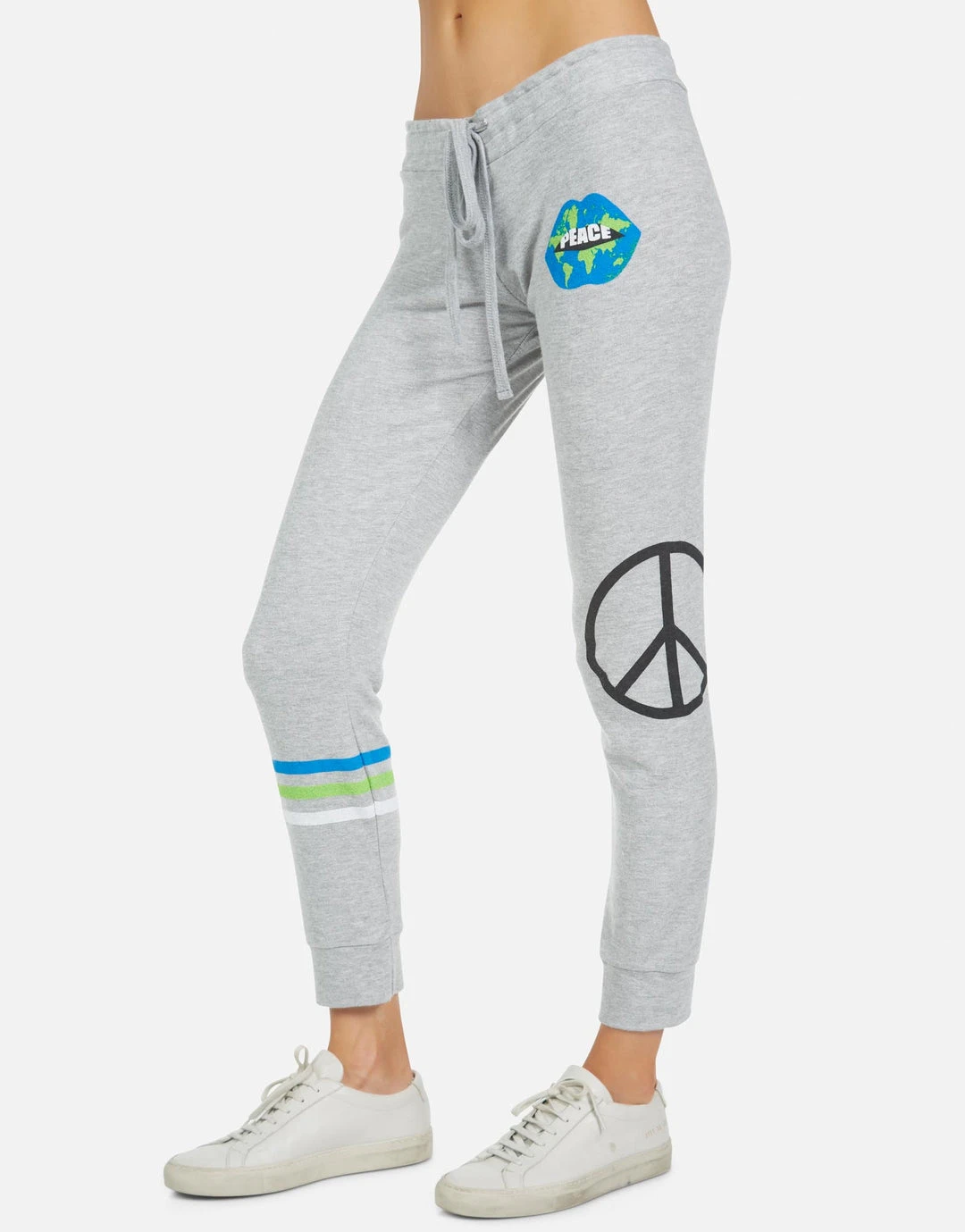 World Peace Lips Printed on Ultra Soft Lightweight Sweatpant in Heather Grey by Lauren Moshi.
