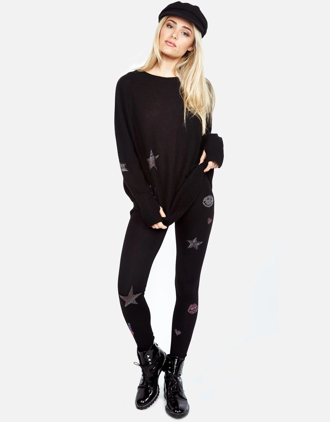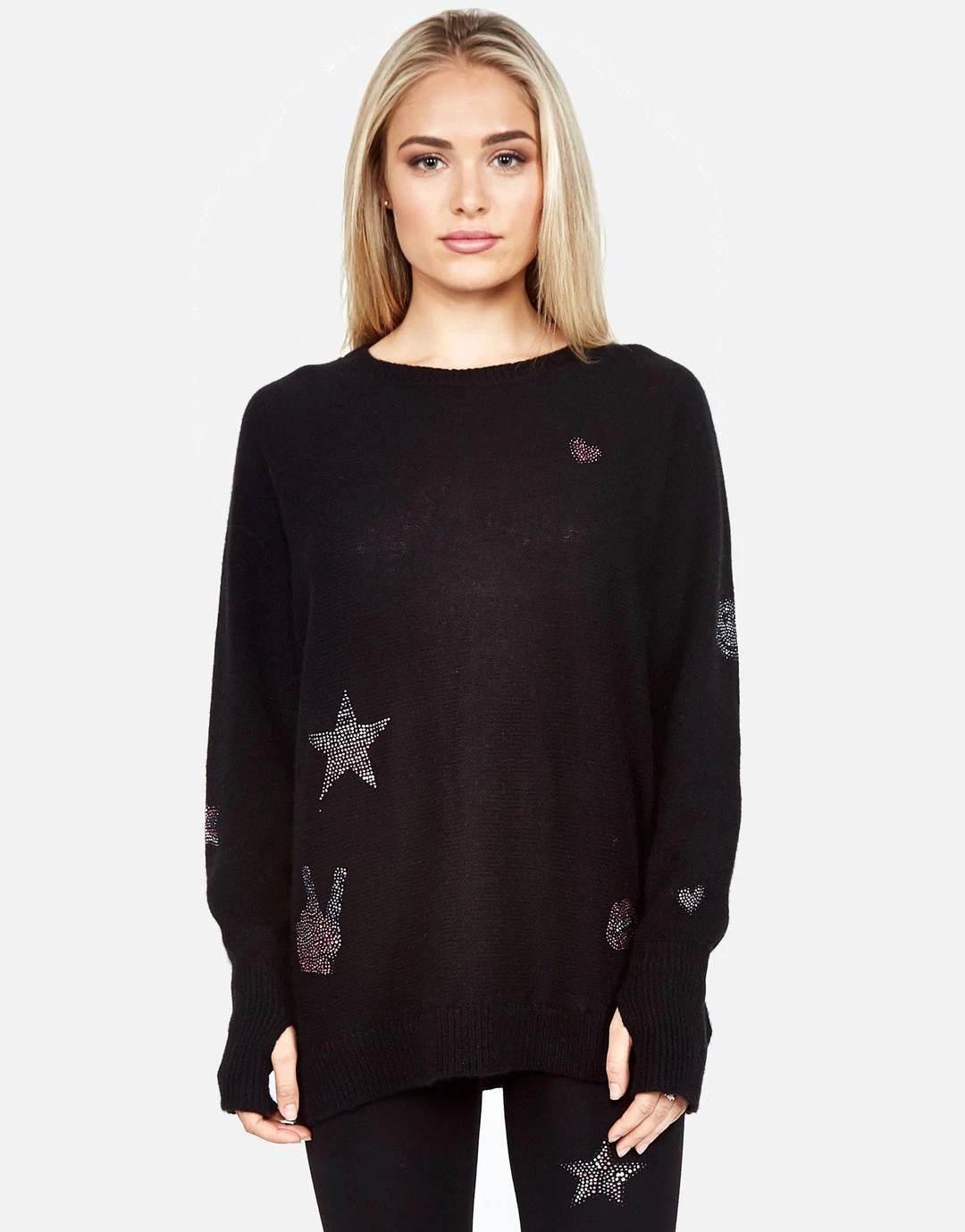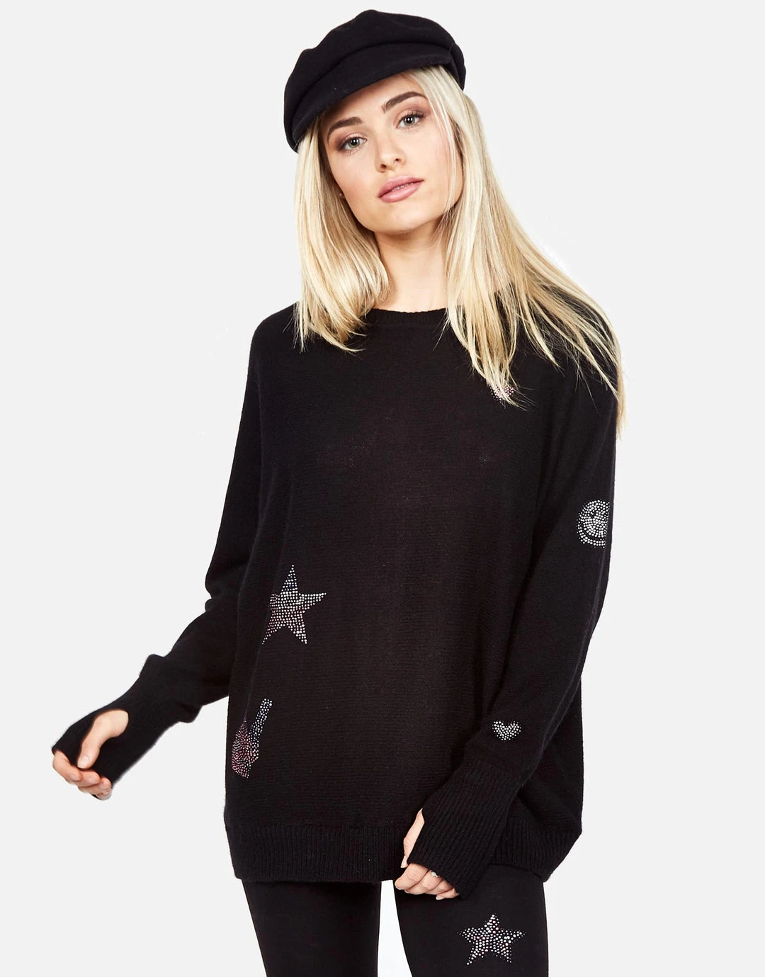Crystal Elements on Ultra Soft lightweight Cashmere Sweater in Black by Lauren Moshi.
