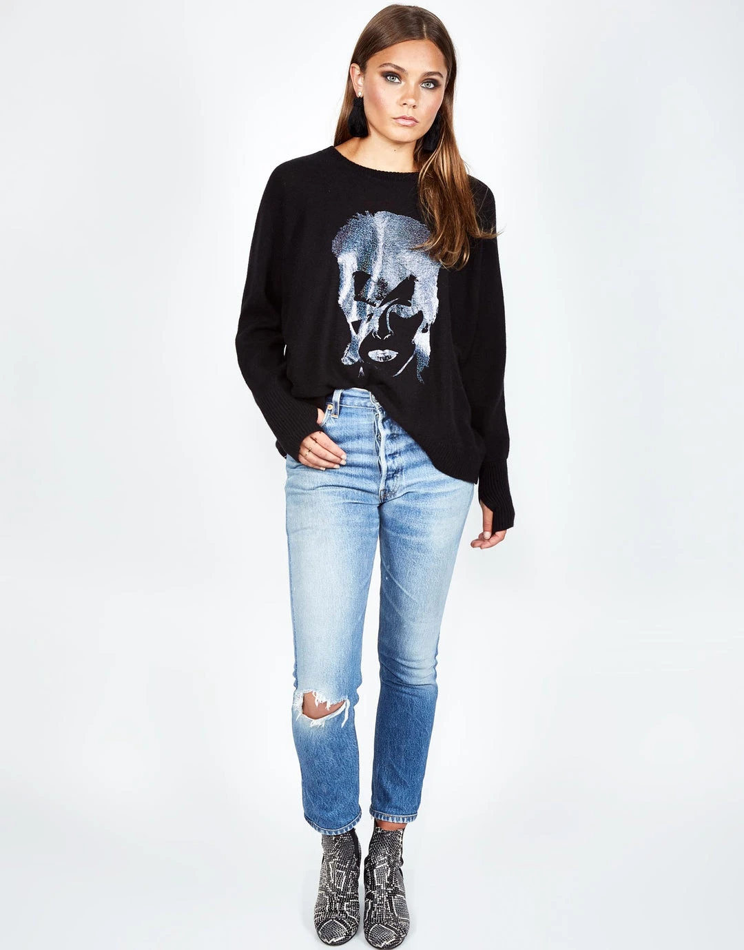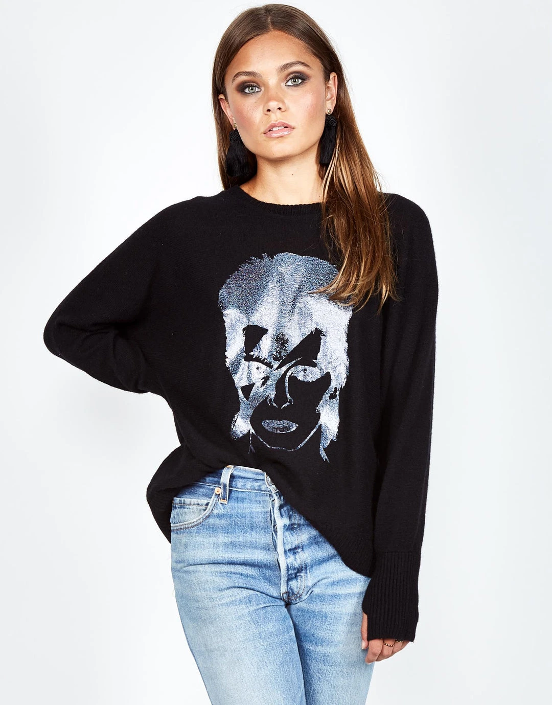 Glitter Bowie Printed on Ultra Soft Cashmere Sweater in Black by Lauren Moshi.