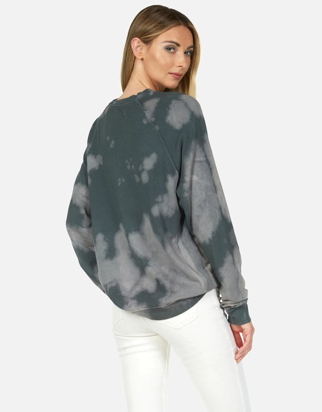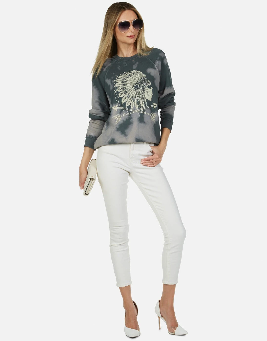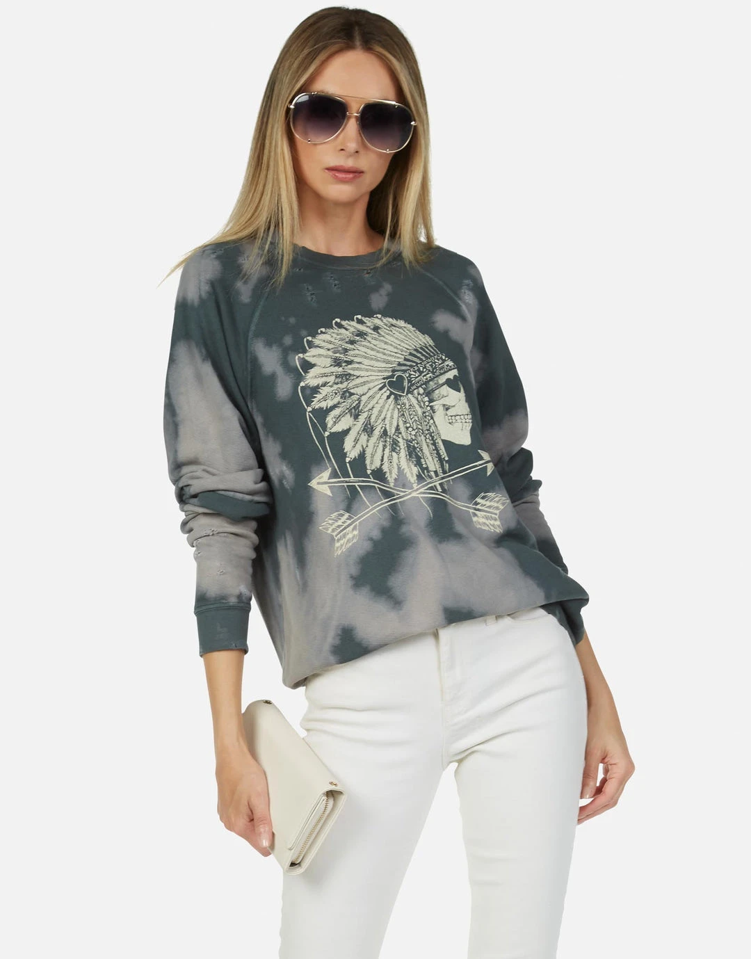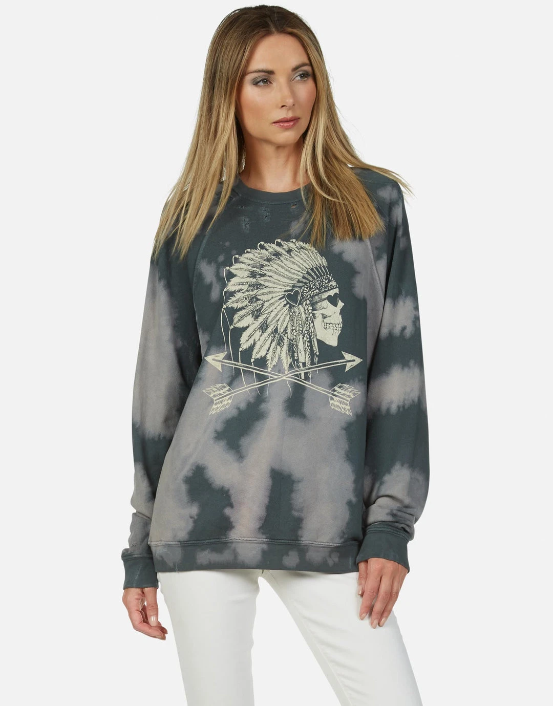 Love Skull Headdress Printed on Ultra Soft Lightweight Raglan Pullover in Vintage Forest by Lauren Moshi.