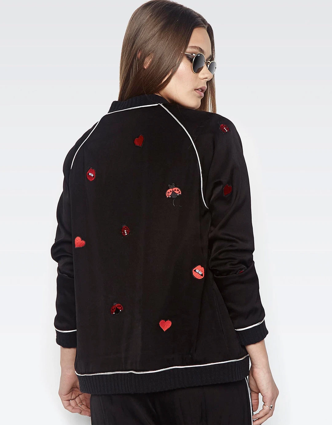 Ladybug & Love Kiss Patches Bomber Jacket w/Piping in Black by Lauren Moshi.