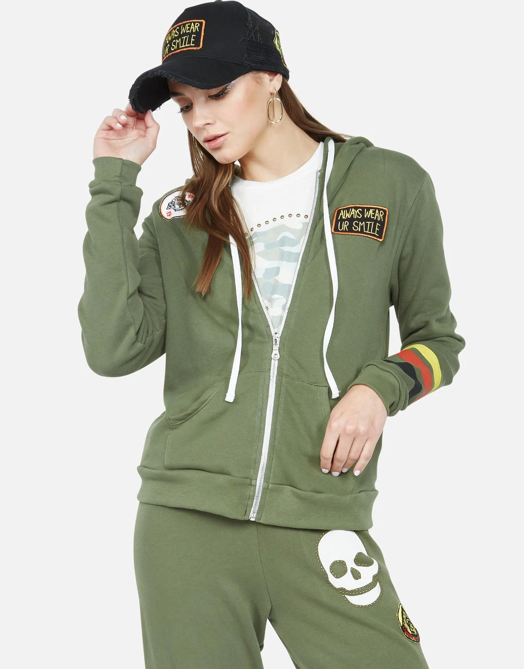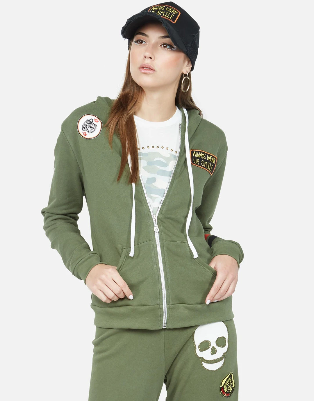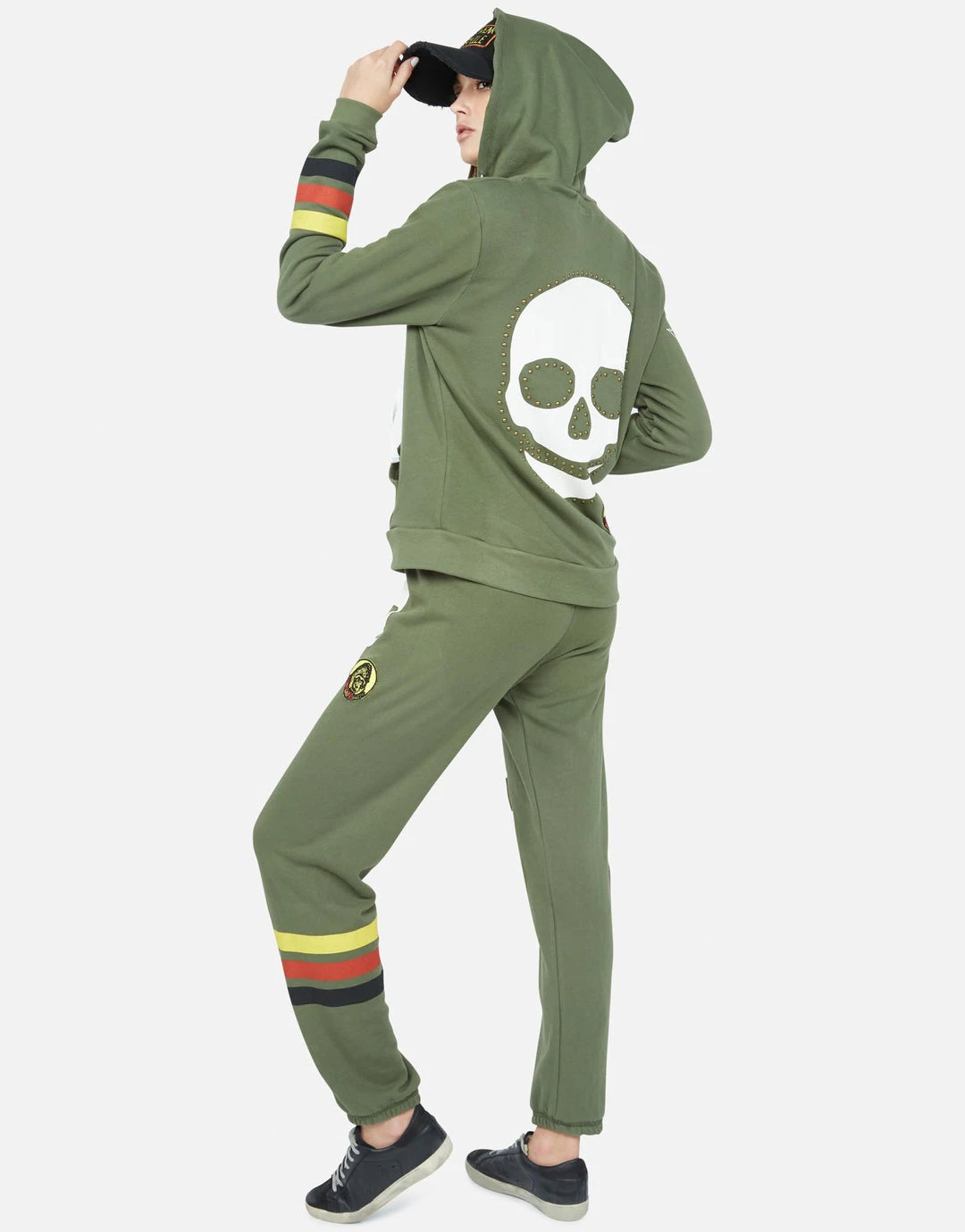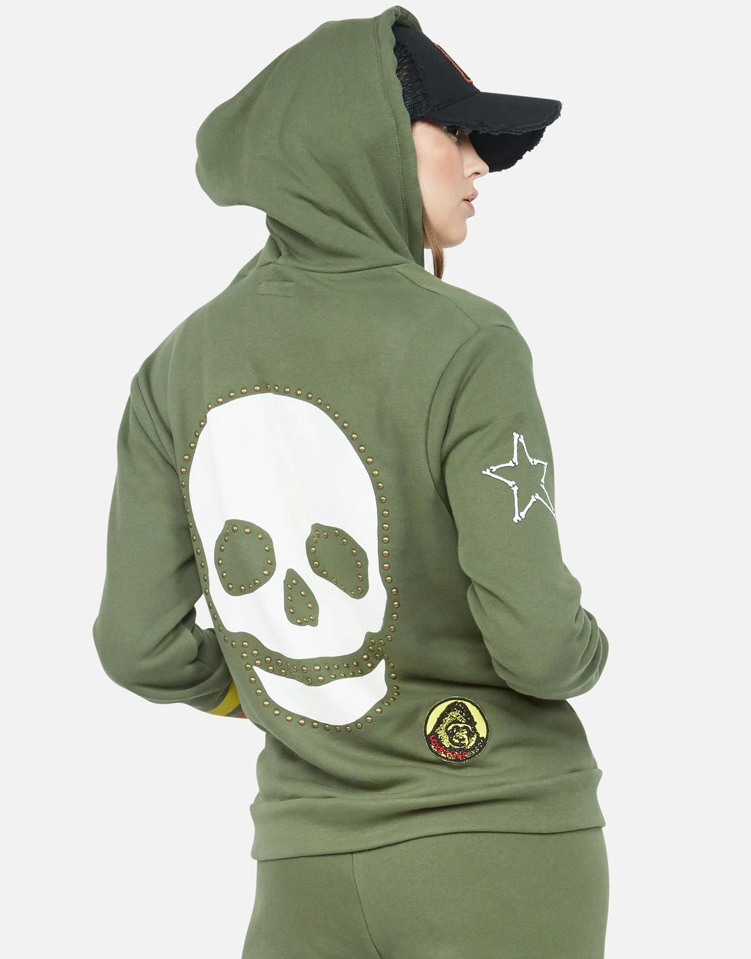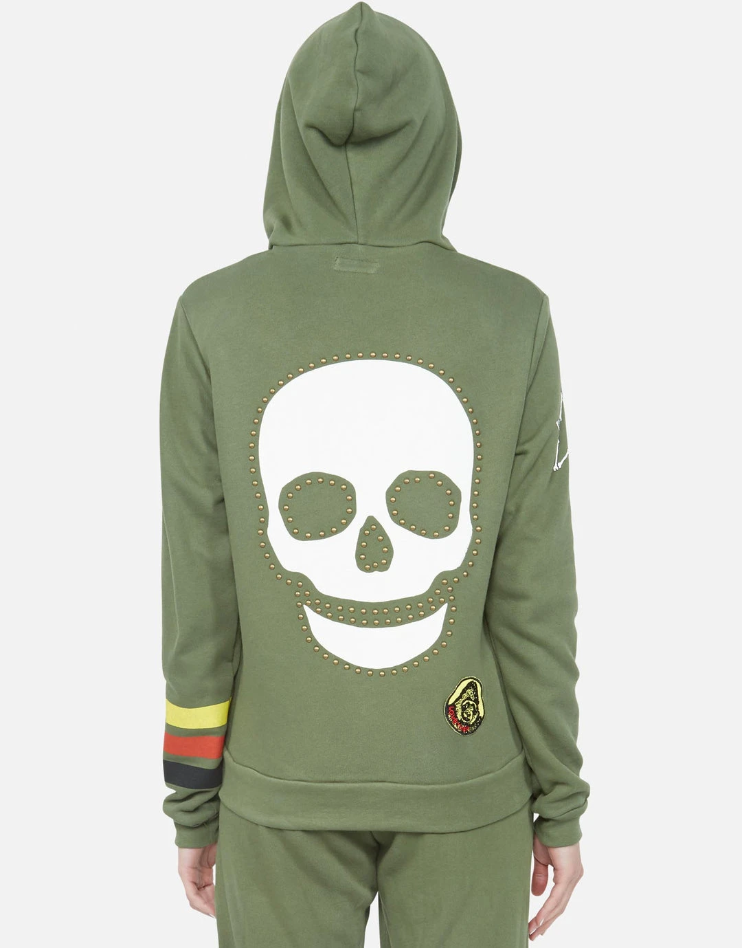 Stud Skull Printed on Super Soft Lightweight Pullover Hoodie in Military by Lauren Moshi.