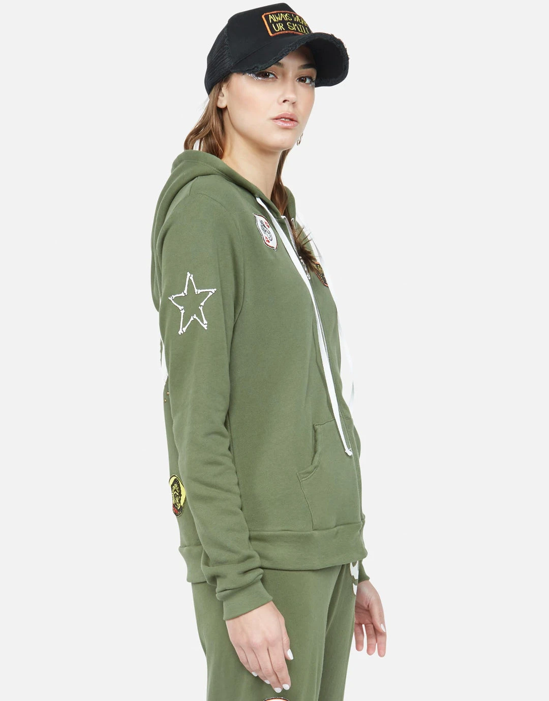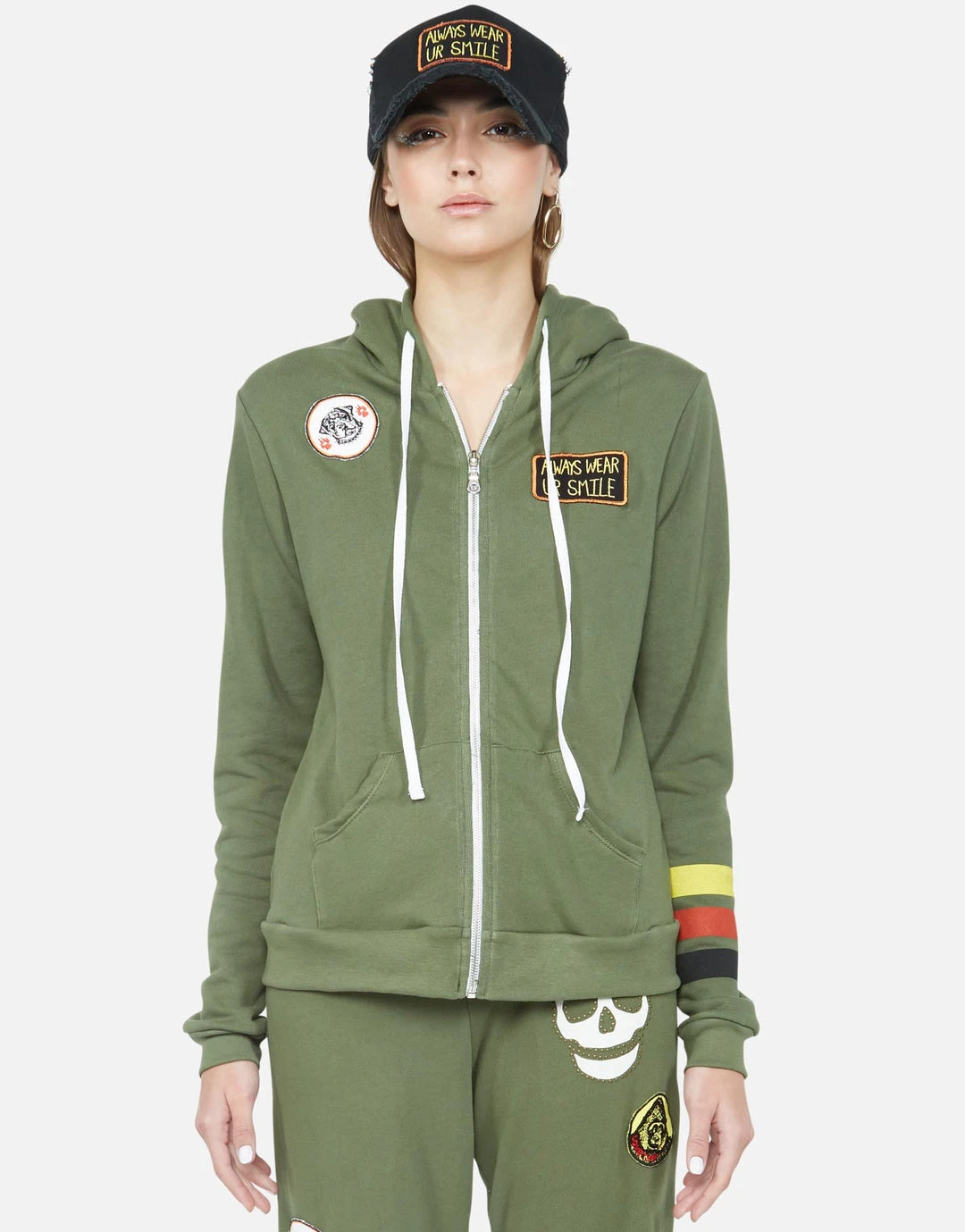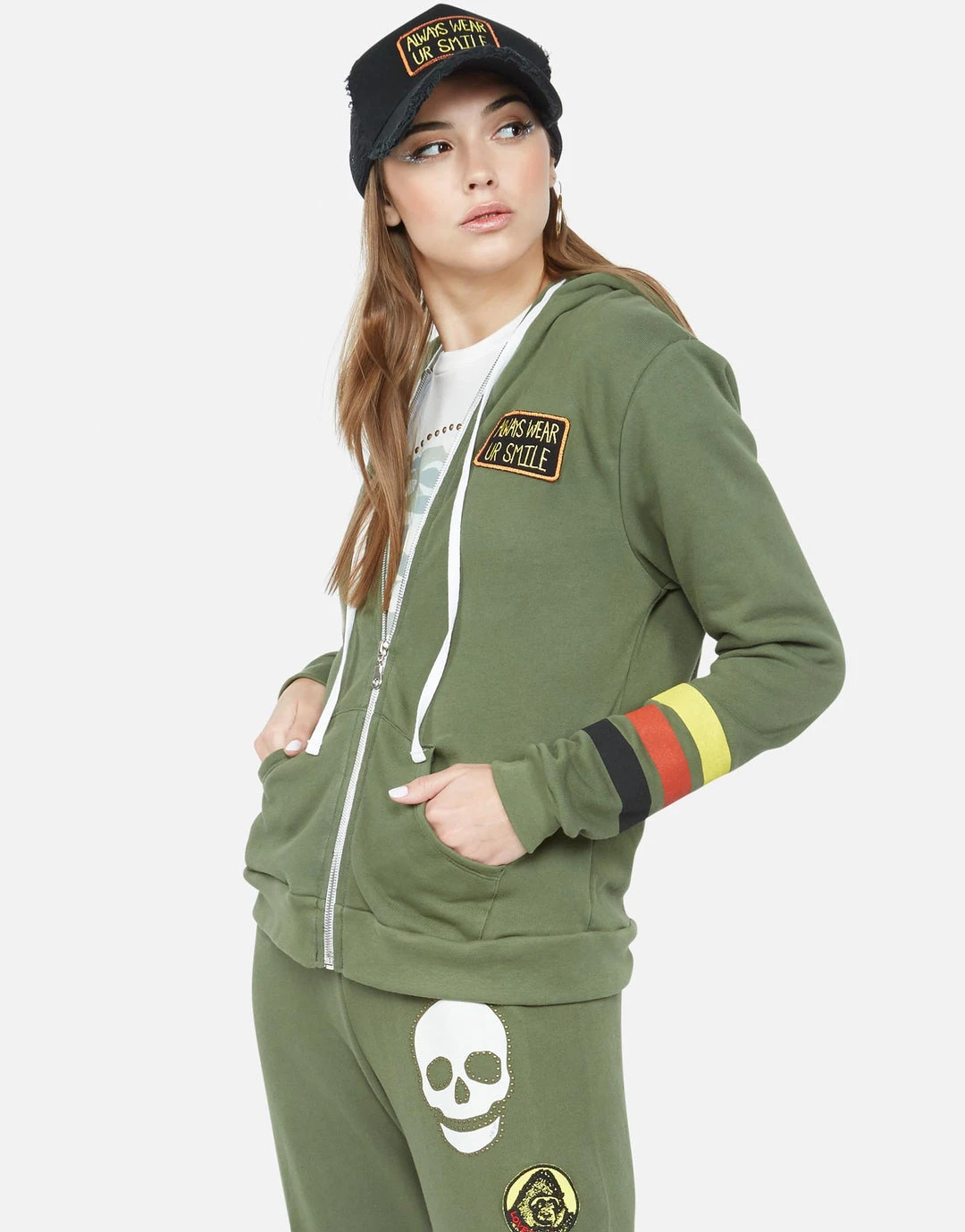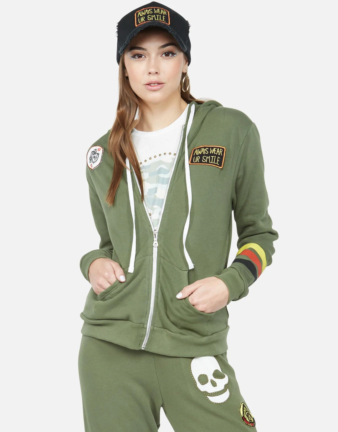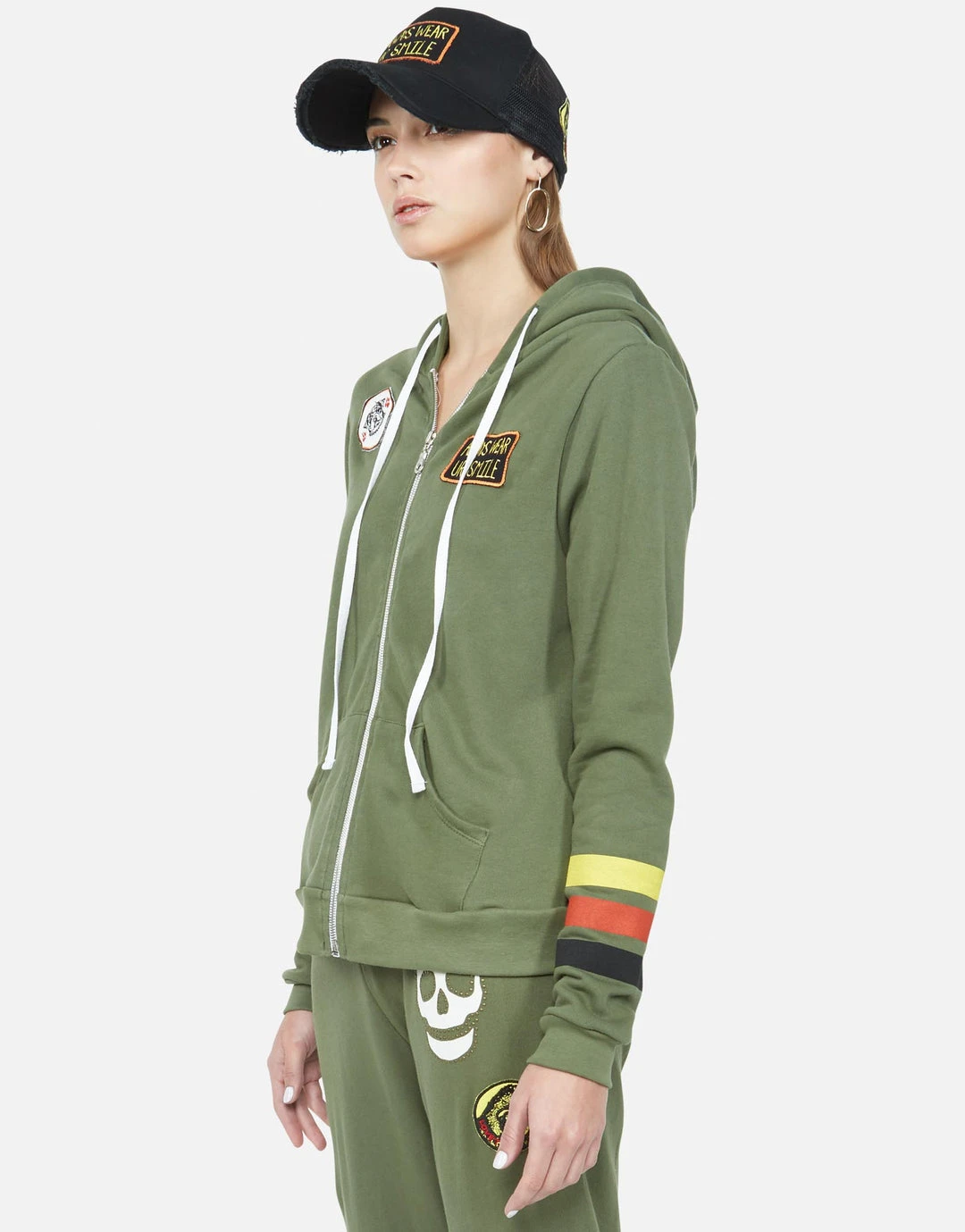 Stud Skull Printed on Super Soft Lightweight Pullover Hoodie in Military by Lauren Moshi.