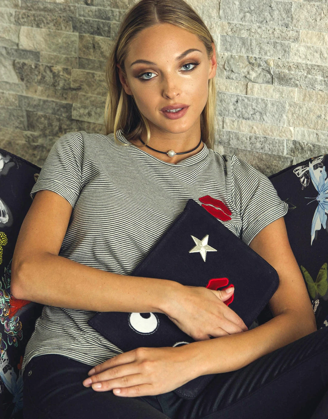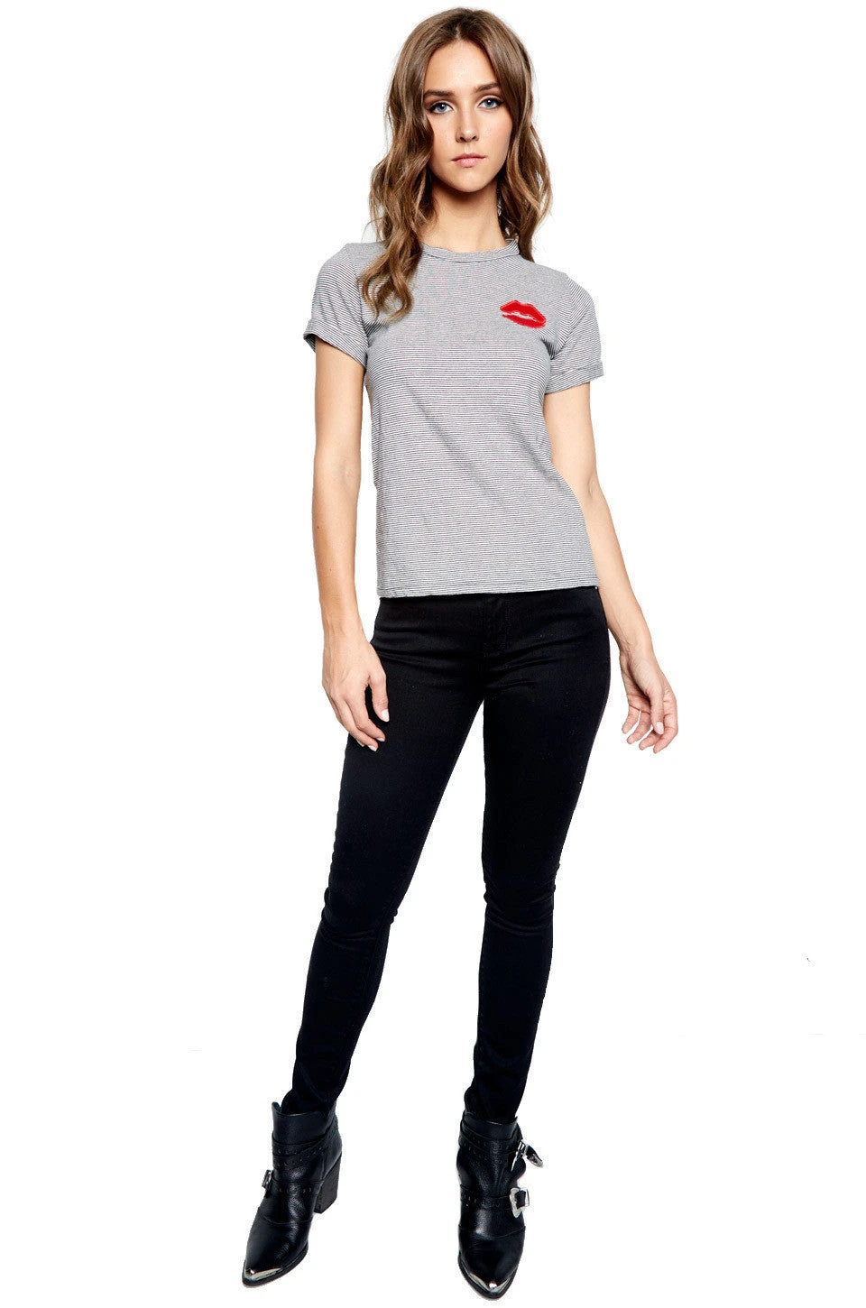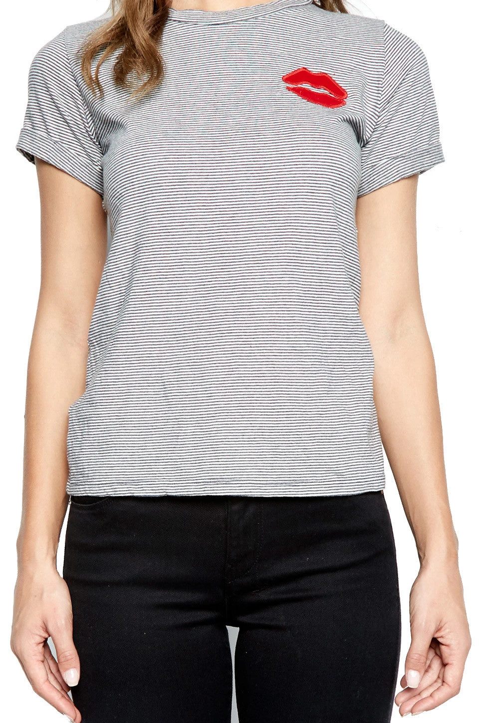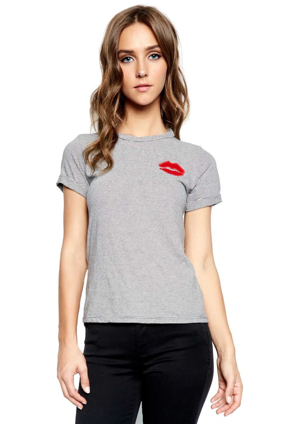 Red Mouth Patch Short Sleeve Women’s Roll Up Tee in Olive Stripe by Lauren Moshi.
