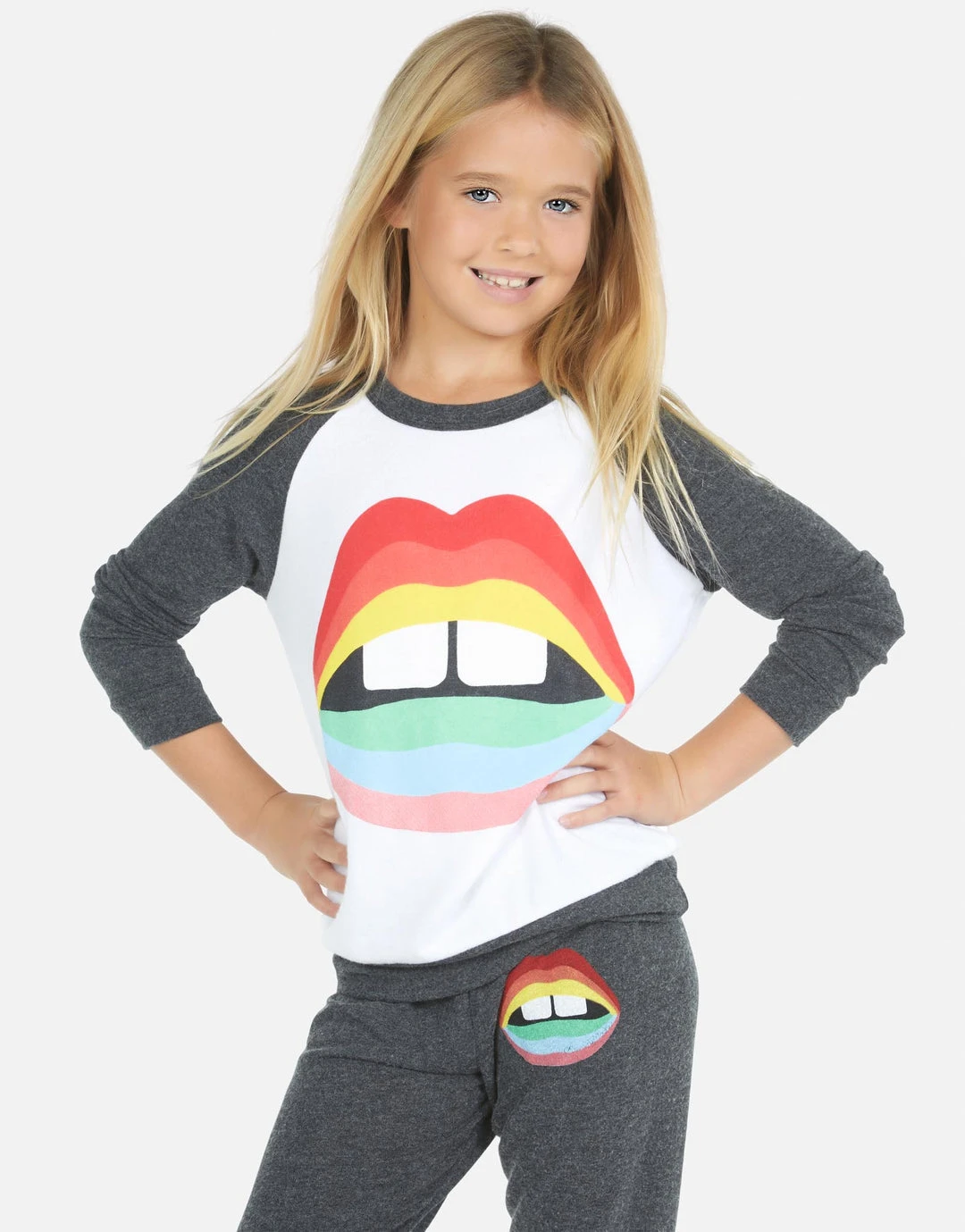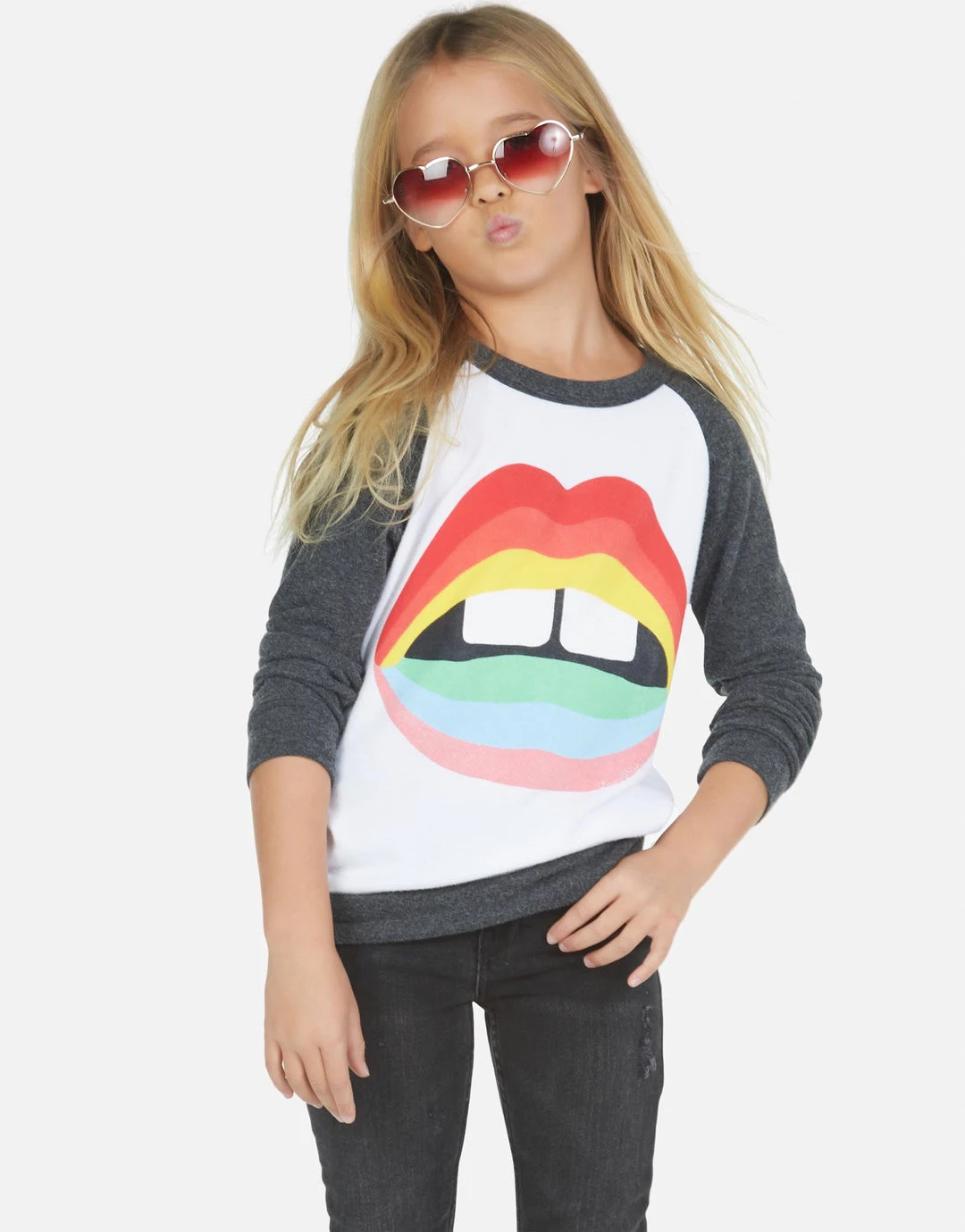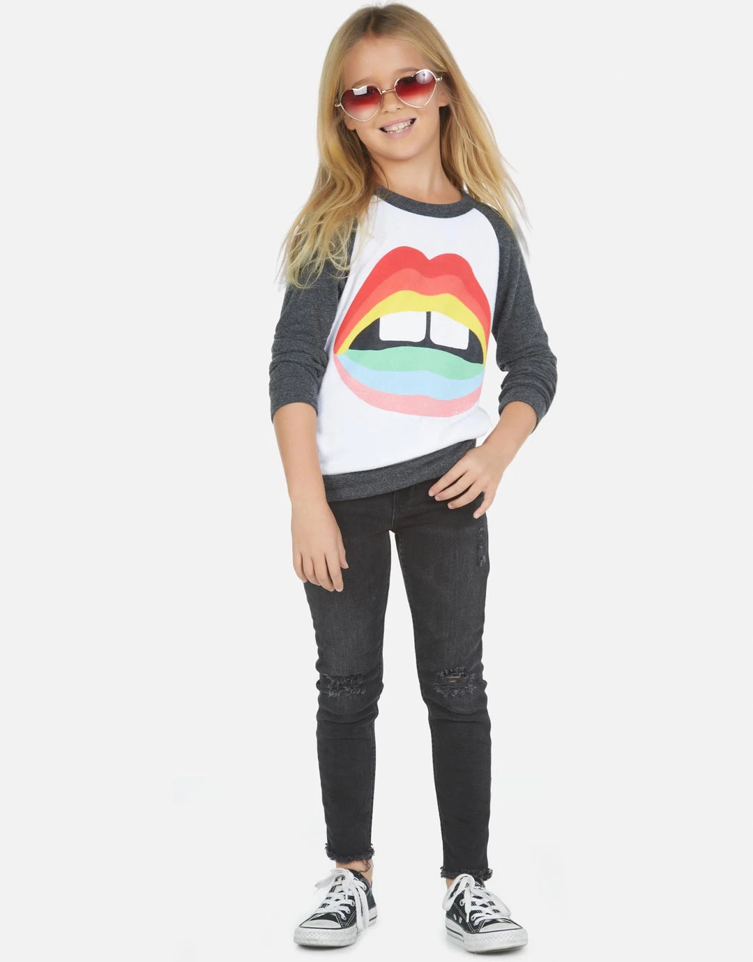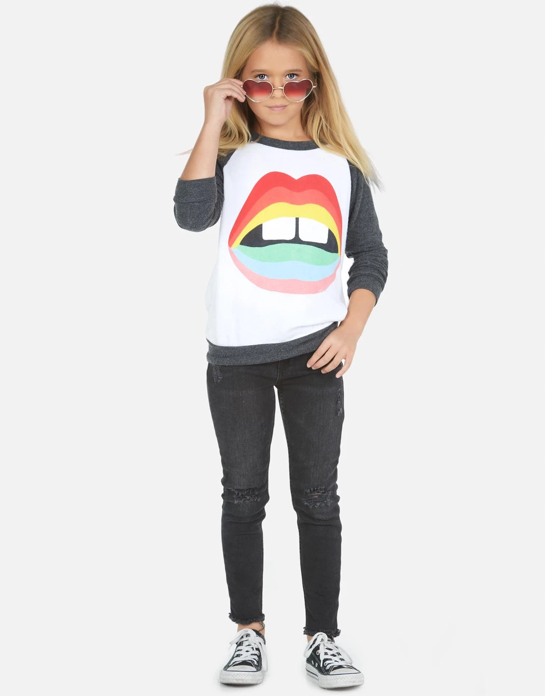 Rainbow Gap Mouth Printed on Ultra Soft Lightweight Raglan in White/Heather Black by Lauren Moshi.