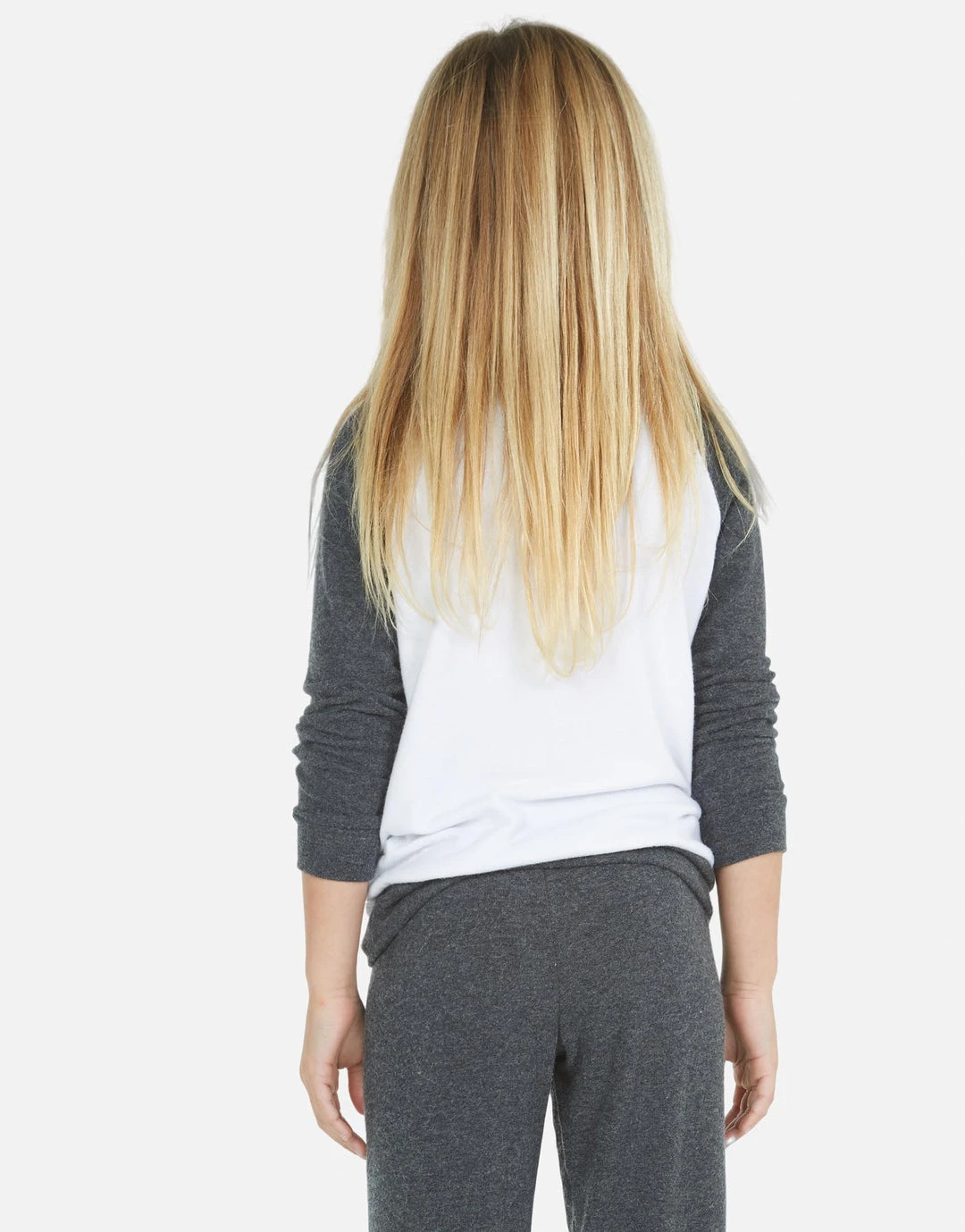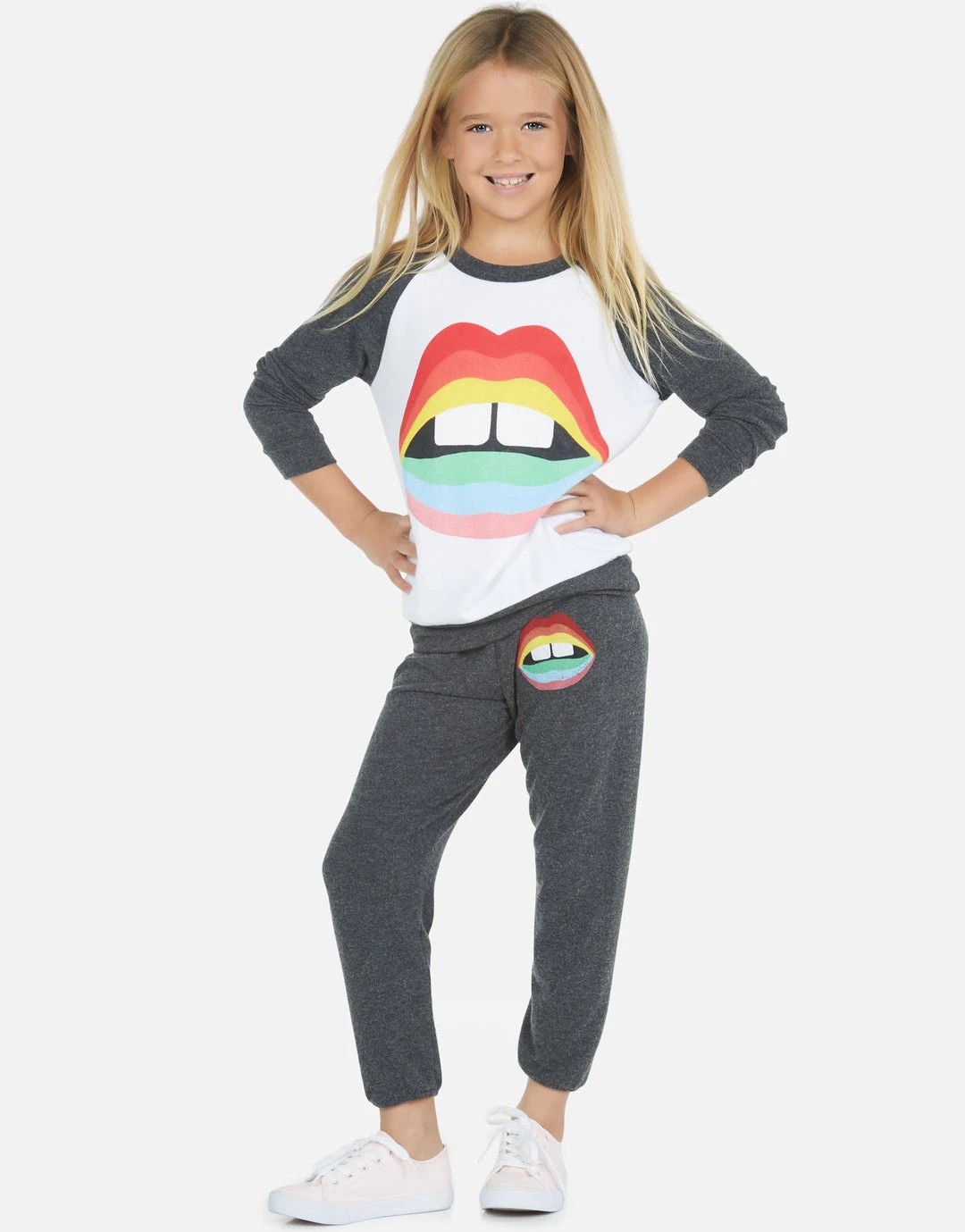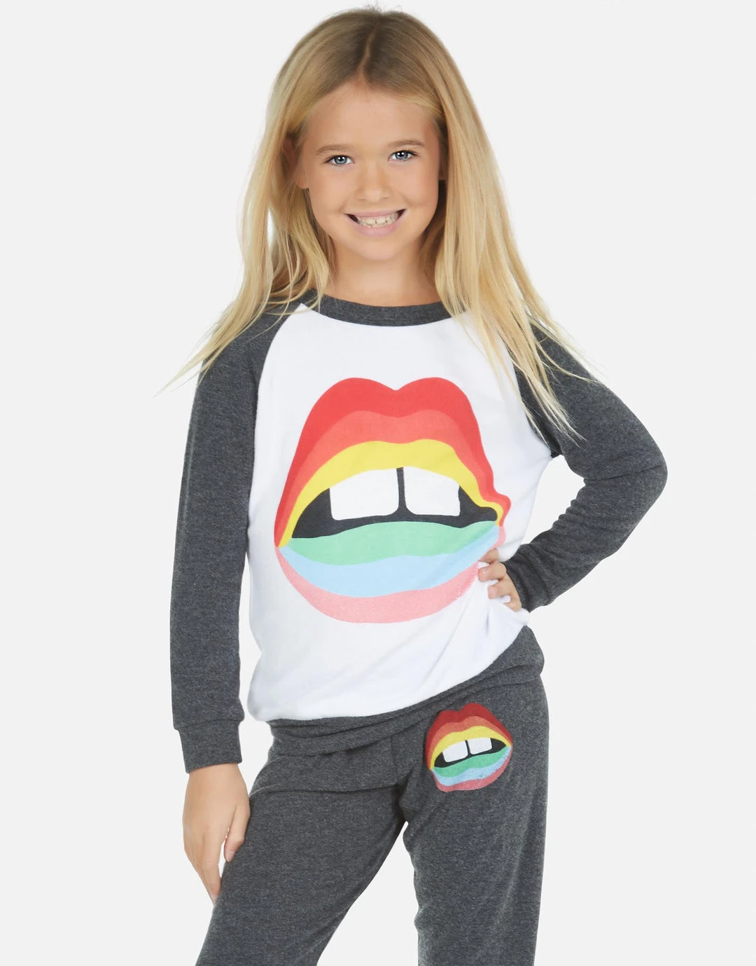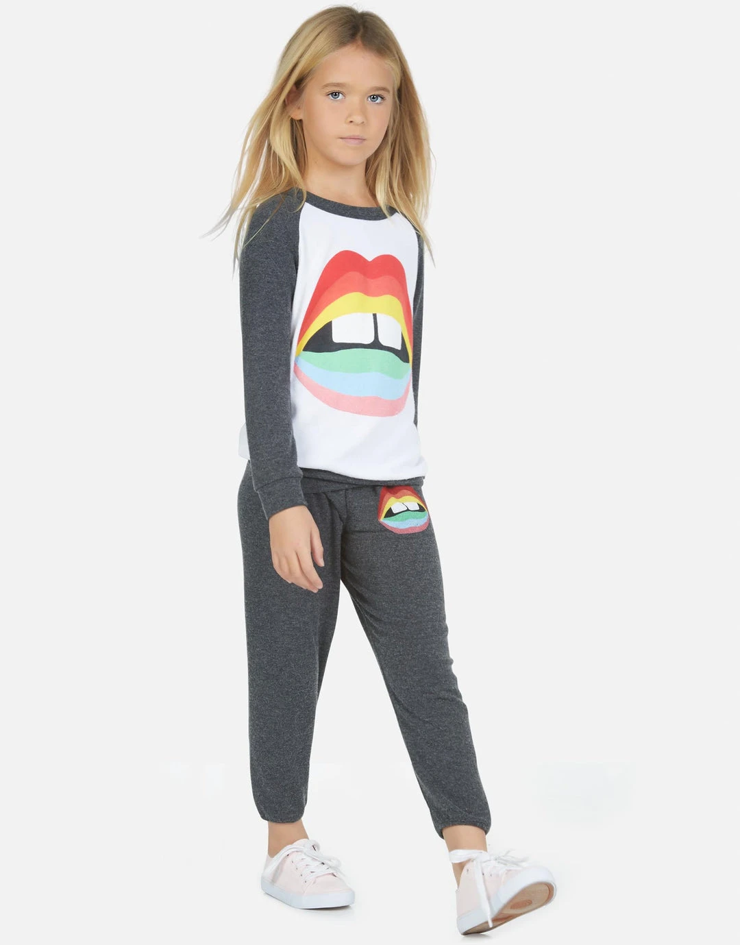 Rainbow Gap Mouth Printed on Ultra Soft Lightweight Raglan in White/Heather Black by Lauren Moshi.
