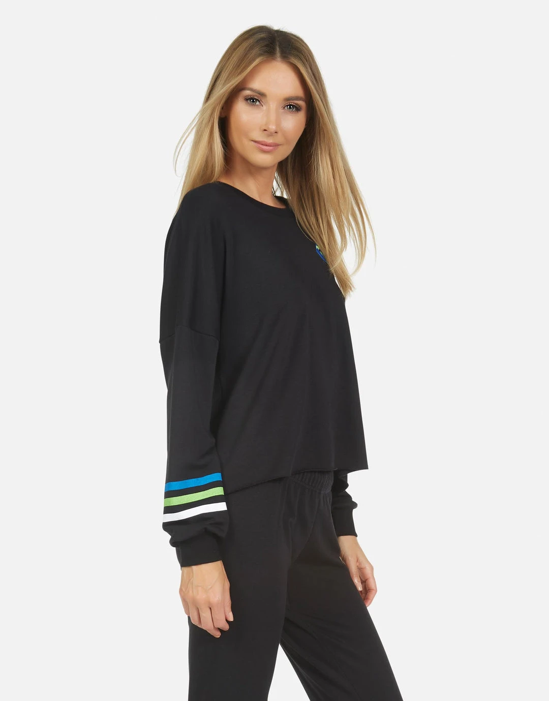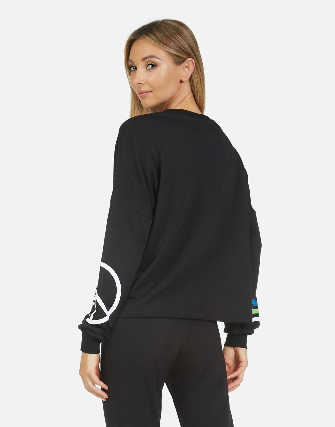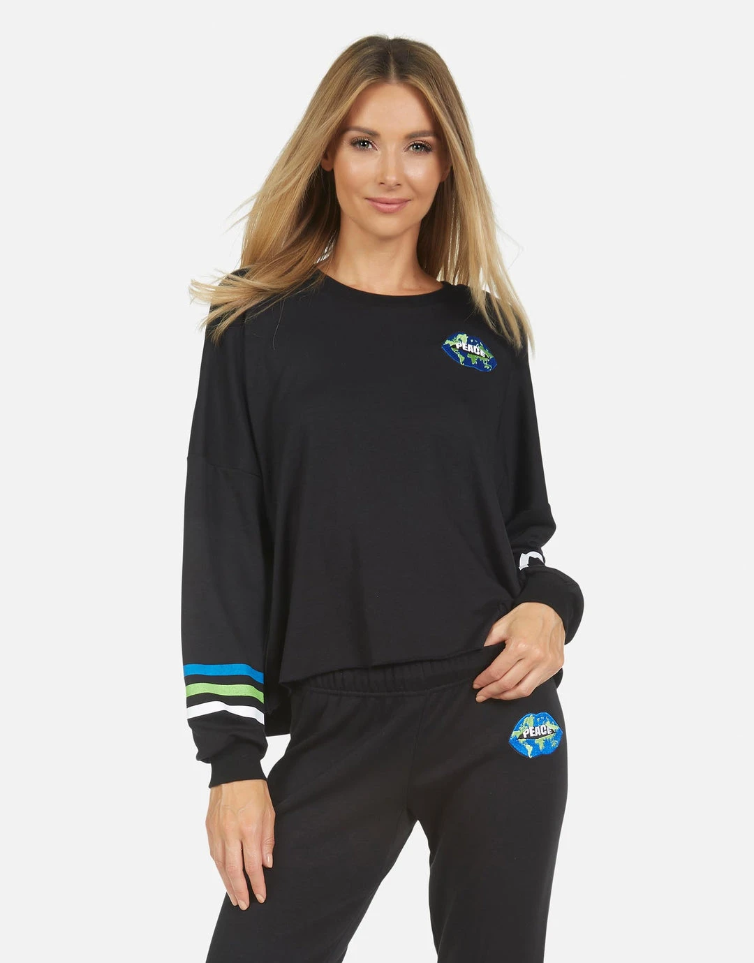 World Peace Lips Printed on Ultra Soft Lightweight Pullover in Black by Lauren Moshi.