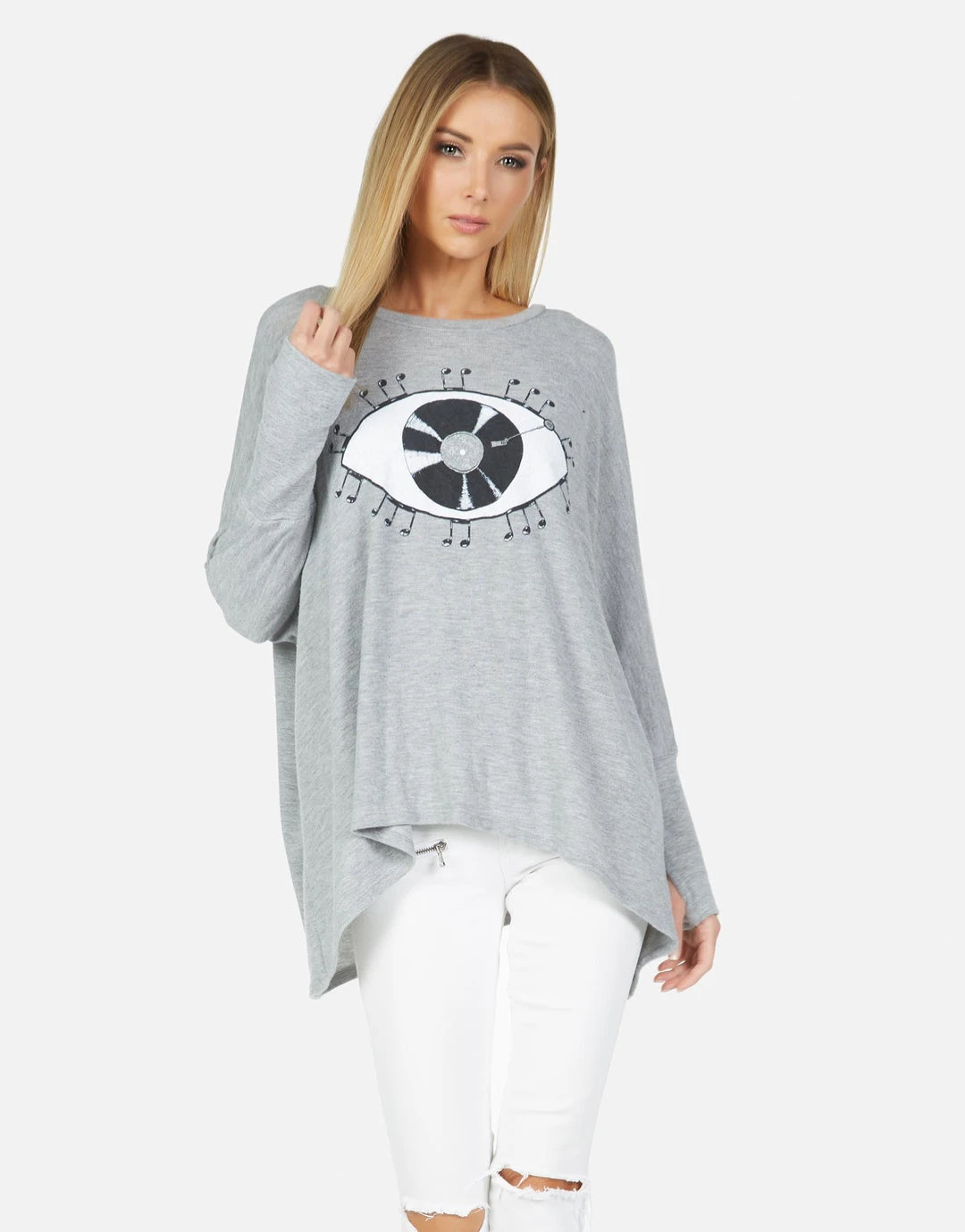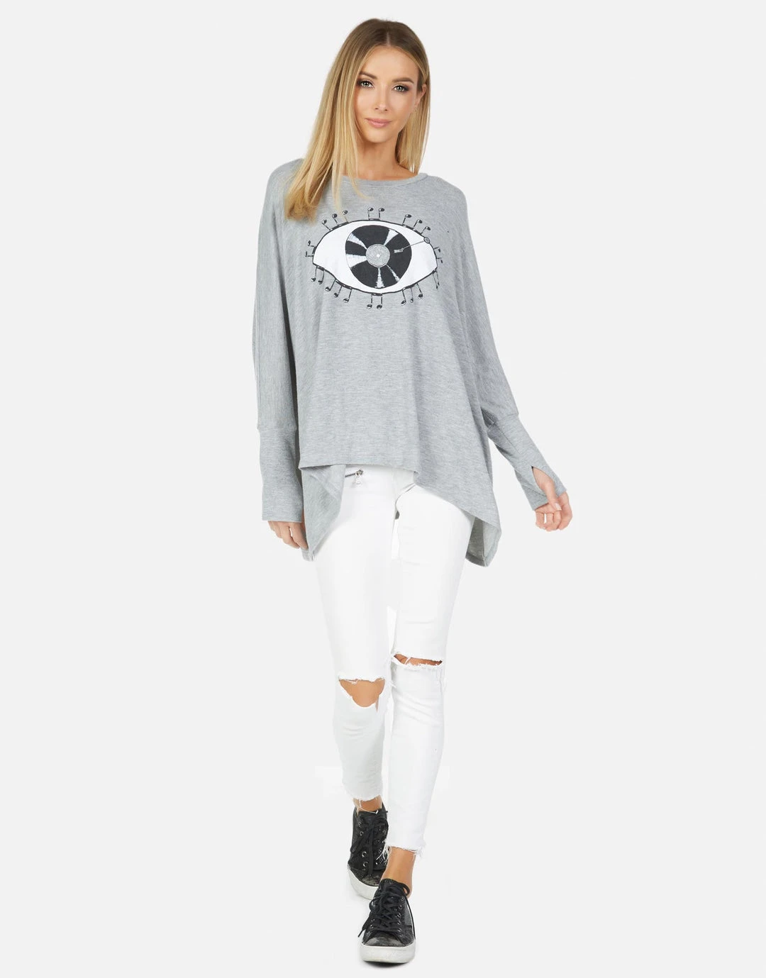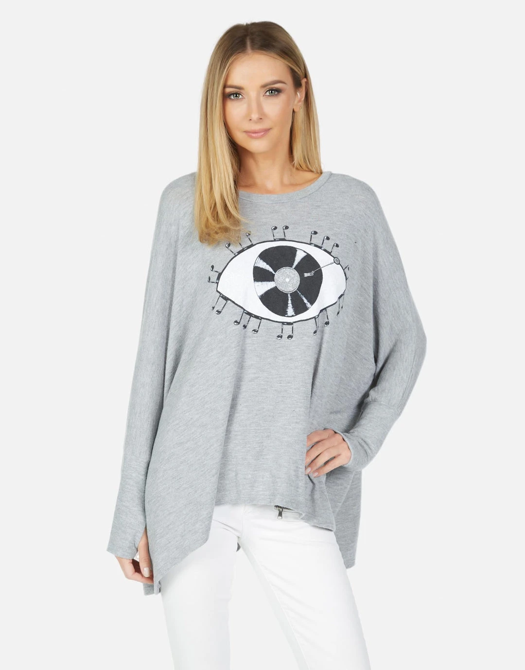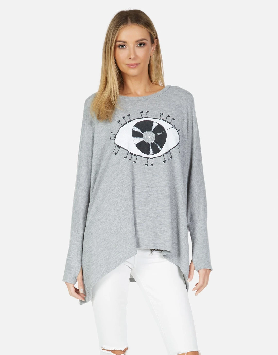 Record Eye Printed on Ultra Soft Lightweight Pullover in Heather Grey by Lauren Moshi.