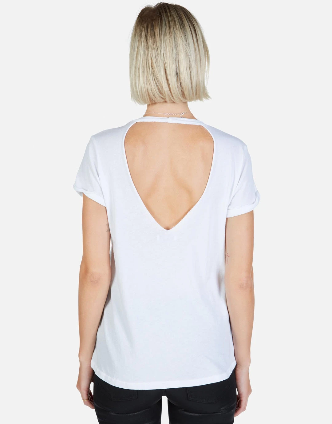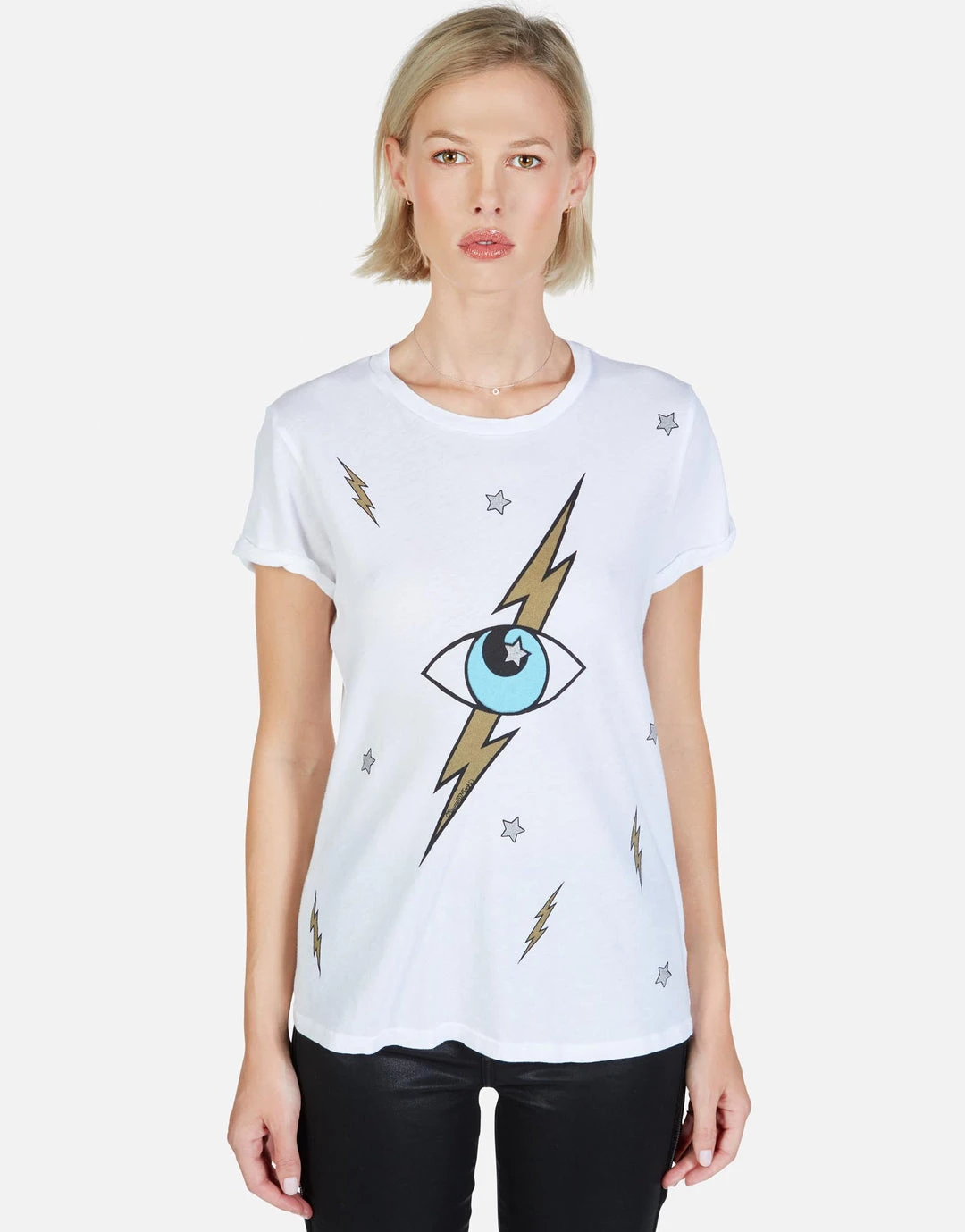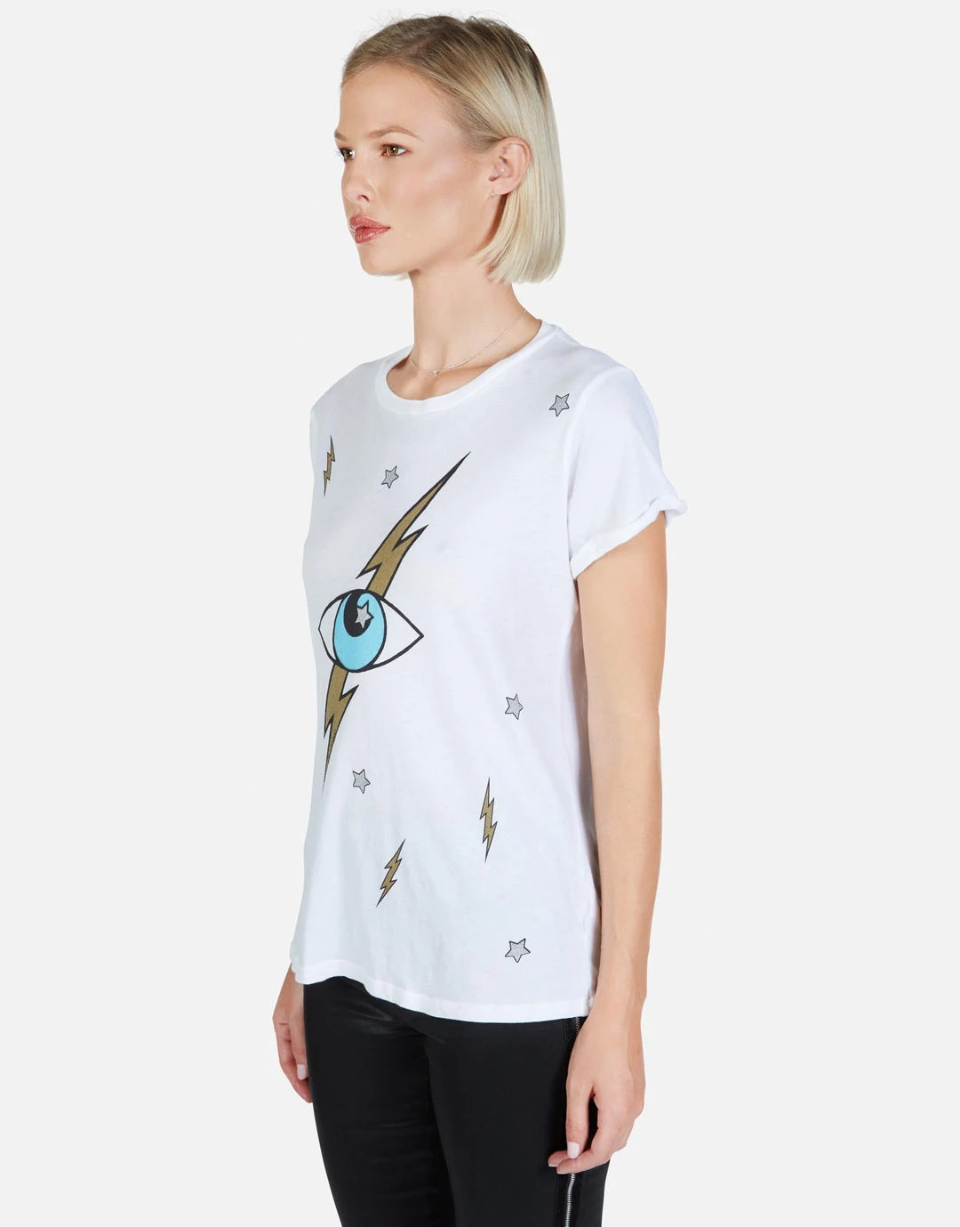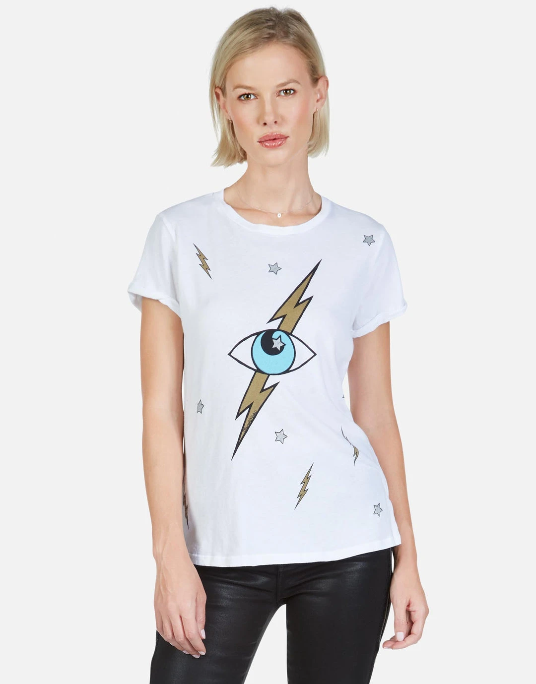 Lightning Storm Eye Printed on Ultra Soft Lightweight V-Back Tee in White by Lauren Moshi.