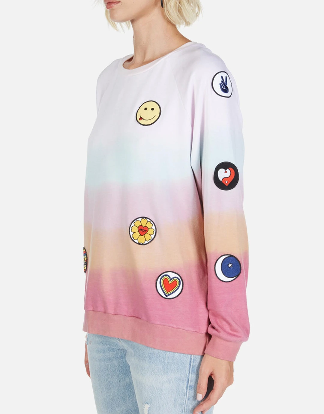 Hippie Peace Love Patches on Ultra Soft Lightweight Pullover in Harvest Moon by Lauren Moshi.