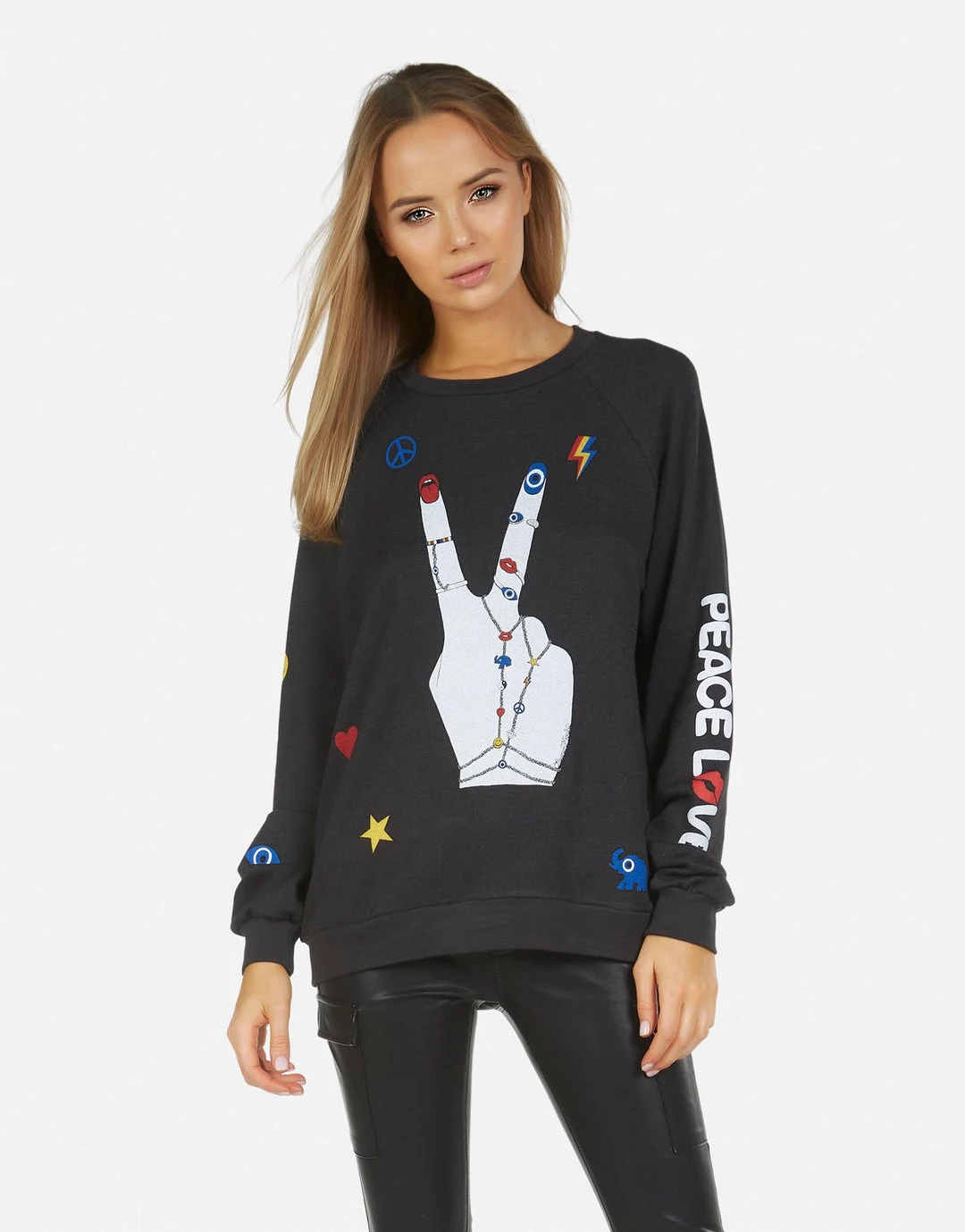 Peace Hand Elements Printed on Ultra Soft Lightweight Pullover in Onyx by Lauren Moshi.