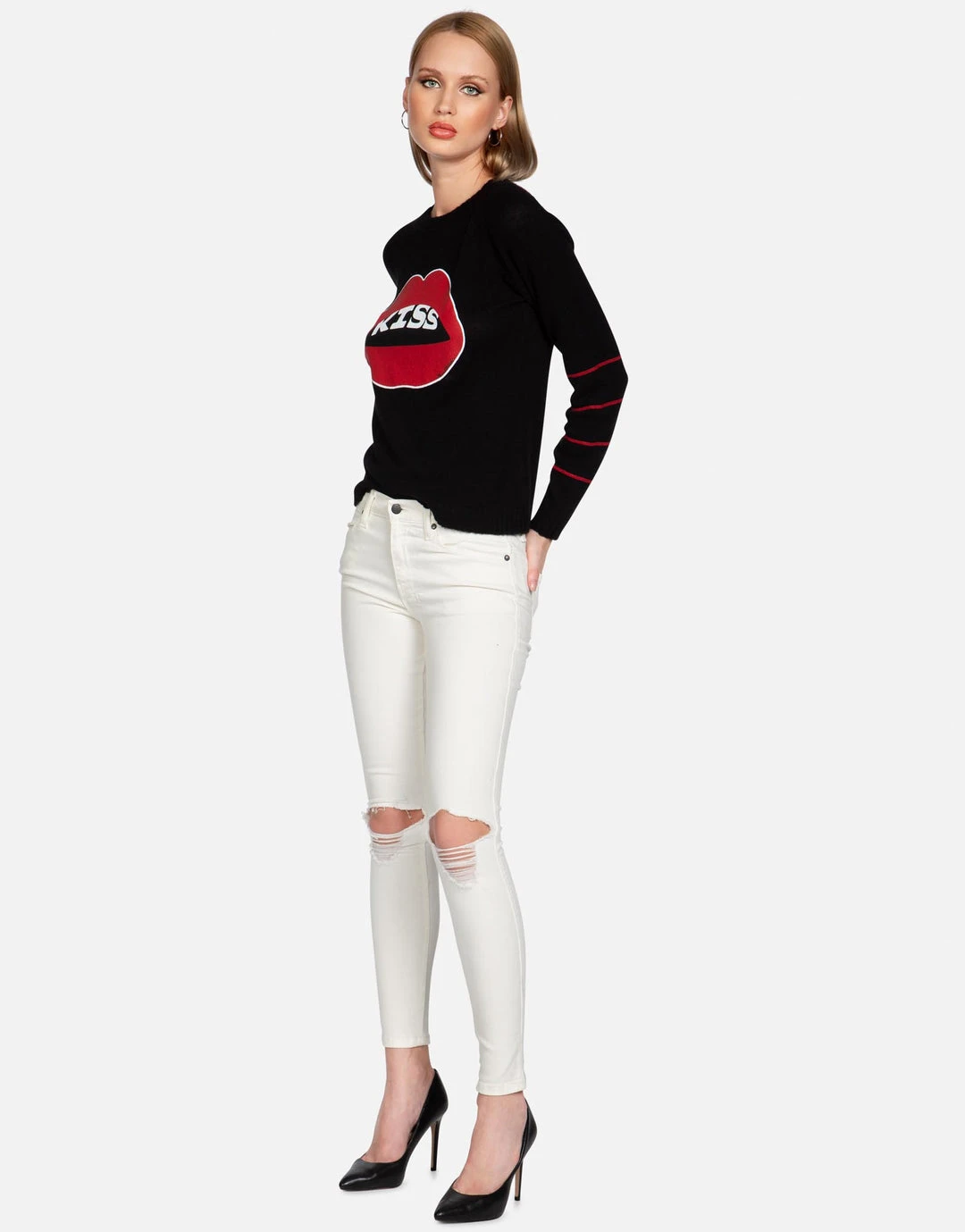 Kiss Lip Printed on Ultra Soft Lightweight Cashmere Sweater in Black by Lauren Moshi.