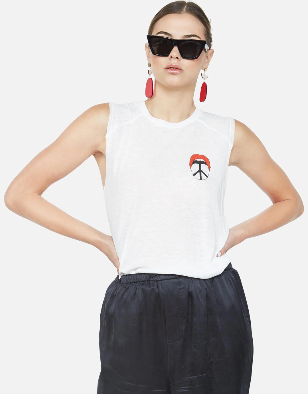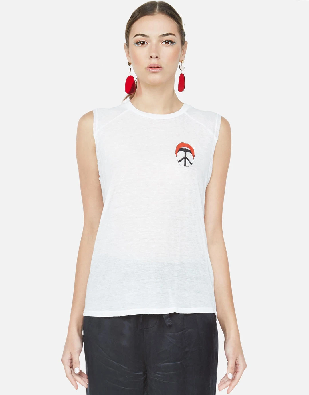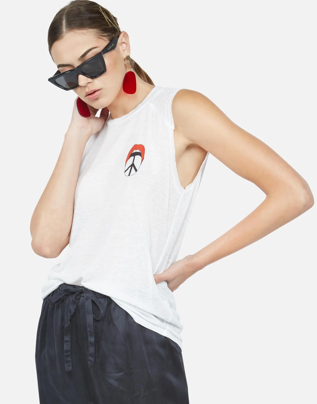 Peace Tongue Printed on Ultra Soft Lightweight Tank in White by Lauren Moshi.