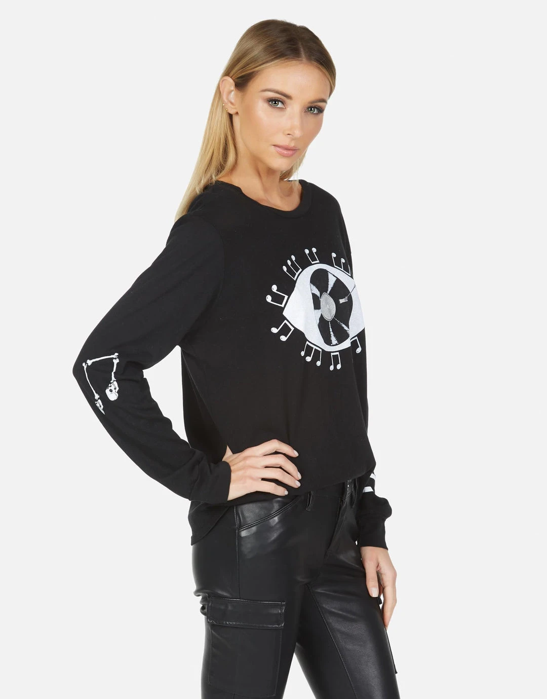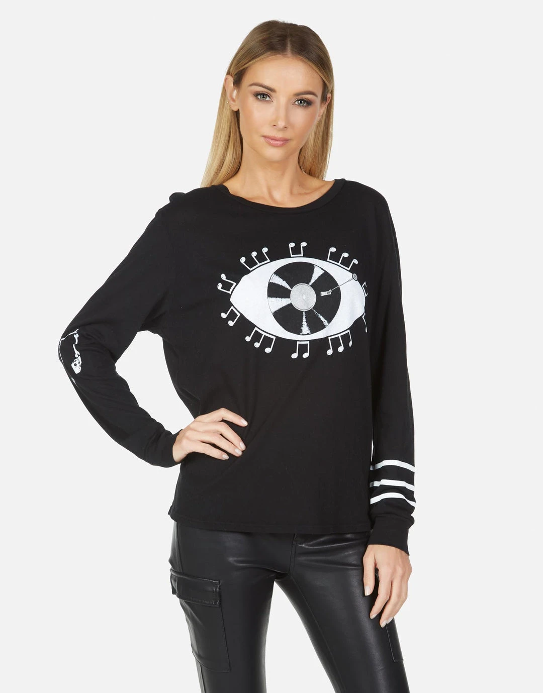 Record Eye Printed on Ultra Soft Lightweight Pullover in Black by Lauren Moshi.