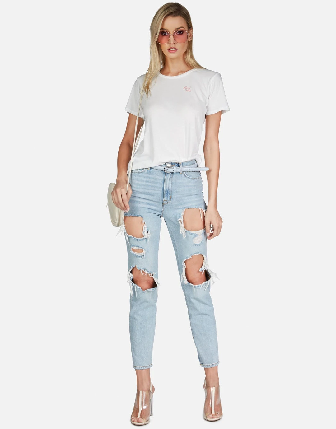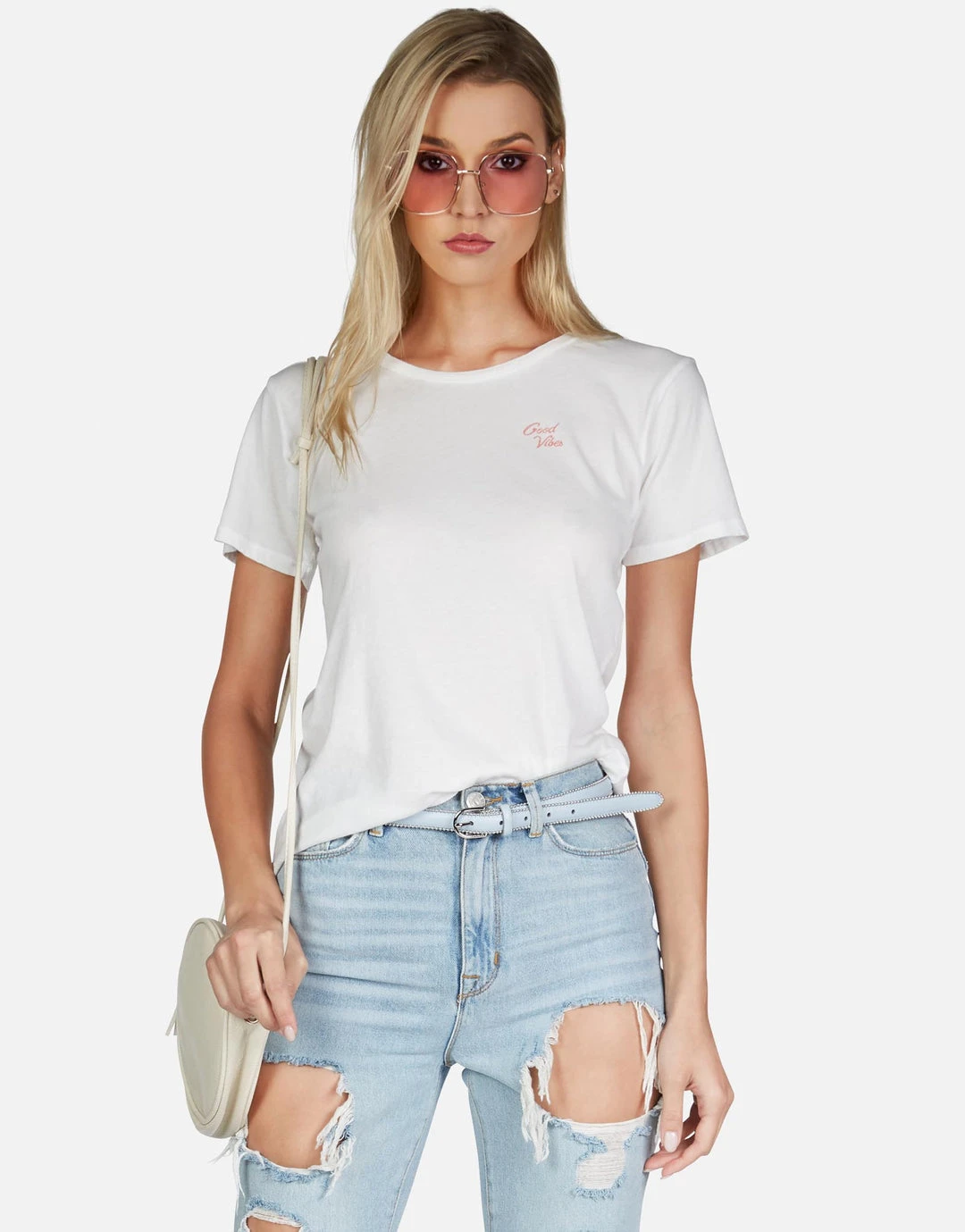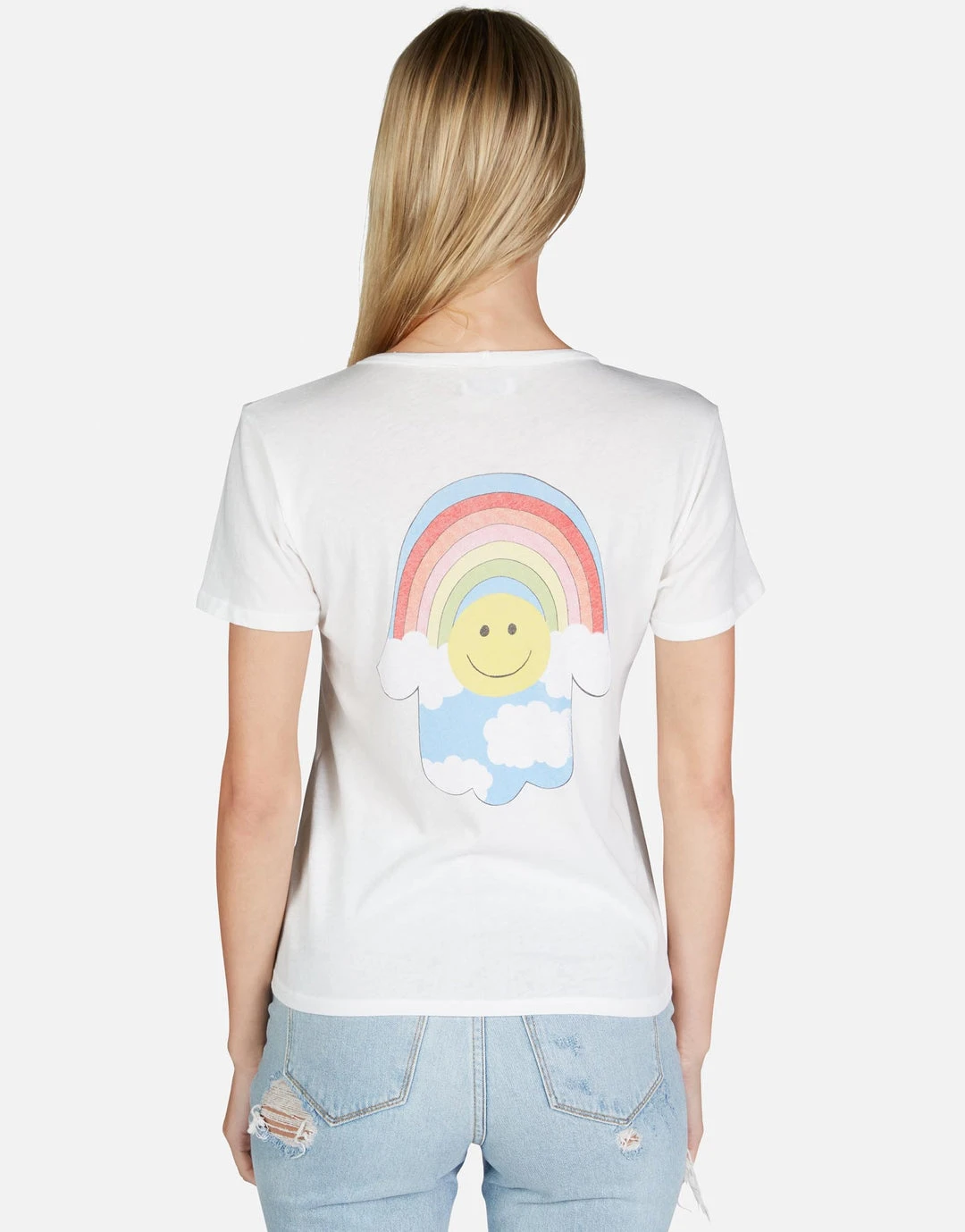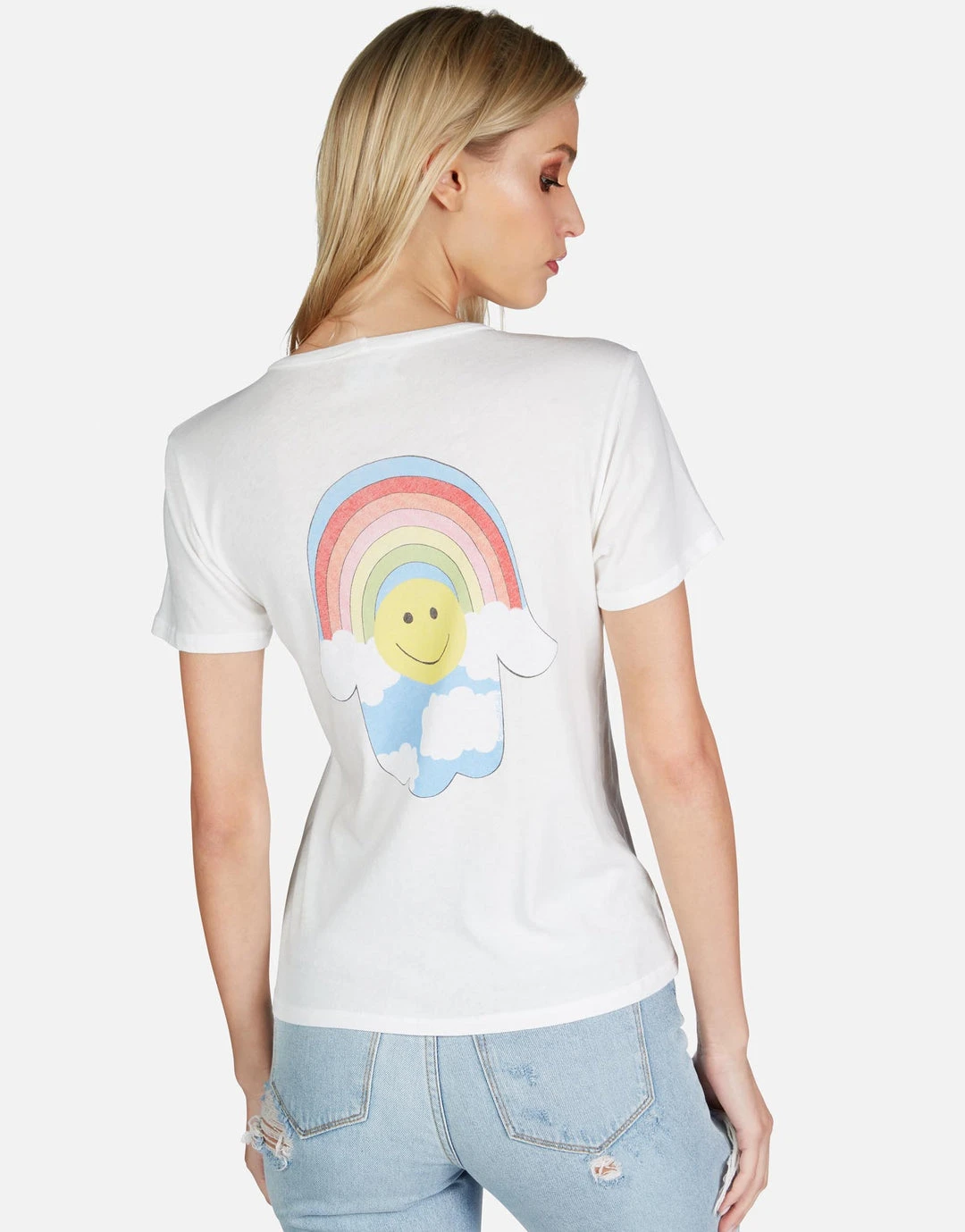 Good Vibes Happy Cloud Hamsa Printed on Ultra Soft Lightweight Tee in Milk by Lauren Moshi.