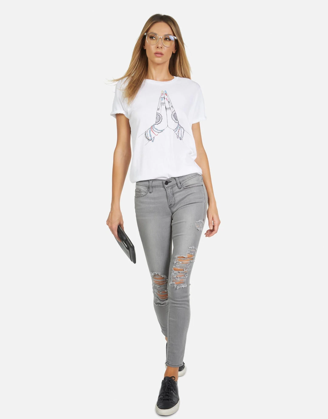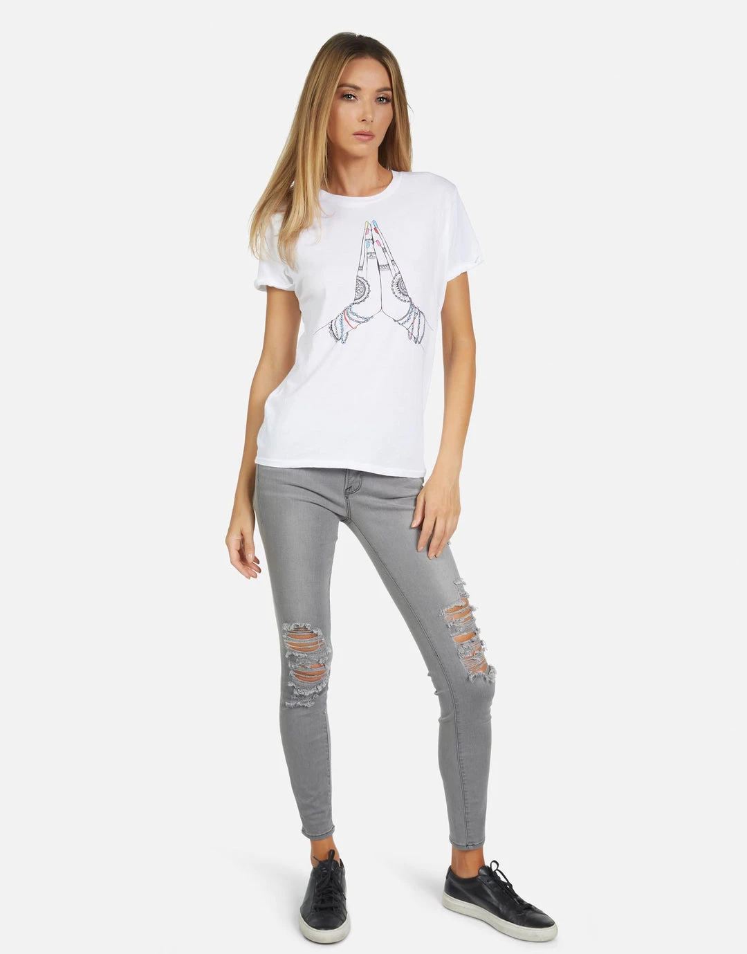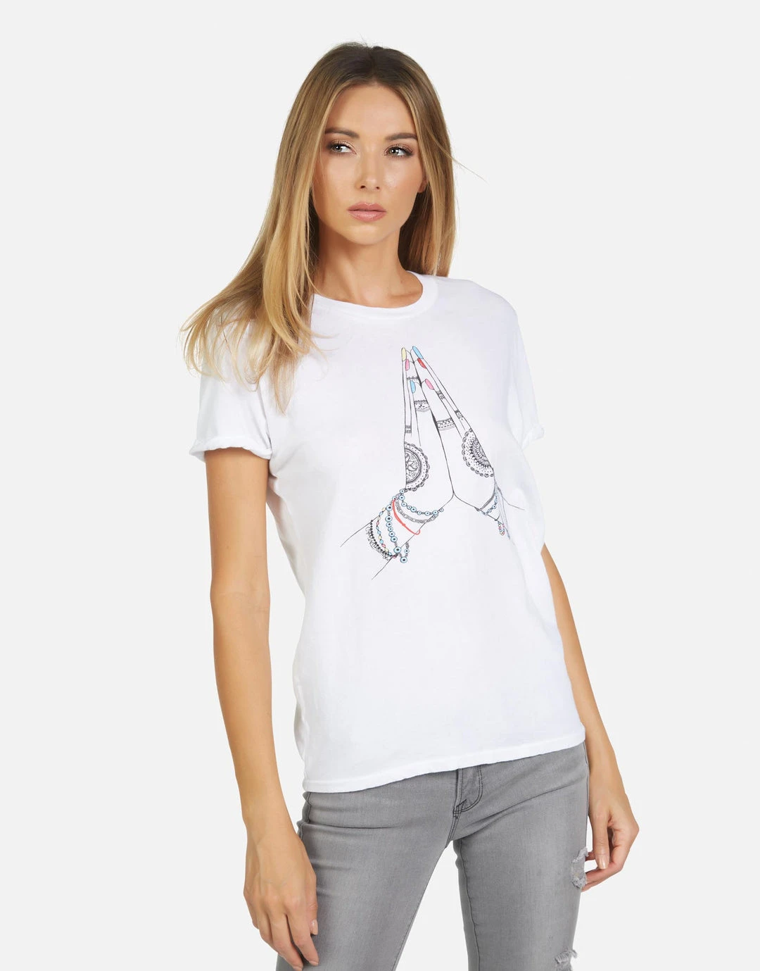 Prayer Hands Printed on Ultra Soft Lightweight Tee in White by Lauren Moshi.