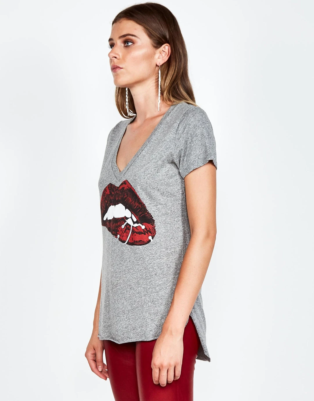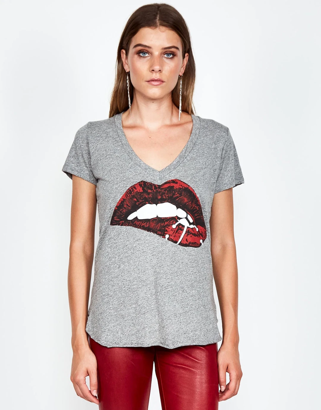 Pierced Biting Lip Printed on Ultra Soft Lightweight Tee in Heather Grey by Lauren Moshi.