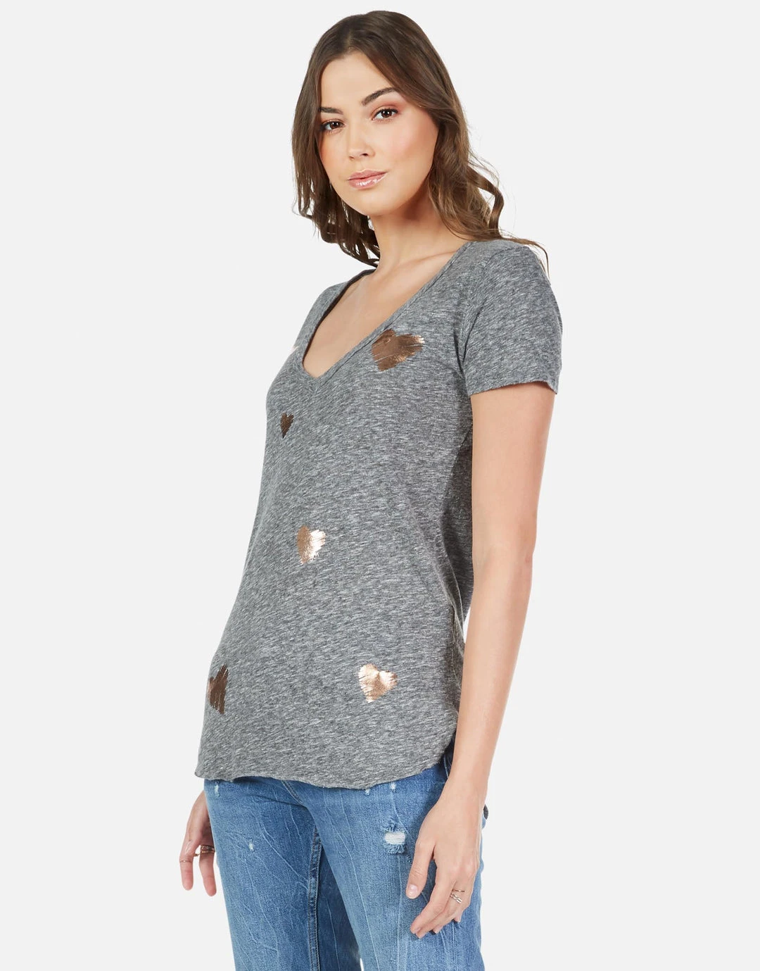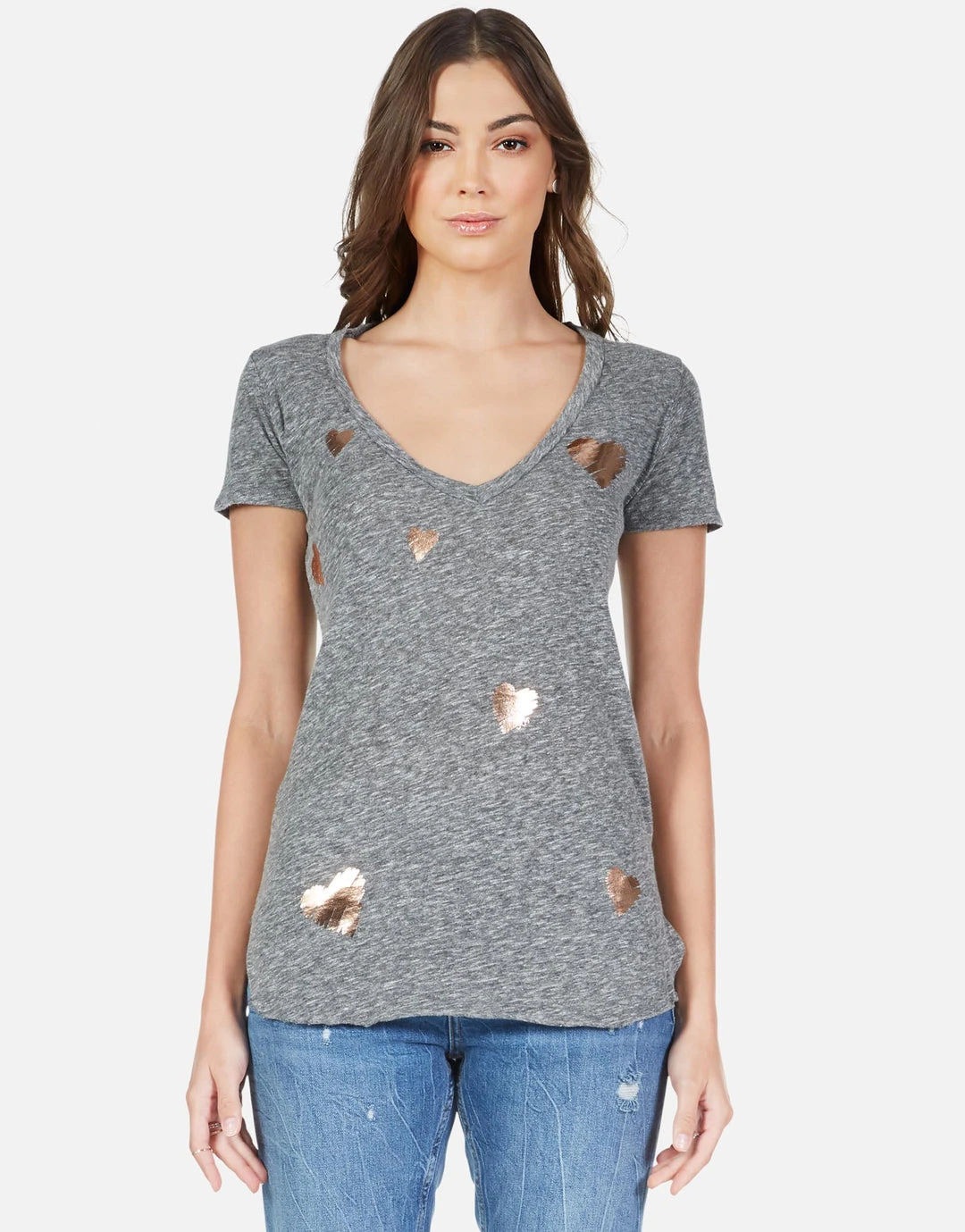 Rose Gold Foil Scribble Hearts Printed on Ultra Soft Lightweight Tee in Heather Grey by Lauren Moshi.
