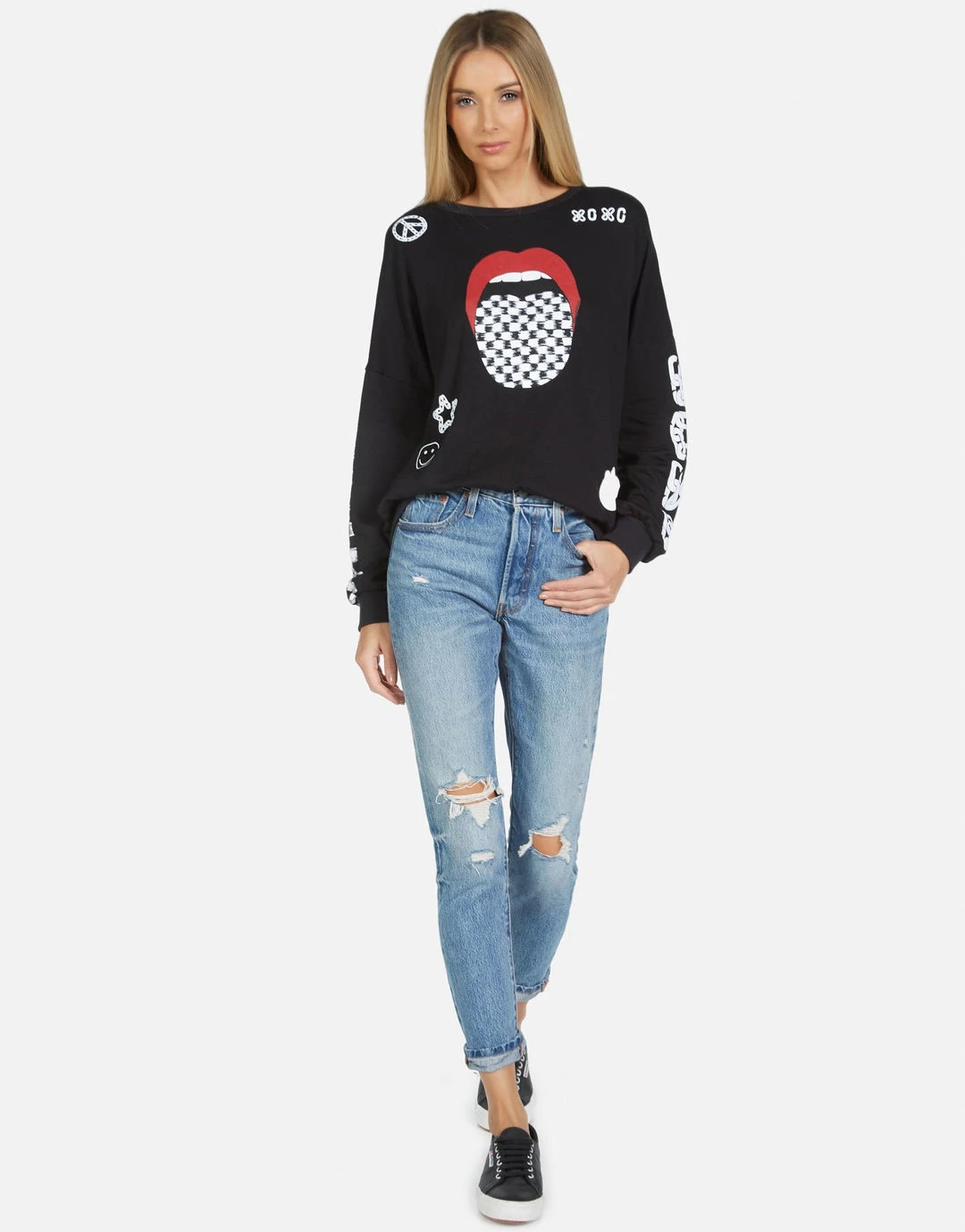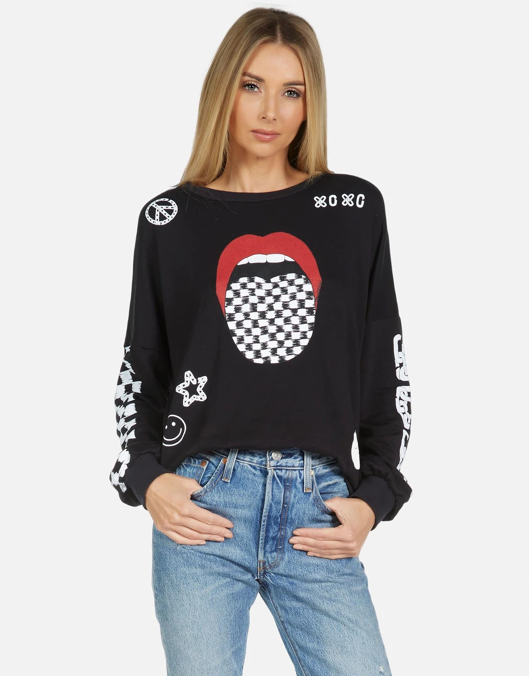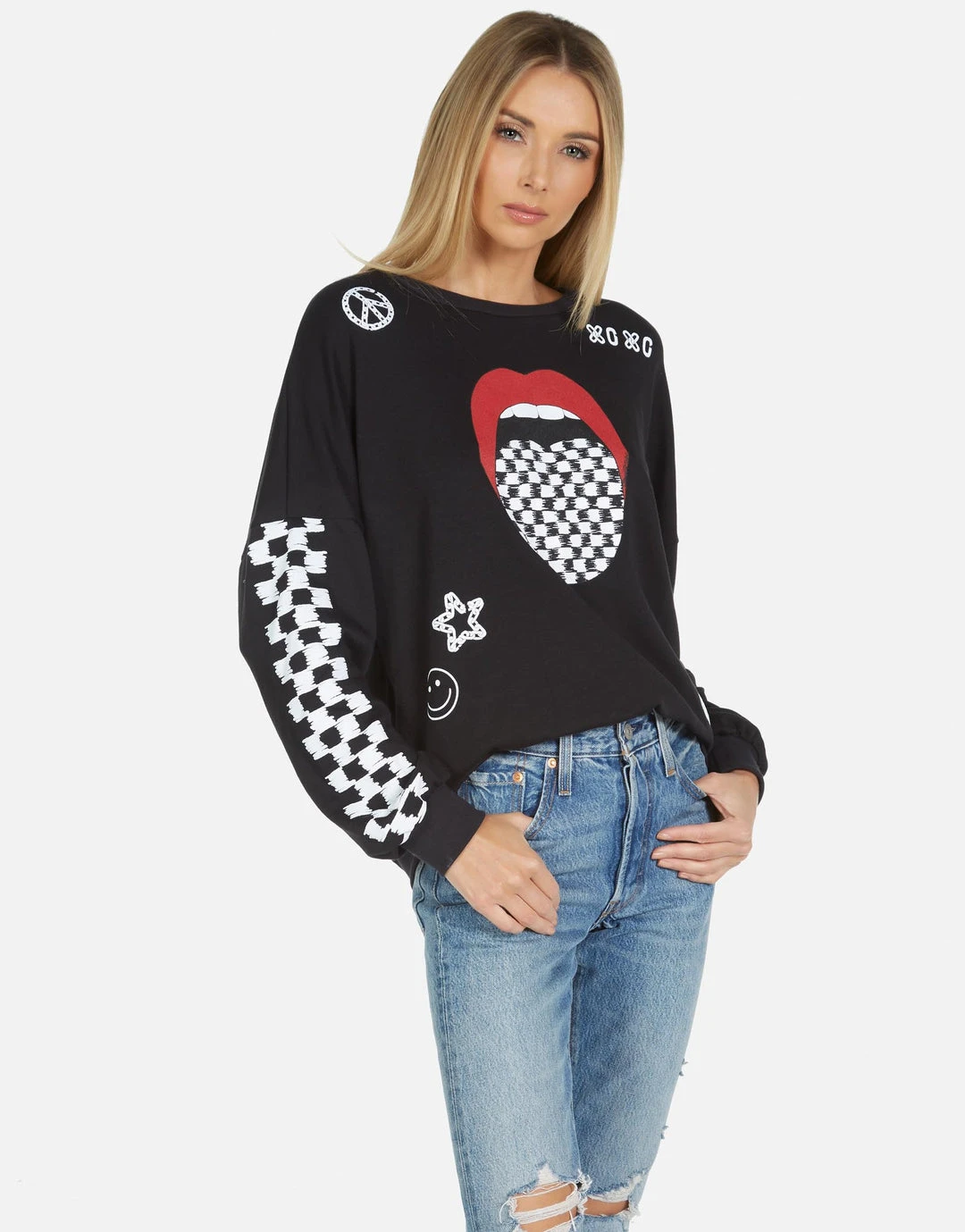 Checker Tongue Printed on Ultra Soft Lightweight Pullover in Black by Lauren Moshi.