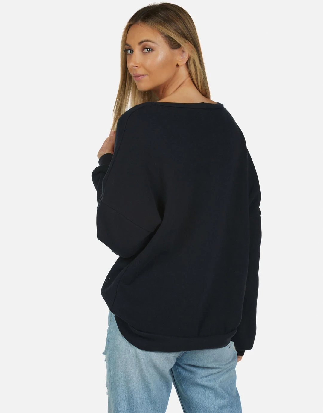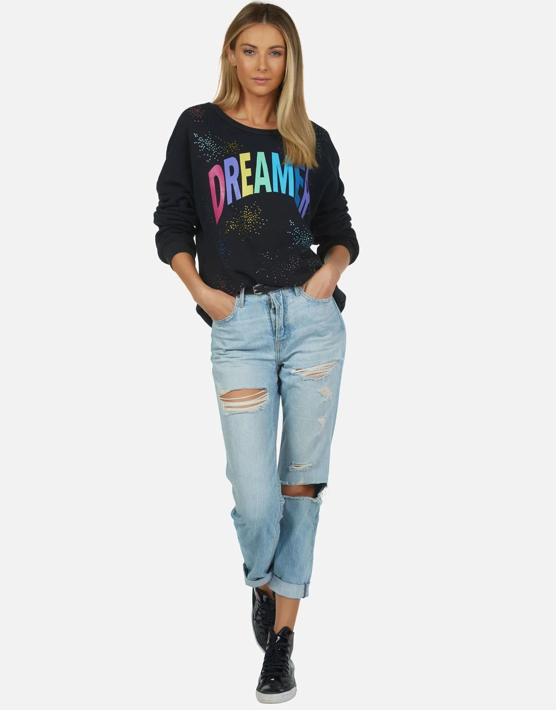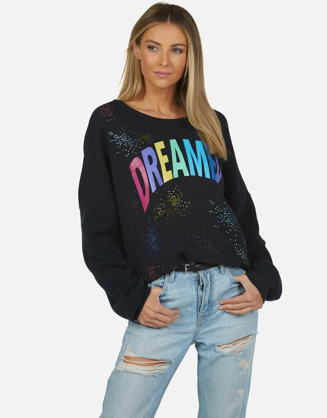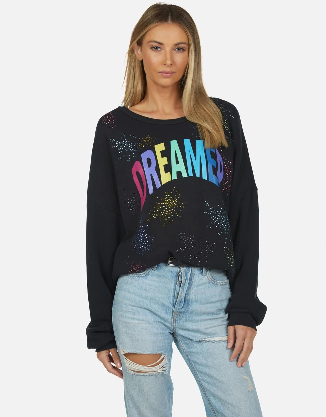 Dreamer Printed on Ultra Soft Lightweight Pullover in Black by Lauren Moshi.