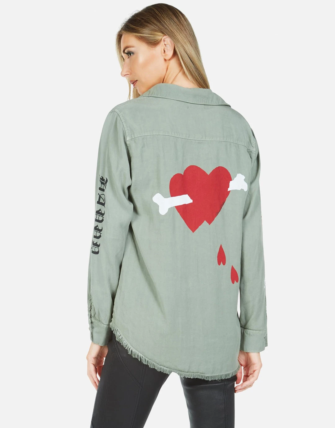 Bone Elements Printed on Ultra Soft Lightweight Button Up Shirt in Pine Green by Lauren Moshi.