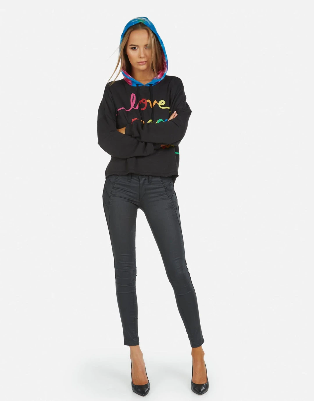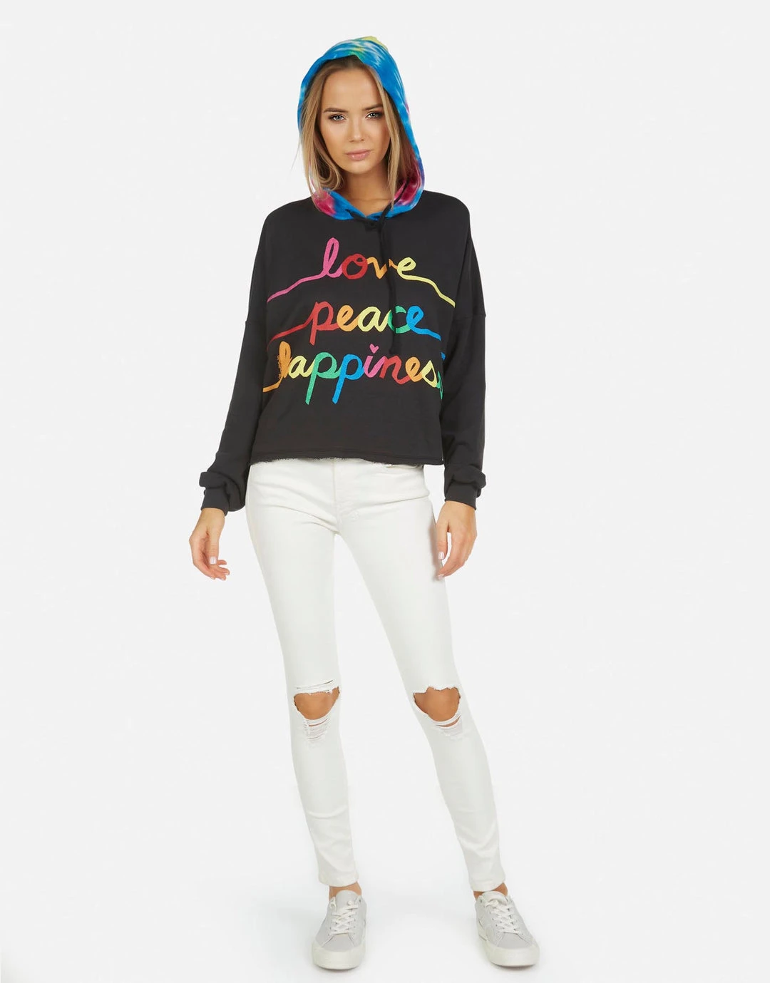 Love Peace Happiness Printed on Ultra Soft Lightweight Hoodie in Black/Candy by Lauren Moshi.
