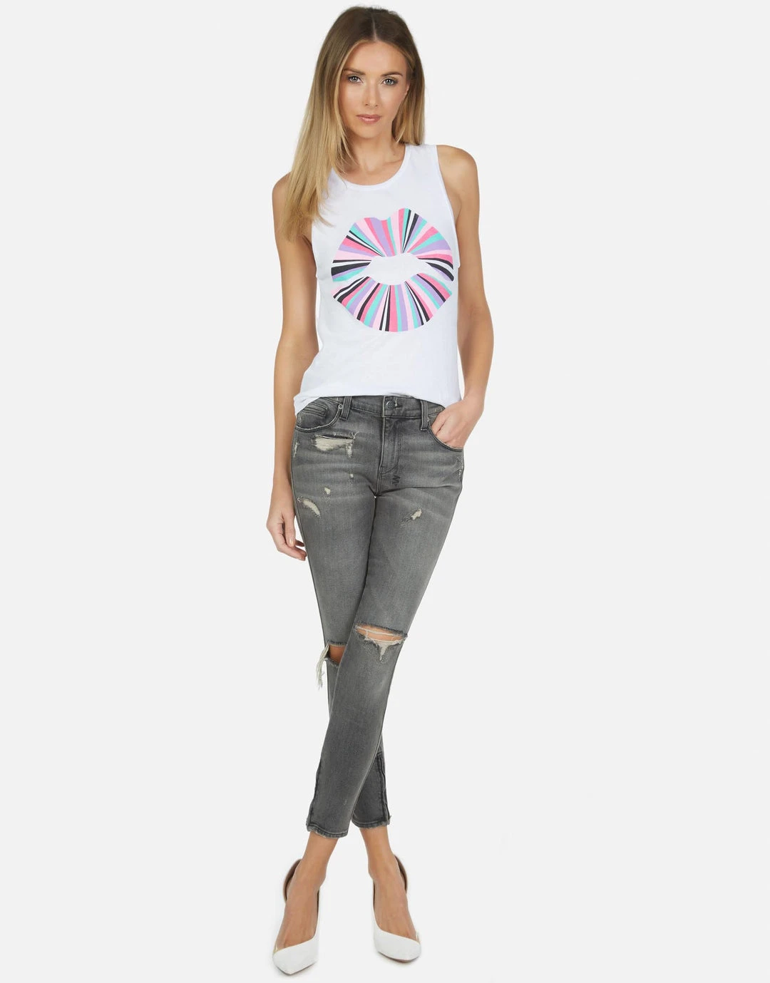 Rainbow Ray Peace Printed on Ultra Soft Lightweight Tee in White by Lauren Moshi.
