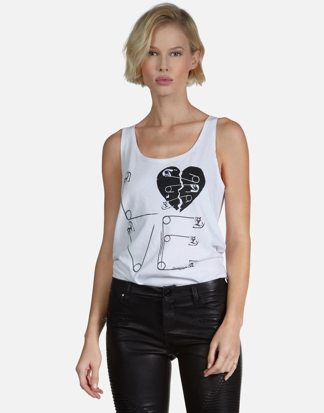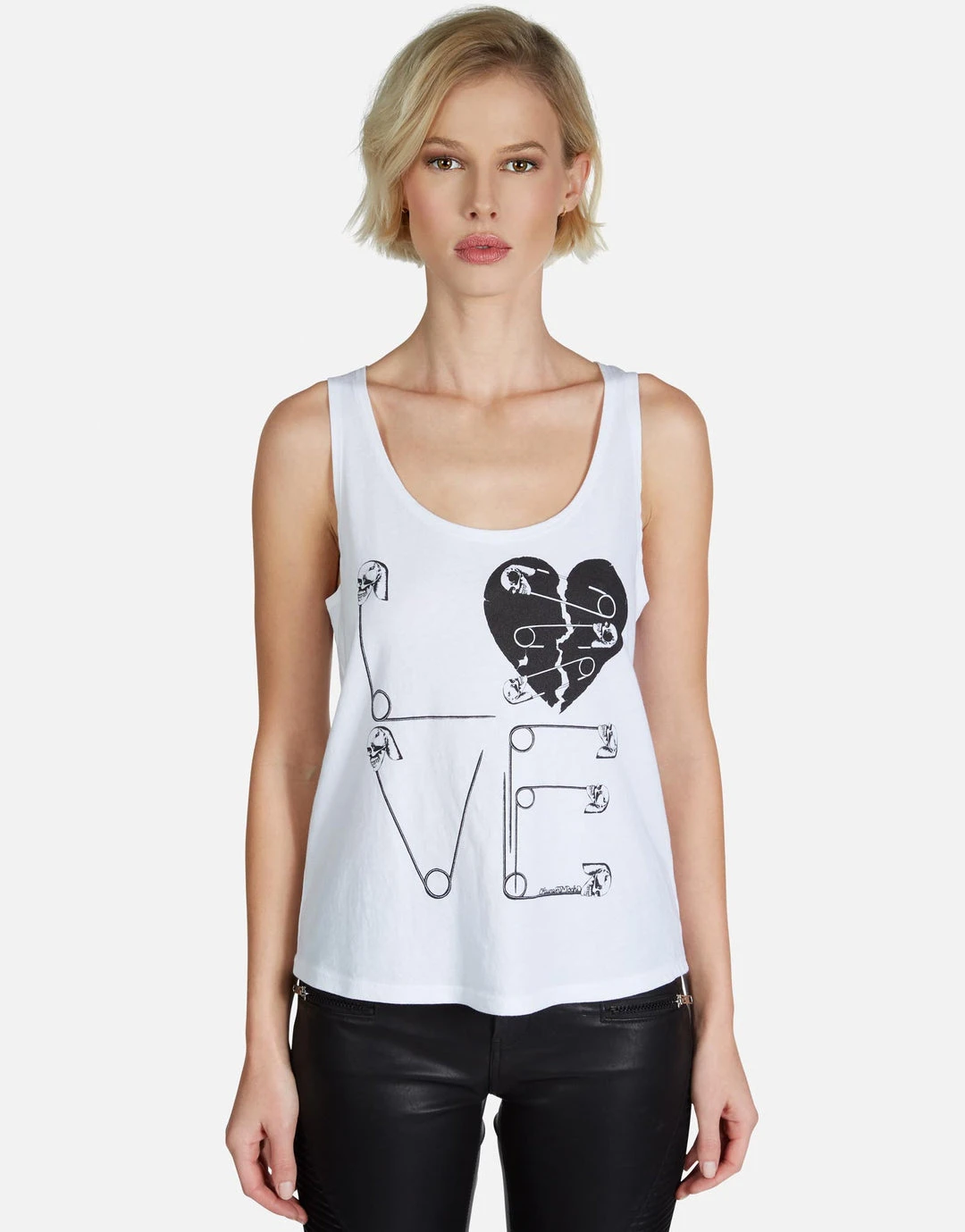 Safety Pin Love Heart Printed on Ultra Soft Lightweight Tank in White by Lauren Moshi.