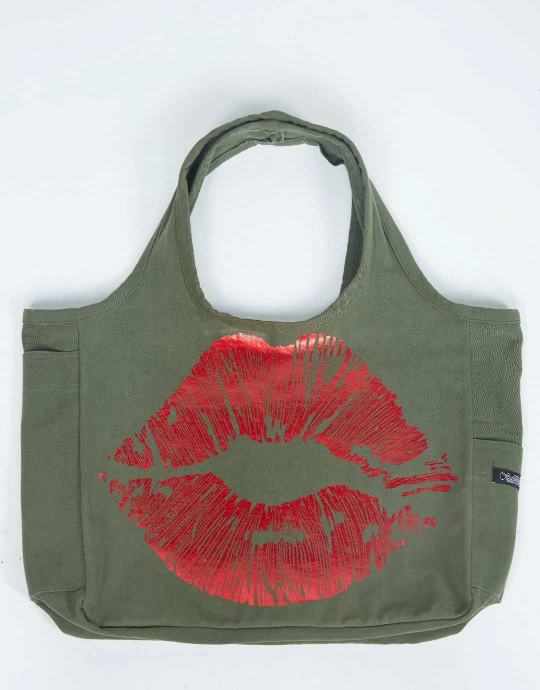 Red Foil Lip Printed on Canvas Tote Bag in Military by Lauren Moshi.
