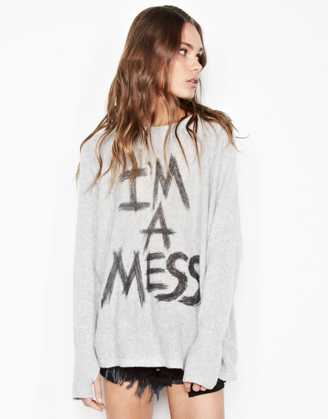 I’m A Mess Printed on Ultra Soft Lightweight Cashmere Sweater in Heather Grey by Lauren Moshi.