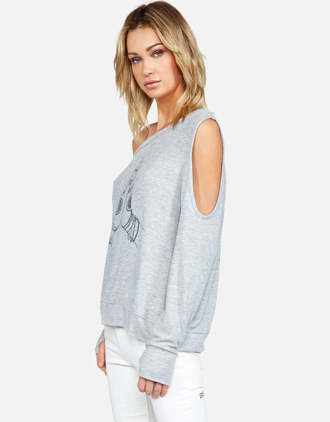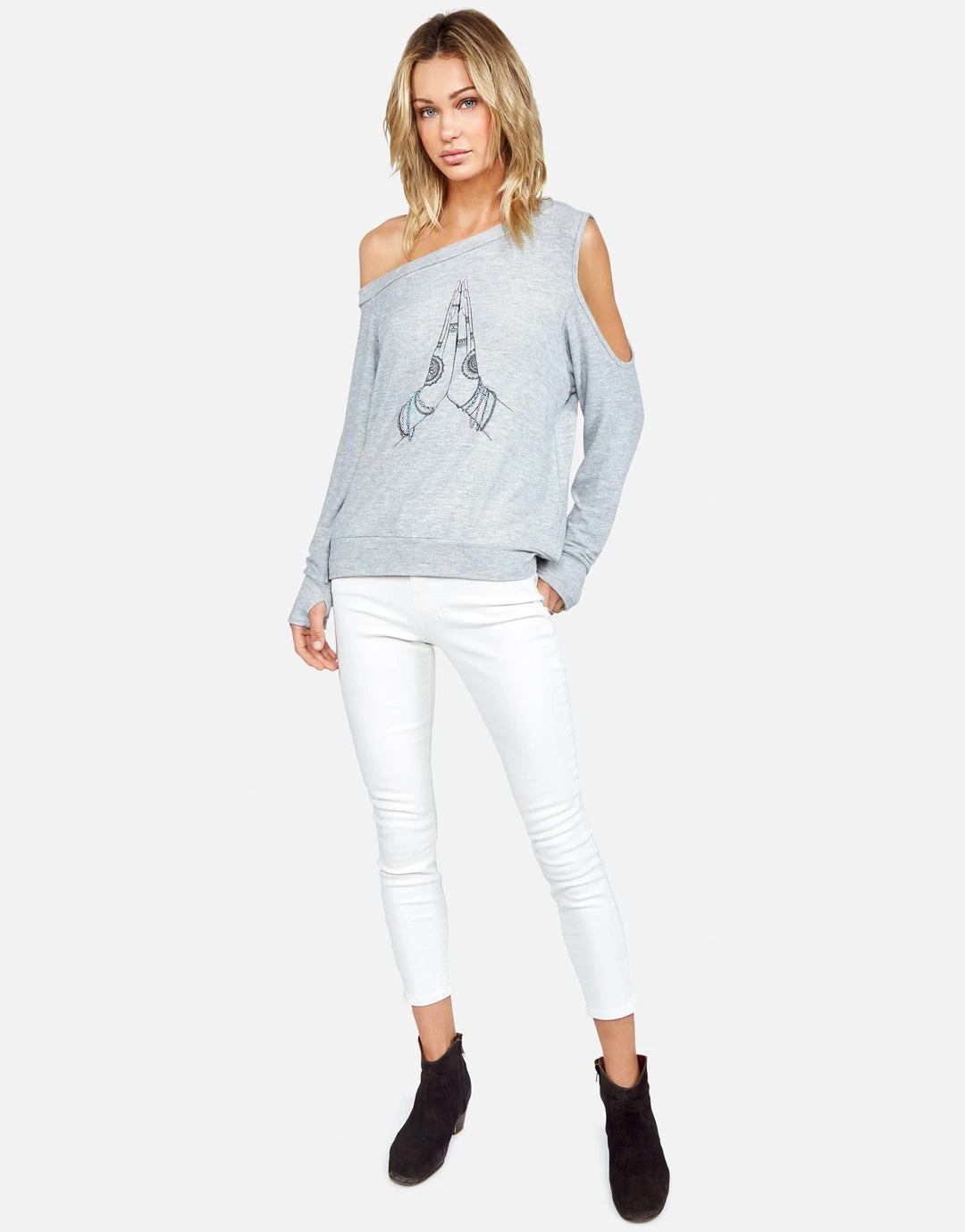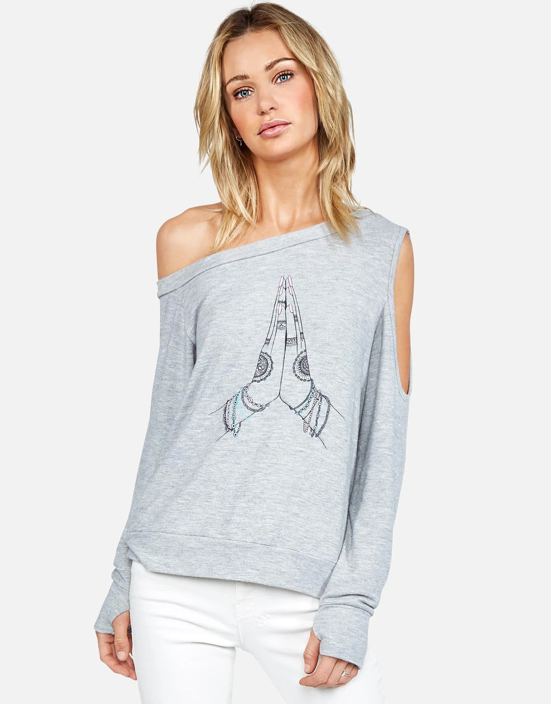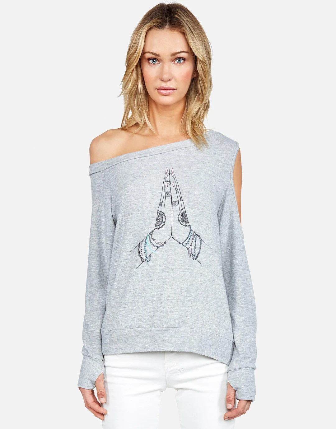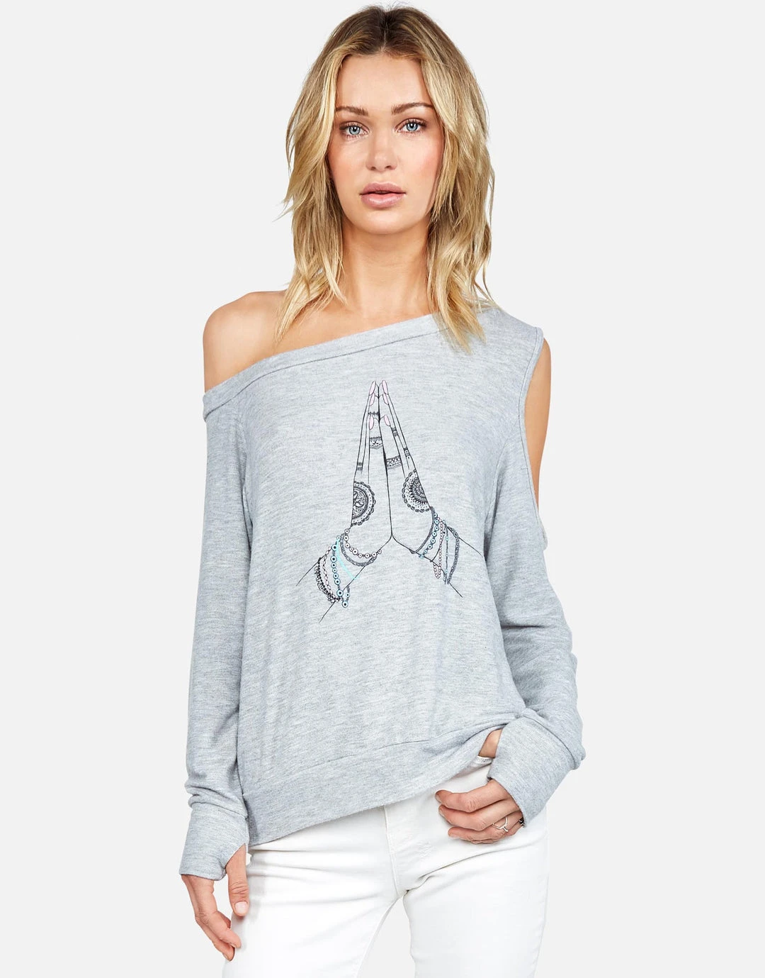 Prayer Hands Printed on Ultra Soft Lightweight Pullover in Heather Grey by Lauren Moshi.