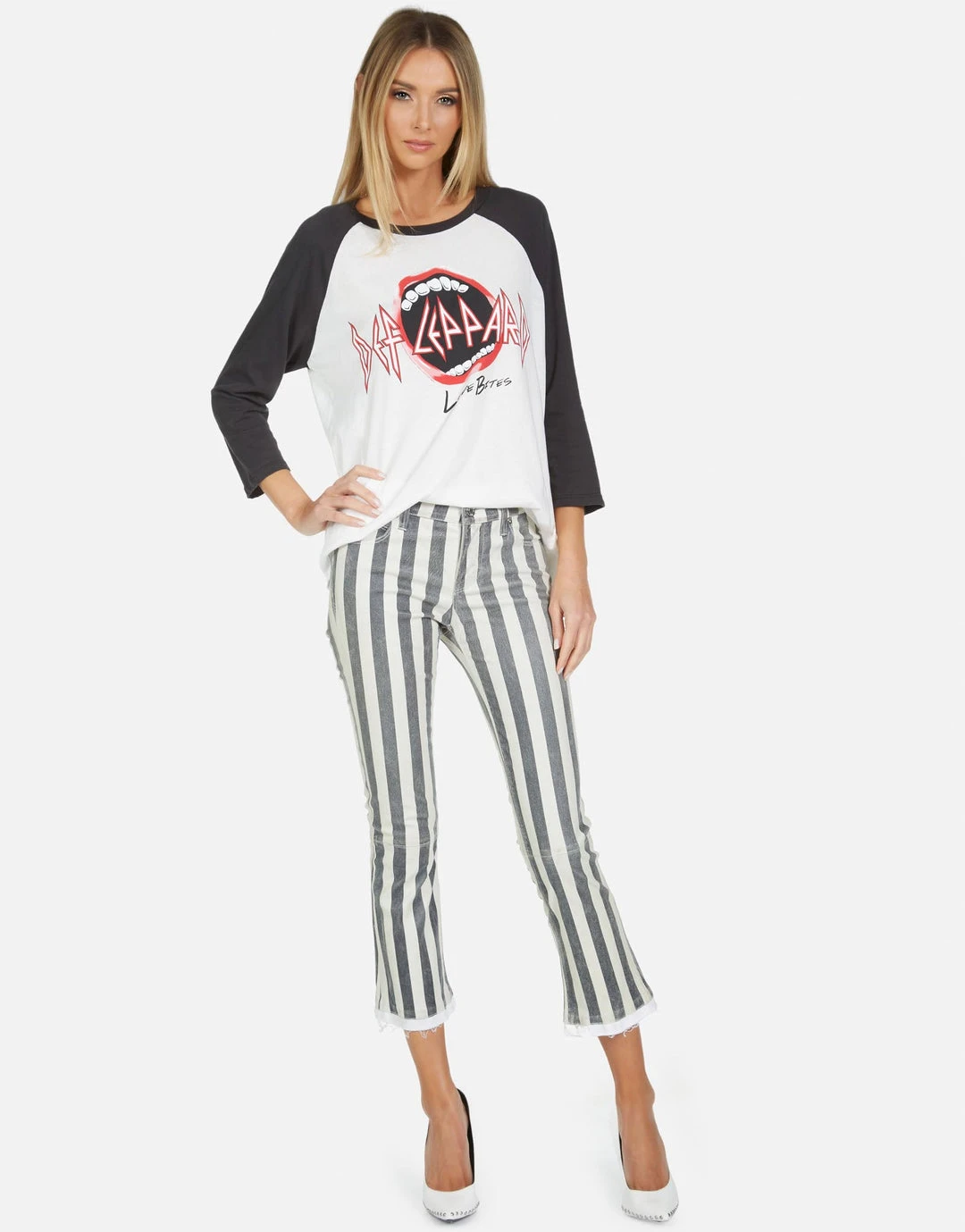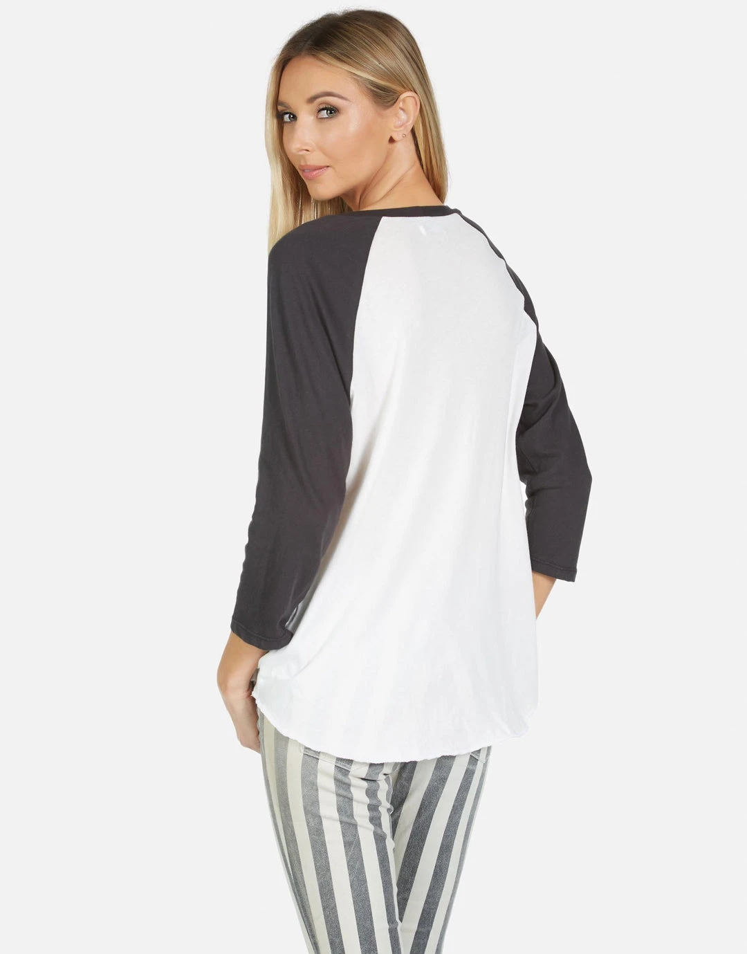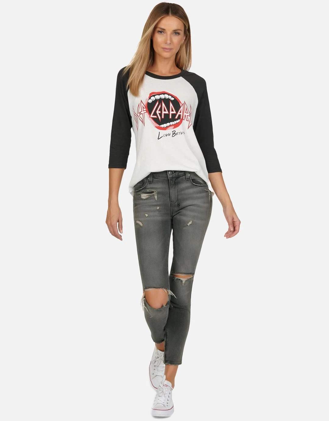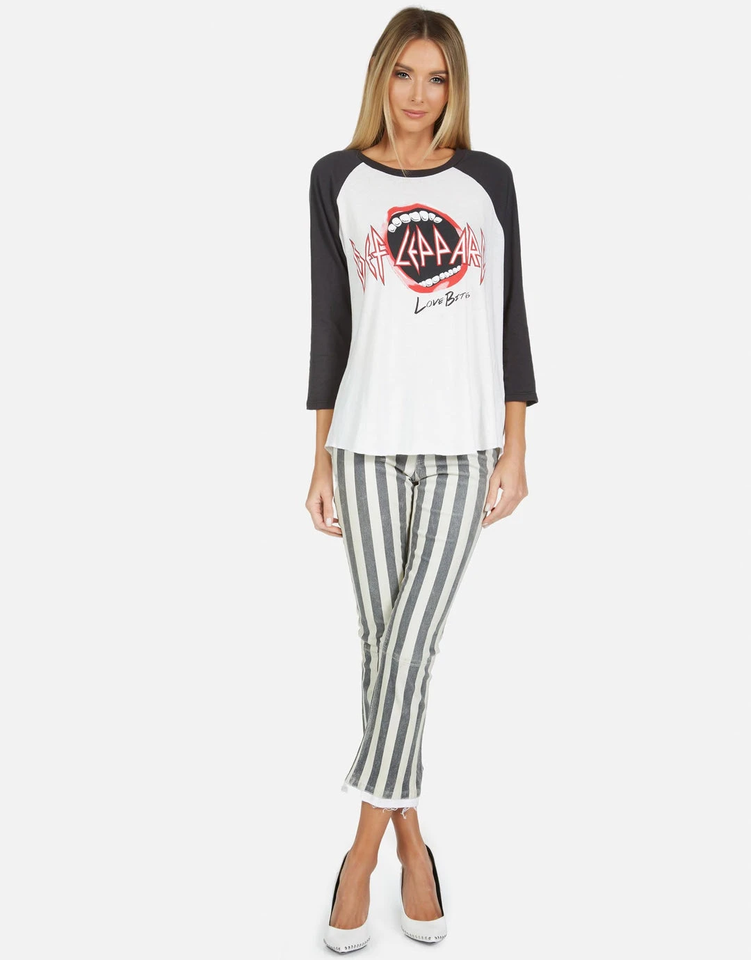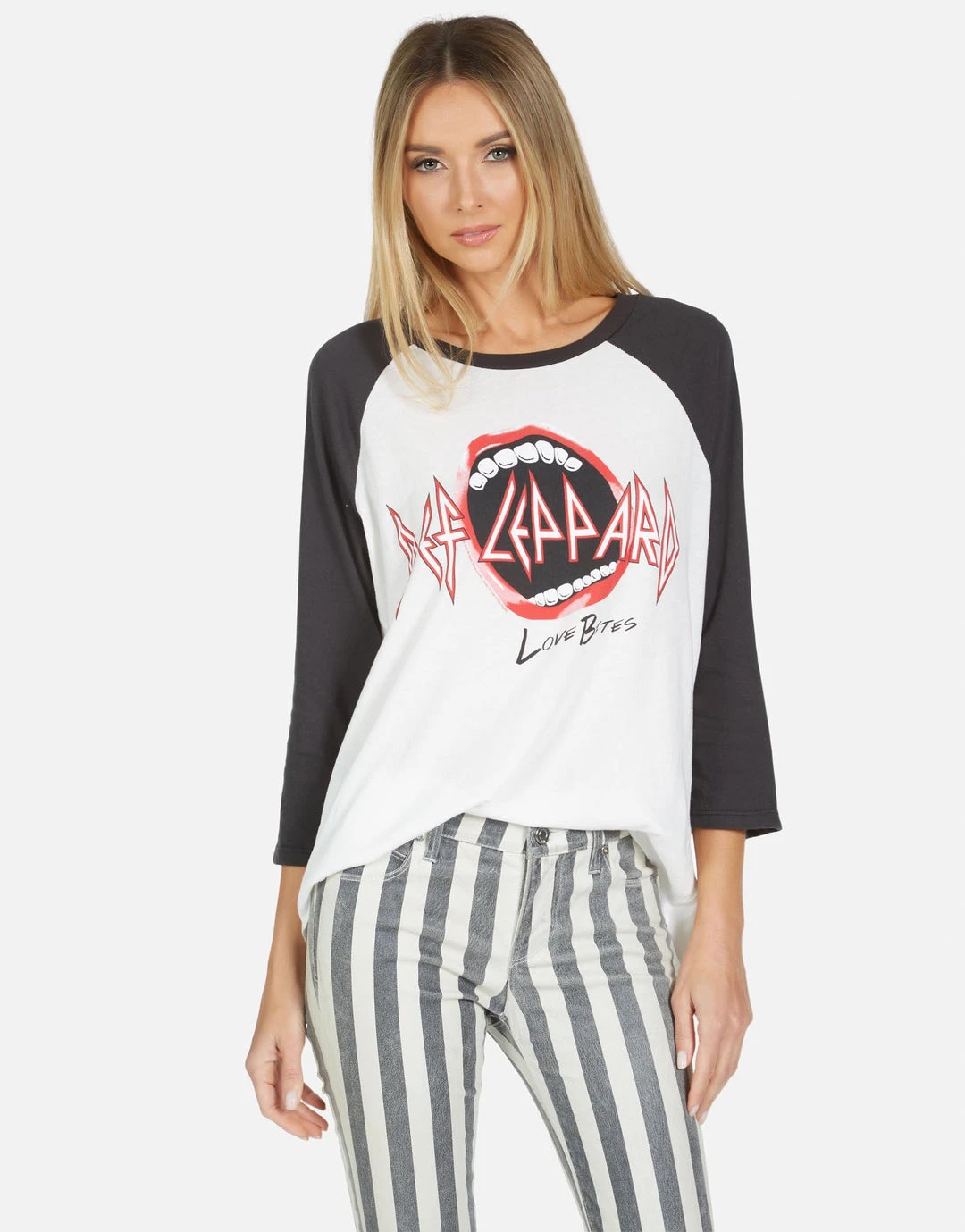Def Leppard Love Bites Printed on Ultra Soft Lightweight Baseball Tee in Milk / Onyx by Lauren Moshi.