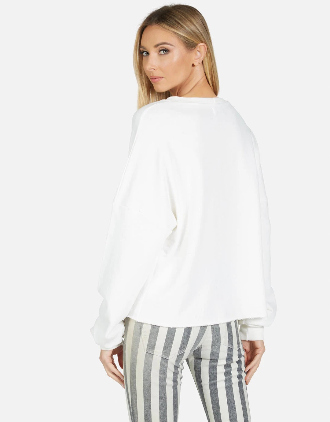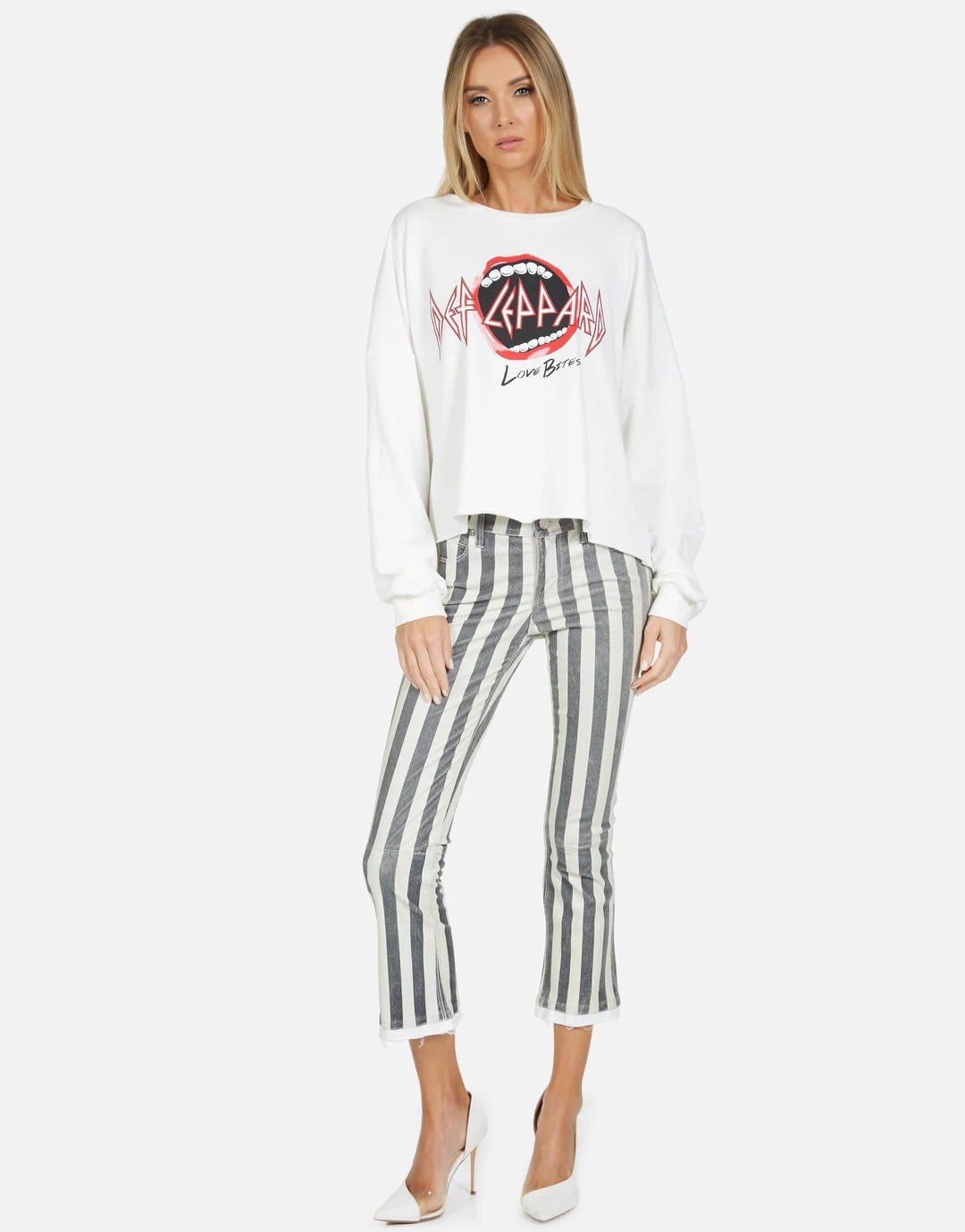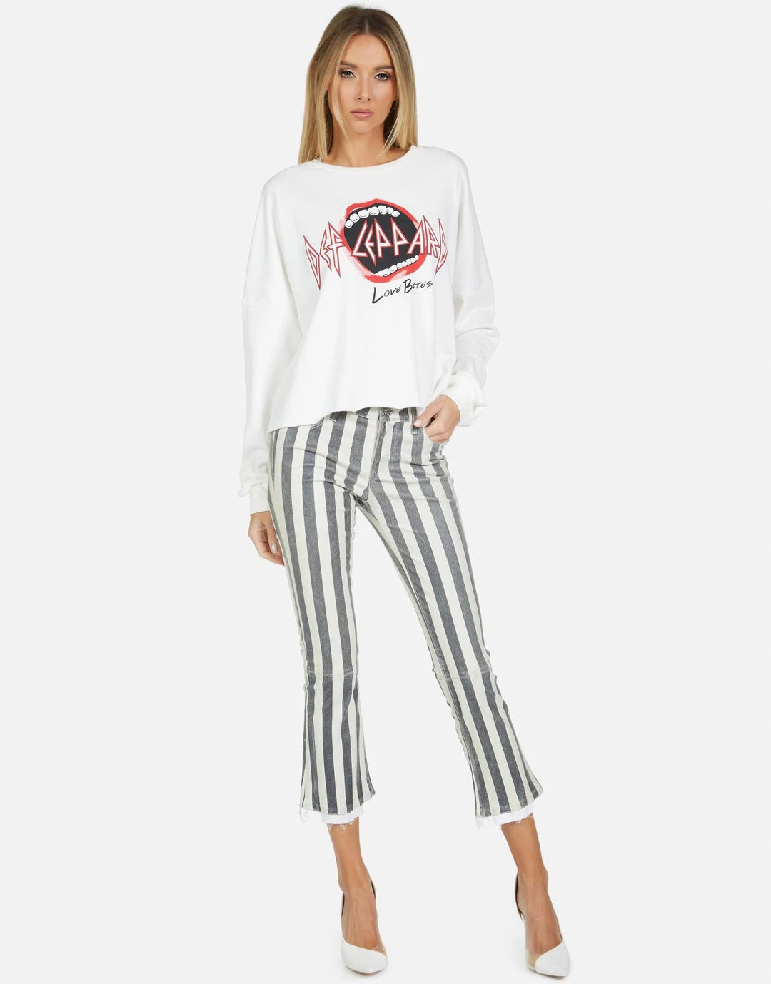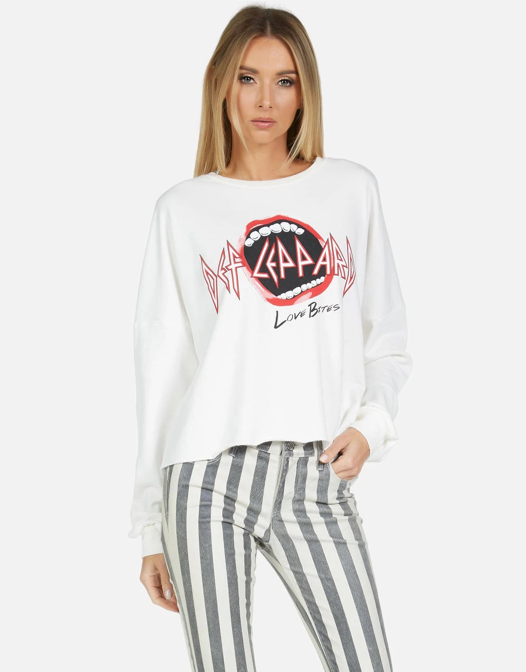 Def Leppard Love Bites Printed on Ultra Soft Lightweight Pullover in Milk by Lauren Moshi.
